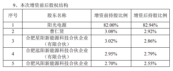 陽光電源12月6日公告,公司擬向控股子公司陽光新能源開發股份有限公司(以下簡稱“陽光新能源”)增資10億元,其中7892.6598萬元用于新增股本,9.21億元計入資本公積。 本次增資完成后陽光新能源的注冊資本由14.21億元增加至14.99億元,公司持有陽光新能源的股權比例由82.00%增加至82.94%,陽光新能源仍屬于公司合并報表范圍內的控股子公司。 鑒于公司董事長曹仁賢、副董事長兼高級副總裁顧亦磊、董事張許成、合肥月陽新能源科技合伙企業(以下簡稱“月陽合伙”)為陽光新能源股東,月陽合伙中合伙人有公司副總裁汪雷、副總裁彭超才、副總裁鄧德軍、副總裁兼董事會秘書陸陽、副總裁兼財務總監田帥,根據相關規定,此次公司向陽光新能源增資事項構成關聯交易。