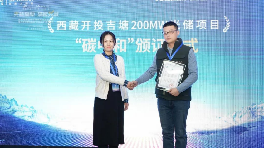 11 月 11 日,西藏昌都市察雅縣吉塘200MW 牧光互補復合型光伏發電項目順利并網發電,作為西藏地區 2023 年度單體裝機容量最大、首個全容量并網發電的保障性項目,該項目為加快建設藏東國家清潔能源基地作出了重要示范作用。 12月6日,晶澳科技和西藏開投在西藏昌都舉辦藏東高海拔地區清潔低碳發展論壇暨光伏極限挑戰專家團“世界屋脊”探尋之旅。論壇上,CTC國檢光伏檢驗認證院副院長李娜為西藏開投吉塘200MW光儲項目頒發“碳中和”證書,西藏開投吉雅光伏能源有限公司總經理徐凡上臺領證。 察雅縣吉塘鎮200MW光伏電站項目 “碳中和”證書頒授儀式 昌都市察雅縣吉塘200MW+160MWh儲能牧光互補復合型光伏項目,是2023年西藏自治區單體裝機容量最大、首個全容量并網的光伏發電項目。 項目全部采用晶澳科技DeepBlue 4.0 Pro 2465mm*1134mm行業標準大版型組件,該產品具有高功率高效率、高發電性能、高可靠性等特點,為項目高效安全穩定的發電提供保障。項目并網發電后,年均發電量可達3.4億千瓦時,每年可節約標煤約10.23萬噸,相當于每年減少二氧化碳排放約28.08萬噸。 該項目通過“板上發電,板下養殖”,將有效資源合理利用,實現一地多用。組件下植物的生長,為動物養殖提供了充足的飼料來源。同時,組件還可以起到遮蔽烈日及阻擋風沙的作用,避免惡劣天氣對周邊生態環境的破壞,可在一定程度上改善水土流失。該項目不僅帶來了生態的良性循環,更為農牧民提供了致富新出路,使傳統的農牧業煥發出新的生命力。截止10月底,項目共吸納農牧民就業1202人次,促進農牧民增收447.82萬元,為促進昌都市察雅縣本地經濟發展做出了積極貢獻。 下一篇: 又一次!京能國際與申能股份舉行會談