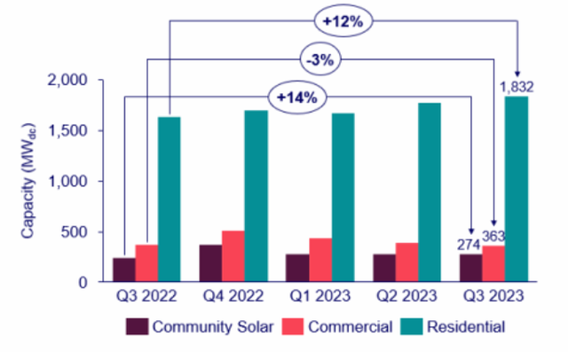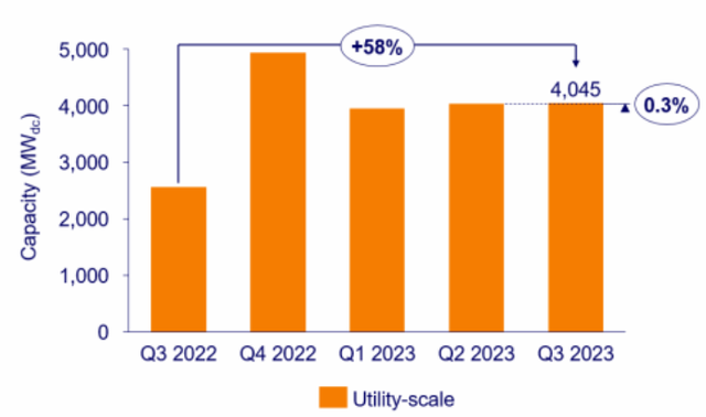 研究機構Wood Mackenzie公司和美國光伏產業協會(SEIA)日前發布了一份研究報告,分析了美國安裝的公用事業光伏系統裝機容量的最新情況。研究表明,美國在2023年第三季度安裝的公用事業規模光伏系統裝機容量將達到4GW,與2022年第三季度相比實現了58%的增長。 Wood Mackenzie公司預計,與2022年相比,美國2023年安裝的光伏系統裝機容量將增長55%,與上一季度的預期略有上調,預計將達到33GW。2023年將是迄今為止美國安裝光伏系統裝機容量最高的一年。不出所料,大部分增長來自公用事業規光伏市場,而該市場在2022年將首當其沖地受到光伏組件供應鏈的影響。 該報告指出,住宅光伏系統的價格同比增長3%,而商業光伏系統的價格同比下降2%。在公用事業光伏系統的定價方面,采用固定傾斜光伏支架的光伏系統和單軸跟蹤支架的光伏系統價格同比增長了6%和5%。 圖1 美國從2022年第三季度到2022年第三季度安裝的分布式光伏系統裝機容量(MW) 圖2 美國從2022年第三季度到2022年第三季度安裝的電網規模光伏系統裝機容量(MW) 報告指出,在美國能源結構中,在2023年前三個季度,光伏發電量占美國電網新增發電量的48%。美國目前累計運行的470萬套光伏系統的總裝機容量為161GW。 住宅光伏領域在2023年第三季度創造了最新的季度記錄,該季度安裝的21萬多個光伏項目的總裝機容量為1.8 GW,與去年同期相比增長了12%。報告發現,由于在今年4月轉向凈計費之前的銷售積壓相互關聯,住宅光伏系統的安裝量正在激增。 另一方面,在2023年第三季度安裝的商業光伏系統的裝機容量為363MW,與2022年第三季度相比下降了3%,與2023年第二季度相比下降了6%。2023年第三季度安裝的社區光伏系統的裝機容量為274MW,與2022年第三季度相比增長14%,與2023年第二季度持平。報告描述了一些主要市場由于并網、許可、協助等挑戰而停滯不前的情況,這些挑戰仍然存在。 在2023年第三季度安裝的公用事業規模光伏系統的裝機容量達到4GW以上,與2022年第三季度相比增長58%,當時供應鏈限制嚴重抑制了光伏系統的安裝,與2023年第二季度持平。而美國在2022年第三季度安裝的公用事業規模光伏系統的裝機容量已經接近2022年全年的裝機容量,這主要是由于供應鏈限制在2023年得以緩解。
