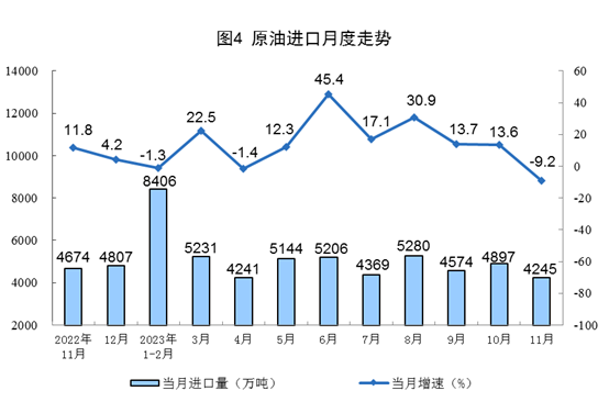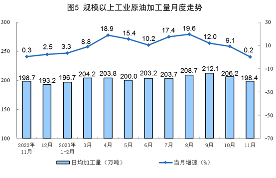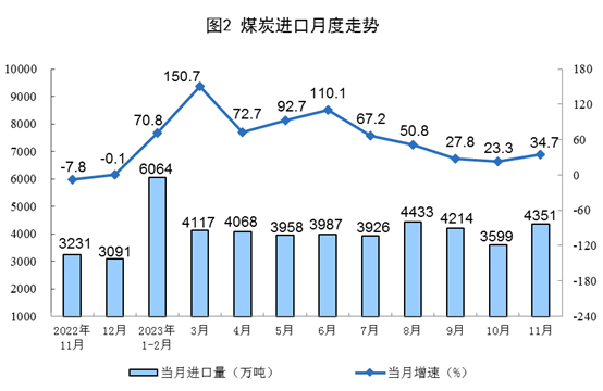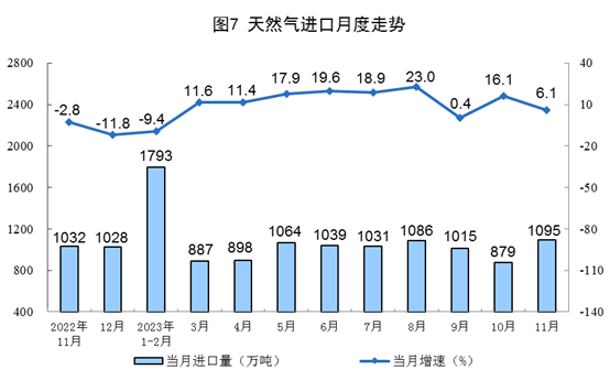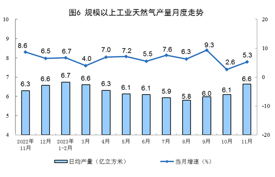 11月份,規模以上工業主要能源產品生產繼續保持同比增長。其中,火電、太陽能發電增速加快,水電增速回落,風電由降轉增,核電降幅擴大。其中,火電增長6.3%,增速比10月份加快2.3個百分點;水電增長5.4%,增速比10月份回落16.4個百分點;核電下降2.4%,降幅比10月份擴大2.2個百分點;風電增長26.6%,10月份為下降13.1%;太陽能發電增長35.4%,增速比10月份加快20.1個百分點。 一、原煤、原油和天然氣生產及相關情況 原煤生產有所加快,進口較快增長。11月份,生產原煤4.1億噸,同比增長4.6%,增速比10月份加快0.8個百分點,日均產量1379.9萬噸。進口煤炭4351萬噸,同比增長34.7%,增速比10月份加快11.4個百分點。 1—11月份,生產原煤42.4億噸,同比增長2.9%。進口煤炭4.3億噸,同比增長62.8%。 原油生產增速加快,進口增速由增轉降。11月份,生產原油1720萬噸,同比增長2.6%,增速比10月份加快2.1個百分點,日均產量57.3萬噸。進口原油4245萬噸,同比下降9.2%,10月份為增長13.6%。 1—11月份,生產原油19125萬噸,同比增長1.8%。進口原油51565萬噸,同比增長12.1%。 原油加工保持增長。11月份,加工原油5953萬噸,同比增長0.2%,增速比10月份回落8.9個百分點,日均加工原油198.4萬噸。1—11月份,加工原油67622萬噸,同比增長10.1%。 天然氣生產增速加快,進口穩定增長。11月份,生產天然氣199億立方米,同比增長5.3%,增速比10月份加快2.7個百分點,日均產量6.6億立方米。進口天然氣1095萬噸,同比增長6.1%,增速比10月份回落10.0個百分點。 1—11月份,生產天然氣2096億立方米,同比增長6.0%。進口天然氣10740萬噸,同比增長8.5%。 二、電力生產情況 電力生產增速加快。11月份,發電量7310億千瓦時,同比增長8.4%,增速比10月份加快3.2個百分點,日均發電243.7億千瓦時。1—11月份,發電量80732億千瓦時,同比增長4.8%。 分品種看,11月份,火電、太陽能發電增速加快,水電增速回落,風電由降轉增,核電降幅擴大。其中,火電增長6.3%,增速比10月份加快2.3個百分點;水電增長5.4%,增速比10月份回落16.4個百分點;核電下降2.4%,降幅比10月份擴大2.2個百分點;風電增長26.6%,10月份為下降13.1%;太陽能發電增長35.4%,增速比10月份加快20.1個百分點。 附注 1.指標解釋 日均產品產量:是以當月公布的規模以上工業企業總產量除以該月日歷天數計算得到。 2.統計范圍 報告中的產量數據統計口徑均為規模以上工業,其統計范圍為年主營業務收入2000萬元及以上的工業企業。 由于規模以上工業企業范圍每年發生變化,為保證本年數據與上年可比,計算產品產量等各項指標同比增長速度所采用的同期數與本期的企業統計范圍相一致,和上年公布的數據存在口徑差異。 3.數據來源 進口數據來源于海關總署,其中2023年11月份數據為快訊數據。 4.天然氣單位換算關系:1噸約等于1380立方米。 下一篇: 中國電建:1-11月主要經營情況