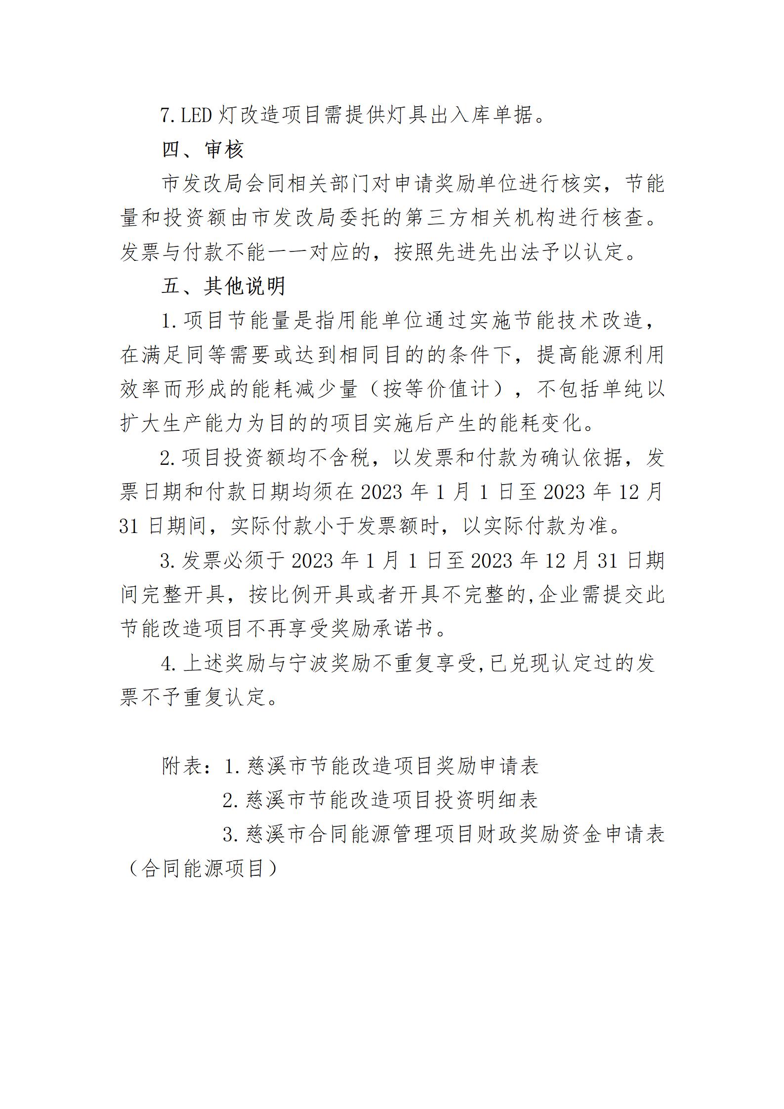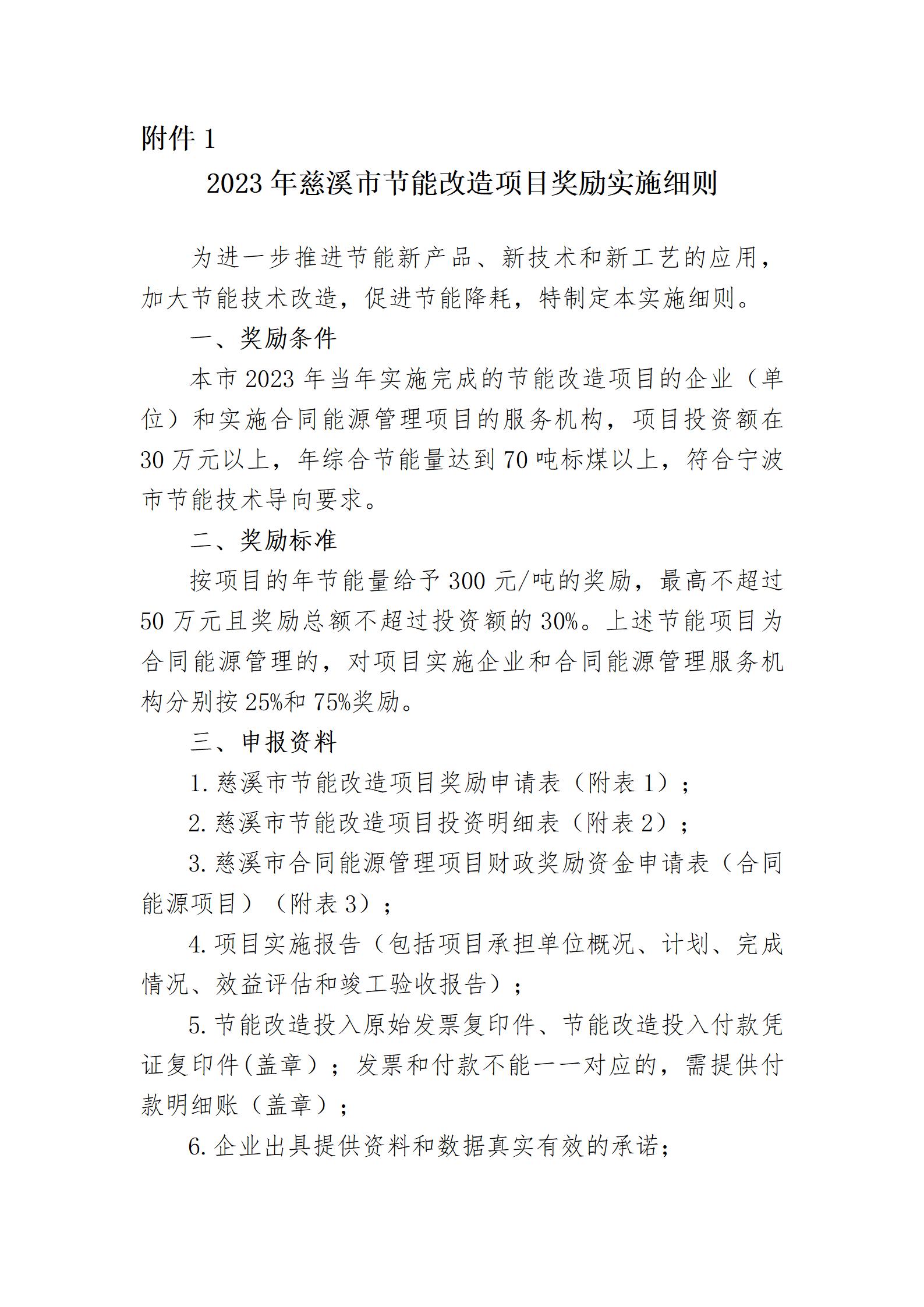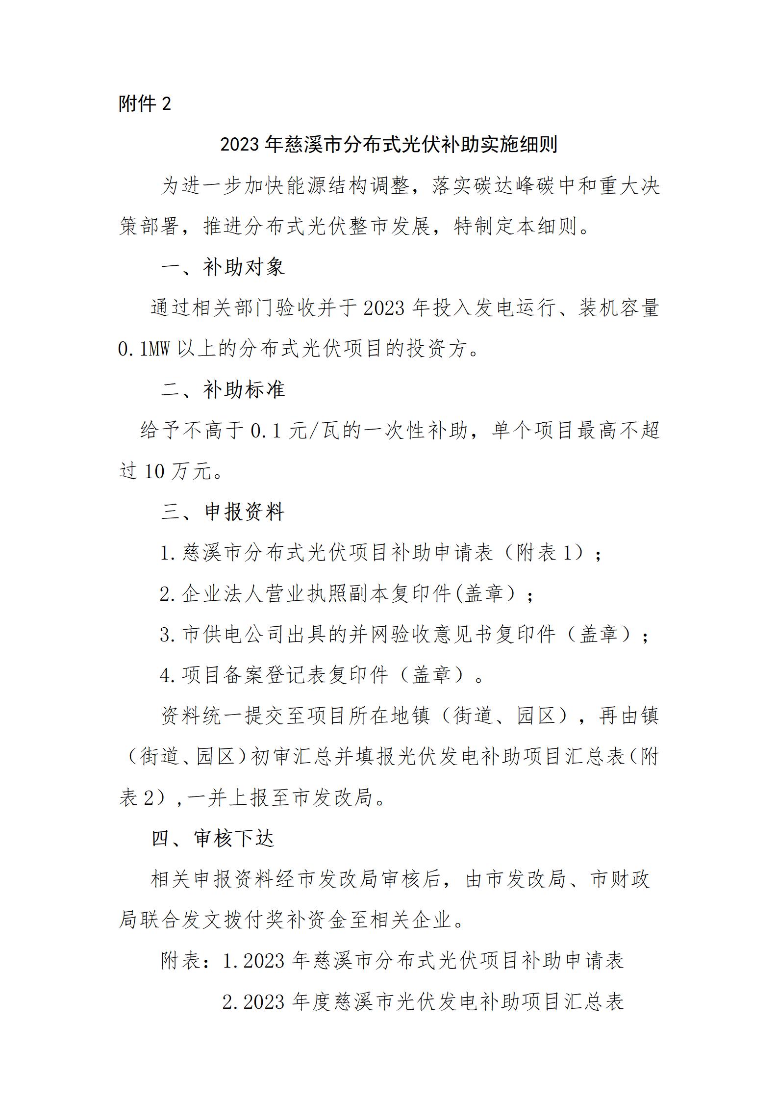 12月18日,浙江慈溪市人民政府關于印發2023年慈溪市節能降耗獎勵補助實施細則的通知。根據通知,申報內容包括節能改造項目獎勵、分布式光伏項目補助、寧波市級及以上節能企業獎勵三項內容。 其中,2023年慈溪市分布式光伏補助實施細則明確:補助對象對象為通過相關部門驗收并于2023年投入發電運行、裝機容量0.1MW以上的分布式光伏項目的投資方。補助標準為給予不高于0.1元/瓦的一次性補助,單個項目最高不超過10萬元。 全文見下: 關于印發2023年慈溪市節能降耗獎勵補助實施細則的通知 各鎮人民政府、各街道辦事處,市住建局、市交通運輸局、市機關事務管理局、市商務局、市文廣旅體局,各產業平臺: 根據《慈溪市人民政府辦公室關于印發2023年慈溪市推進產業高質量發展的政策意見的通知》(慈政辦發〔2023〕84號)和《寧波市節能專項資金管理辦法》(甬能源節能〔2019〕140號)等文件精神,市發改局會同市財政局制定了《2023年慈溪市節能降耗獎勵補助實施細則》,現予以印發,請貫徹執行。 一、申報內容及程序 (一)申報內容 節能改造項目獎勵、分布式光伏項目補助、寧波市級及以上節能企業獎勵三項內容。 (二)申報程序 由市發改局發布申報通知,符合條件的申報單位,在規定時間內向所在鎮(街道)、產業平臺提交各細則中所要求的申報材料,經所在地鎮(街道)、產業平臺初審同意確認蓋章后,上報至市發改局。提交申報材料要求紙質一式二份,電子一份。 二、審核 市發改局會同相關部門對申請獎勵補助單位進行核實,部分項目委托技術專家對項目進行評估查驗,委托第三方會計師事務所進行項目財務核查。發票與付款不能一一對應的,原則上按照先進先出法予以認定。 三、兌現 對審核后的獎勵補助資金,經公示無異議后,市發改局會同市財政局對符合獎補條件的單位下達獎補資金。獎補資金原則上通過寧波市“甬易辦”政策平臺進行兌付。 四、有關范圍界定 本實施細則中所提的“以上”“以下”“不高于”“不超過”“超過”均含本數。 五、其他 1.委托節能服務機構協助節能主管部門實施節能監察、能效診斷、事中事后檢查、節能量測試的費用在節能降耗專項補助資金中列支。 2.有關否決和差別化政策參照執行《慈溪市人民政府辦公室關于印發2023年慈溪市推進產業高質量發展的政策意見的通知》文件(慈政辦發〔2023〕84號)。 3.本實施細則的實施期限與慈政辦發〔2023〕84號文件一致。細則內容由市發改局和市財政局負責解釋。 附件:1.2023年慈溪市節能改造項目獎勵實施細則 2.2023年慈溪市分布式光伏項目補助實施細則 3.2023年慈溪市節能先進企業獎勵實施細則 慈溪市發展和改革局 慈溪市財政局 2023年12月11日