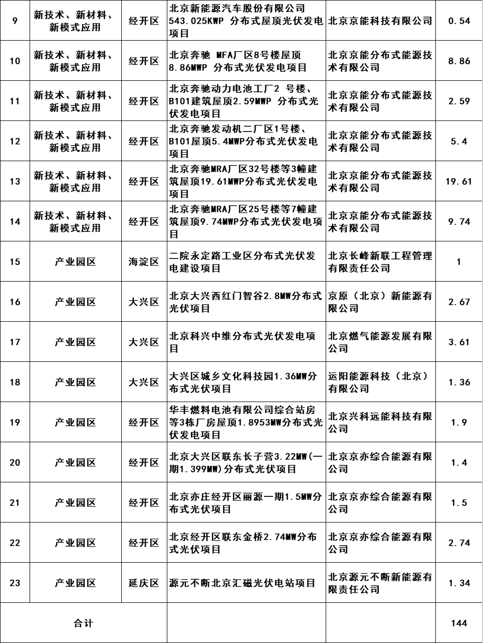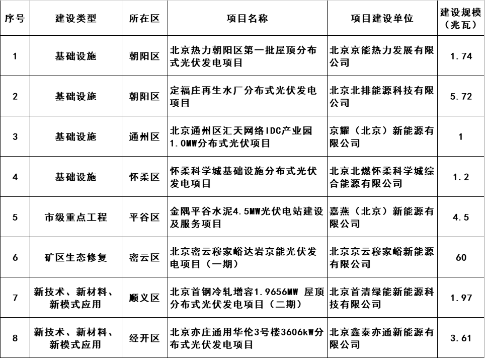 12月19日,北京市發展和改革委員會關于公示擬納入市政府固定資產投資支持光伏發電項目清單(第二批)的通知,共計23個光伏項目,建設規模達到144MW。 原文如下: 關于公示擬納入市政府固定資產投資支持光伏發電項目清單(第二批)的通知 京發改〔2023〕1825號 各有關單位: 按照《北京市發展和改革委員會等四部門關于印發推進光伏發電高質量發展支持政策的通知》(京發改規〔2023〕4號)、《關于公開征集市政府固定資產投資支持光伏發電項目的通知》(京發改〔2023〕1653號)要求,經公開征集并評估,現對擬納入市政府固定資產投資支持光伏發電項目清單(第二批,詳見附件)進行公示,公示時間為2023年12月18日—2023年12月22日(5個工作日)。如有異議,可通過電話、傳真等方式進行反饋。 特此通知。 附件:擬納入市政府固定資產投資支持光伏發電項目清單(第二批) 北京市發展和改革委員會 2023年12月18日 (聯系人:新能源處 倪仡; 聯系電話:55590473; 傳真:55590874) 附件:擬納入市政府固定資產投資支持光伏發電項目清單(第二批)