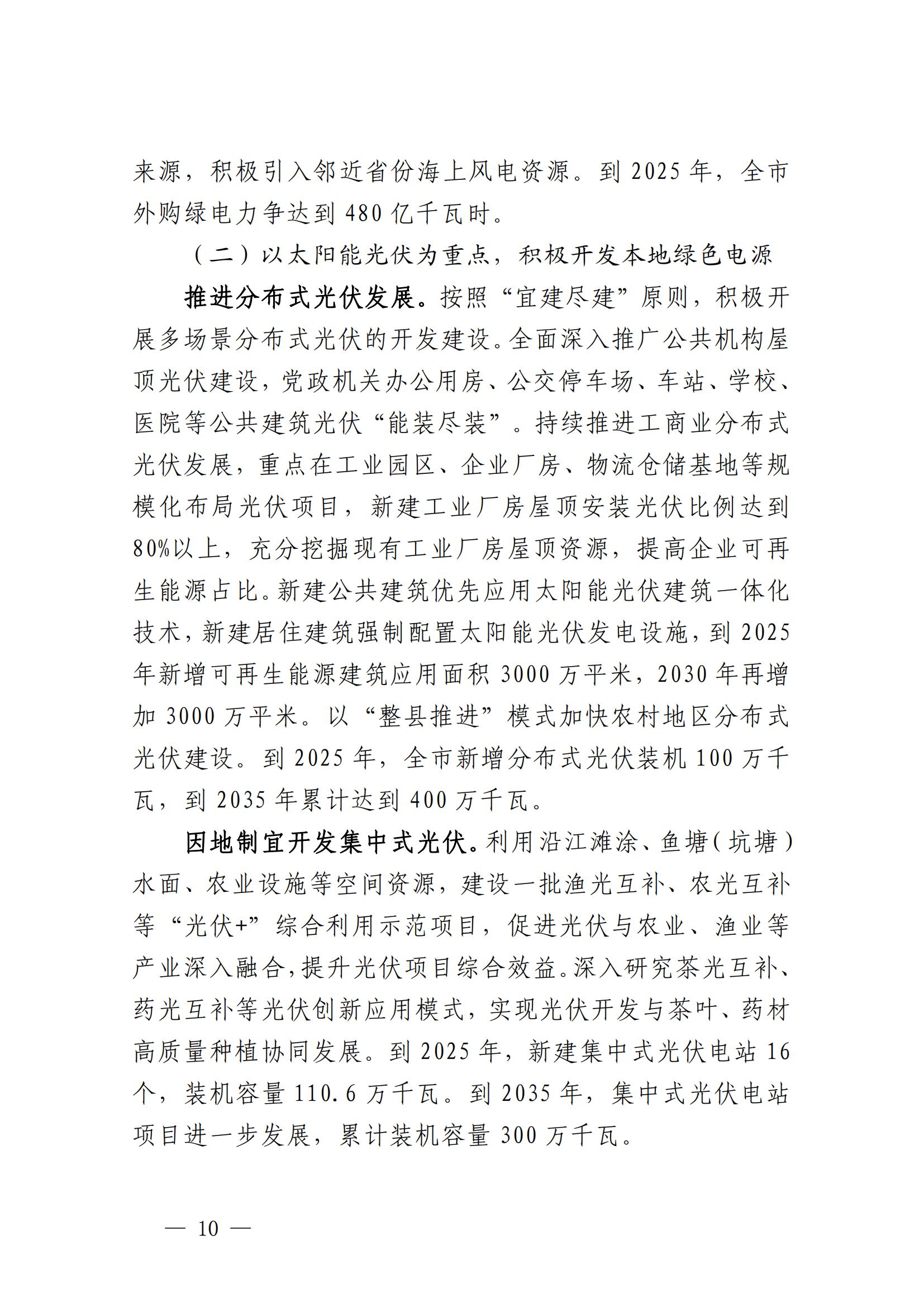 12月20日(ri),杭州市(shi)發(fa)(fa)(fa)展(zhan)和改革委(wei)發(fa)(fa)(fa)布(bu)關于公開(kai)征(zheng)求(qiu)《碳(tan)達(da)峰碳(tan)中和背景下杭州新能(neng)源(yuan)(儲(chu)能(neng))發(fa)(fa)(fa)展(zhan)戰略規劃(征(zheng)求(qiu)意見稿)》意見的通知(zhi),通知(zhi)指出(chu),推(tui)進(jin)分(fen)(fen)布(bu)式光(guang)伏(fu)(fu)(fu)發(fa)(fa)(fa)展(zhan)。按(an)照“宜建(jian)(jian)盡建(jian)(jian)”原(yuan)則,積(ji)極開(kai)展(zhan)多場景分(fen)(fen)布(bu)式光(guang)伏(fu)(fu)(fu)的開(kai)發(fa)(fa)(fa)建(jian)(jian)設(she)。全面深入推(tui)廣公共機構屋頂光(guang)伏(fu)(fu)(fu)建(jian)(jian)設(she),黨政機關辦(ban)公用(yong)(yong)房(fang)、公交(jiao)停(ting)車場、車站、學(xue)校、醫院等公共建(jian)(jian)筑光(guang)伏(fu)(fu)(fu)“能(neng)裝盡裝”。持續(xu)推(tui)進(jin)工(gong)(gong)(gong)商業(ye)分(fen)(fen)布(bu)式光(guang)伏(fu)(fu)(fu)發(fa)(fa)(fa)展(zhan),重(zhong)點(dian)在工(gong)(gong)(gong)業(ye)園(yuan)區、企(qi)業(ye)廠(chang)房(fang)、物流倉(cang)儲(chu)基(ji)地等規模化布(bu)局光(guang)伏(fu)(fu)(fu)項目(mu),新建(jian)(jian)工(gong)(gong)(gong)業(ye)廠(chang)房(fang)屋頂安裝光(guang)伏(fu)(fu)(fu)比例達(da)到(dao)80%以上,充(chong)分(fen)(fen)挖掘(jue)現(xian)有(you)工(gong)(gong)(gong)業(ye)廠(chang)房(fang)屋頂資源(yuan),提高企(qi)業(ye)可再(zai)生(sheng)能(neng)源(yuan)占比。新建(jian)(jian)公共建(jian)(jian)筑優先應(ying)用(yong)(yong)太陽(yang)能(neng)光(guang)伏(fu)(fu)(fu)建(jian)(jian)筑一(yi)體化技術,新建(jian)(jian)居住建(jian)(jian)筑強制配(pei)置太陽(yang)能(neng)光(guang)伏(fu)(fu)(fu)發(fa)(fa)(fa)電設(she)施,到(dao)2025年新增可再(zai)生(sheng)能(neng)源(yuan)建(jian)(jian)筑應(ying)用(yong)(yong)面積(ji)3000萬(wan)平(ping)米(mi),2030年再(zai)增加(jia)3000萬(wan)平(ping)米(mi)。以“整縣(xian)推(tui)進(jin)”模式加(jia)快農村(cun)地區分(fen)(fen)布(bu)式光(guang)伏(fu)(fu)(fu)建(jian)(jian)設(she)。到(dao)2025年,全市(shi)新增分(fen)(fen)布(bu)式光(guang)伏(fu)(fu)(fu)裝機100萬(wan)千瓦(wa),到(dao)2035年累計達(da)到(dao)400萬(wan)千瓦(wa)。 因地(di)制宜開發(fa)(fa)集(ji)中(zhong)式(shi)光(guang)(guang)伏(fu)(fu)(fu)。利用(yong)沿(yan)江灘涂、魚塘(坑塘)水面(mian)、農業(ye)(ye)設施等(deng)空間(jian)資源,建設一批漁光(guang)(guang)互(hu)補(bu)、農光(guang)(guang)互(hu)補(bu)等(deng)“光(guang)(guang)伏(fu)(fu)(fu)+”綜(zong)合(he)利用(yong)示(shi)范(fan)項目,促進光(guang)(guang)伏(fu)(fu)(fu)與(yu)農業(ye)(ye)、漁業(ye)(ye)等(deng)產業(ye)(ye)深入(ru)(ru)融合(he),提升光(guang)(guang)伏(fu)(fu)(fu)項目綜(zong)合(he)效益。深入(ru)(ru)研究茶(cha)光(guang)(guang)互(hu)補(bu)、藥光(guang)(guang)互(hu)補(bu)等(deng)光(guang)(guang)伏(fu)(fu)(fu)創新(xin)應用(yong)模式(shi),實現光(guang)(guang)伏(fu)(fu)(fu)開發(fa)(fa)與(yu)茶(cha)葉、藥材高質量(liang)種植協同(tong)發(fa)(fa)展。到2025年(nian),新(xin)建集(ji)中(zhong)式(shi)光(guang)(guang)伏(fu)(fu)(fu)電站16個,裝機容量(liang)110.6萬(wan)千瓦。到2035年(nian),集(ji)中(zhong)式(shi)光(guang)(guang)伏(fu)(fu)(fu)電站項目進一步發(fa)(fa)展,累計裝機容量(liang)300萬(wan)千瓦。 原文如下: 關于公開征求《碳達峰碳中和背景下杭州新能源(儲能)發展戰略規劃(征求意見稿)》意見的通知 為深入踐行碳達峰碳中和戰略目標,高質量建設綠色低碳、安全高效的現代能源體系,推動杭州市新能源、儲能科學有序發展,杭州市發改委組織編制了《碳達峰碳中和背景下杭州新能源(儲能)發展戰略規劃(征求意見稿)》,現向社會公開征求意見。征求時間為12月20日至12月27日。 聯系(xi)人:盧孔(kong)裕(yu) 電話:0571-85251889 郵箱:kylu@zju.edu.cn 地址:杭州市解(jie)放東路18號(hao)市民中心B座706室 杭州市發(fa)展和改革委(wei)員會(hui) 2023年12月20日