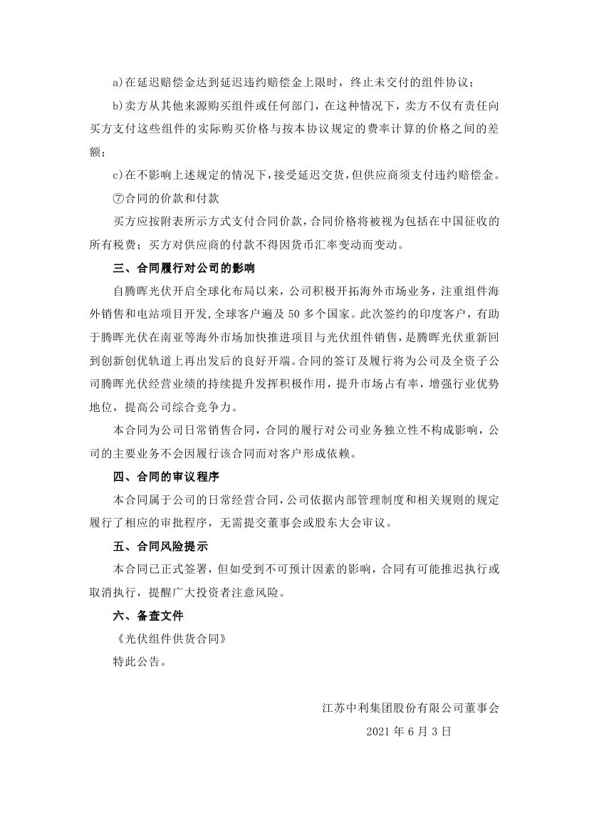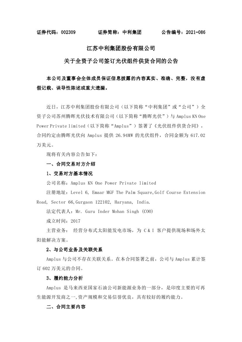 6月3日中利集團公告,公司全資子公司蘇州騰暉光伏技術有限公司與Amplus KN One Power Private limited簽署了《光伏組件供貨合同》,合同約定由騰暉光伏向Amplus提供26.94MW的光伏組件,合同金額為617.02萬美元。