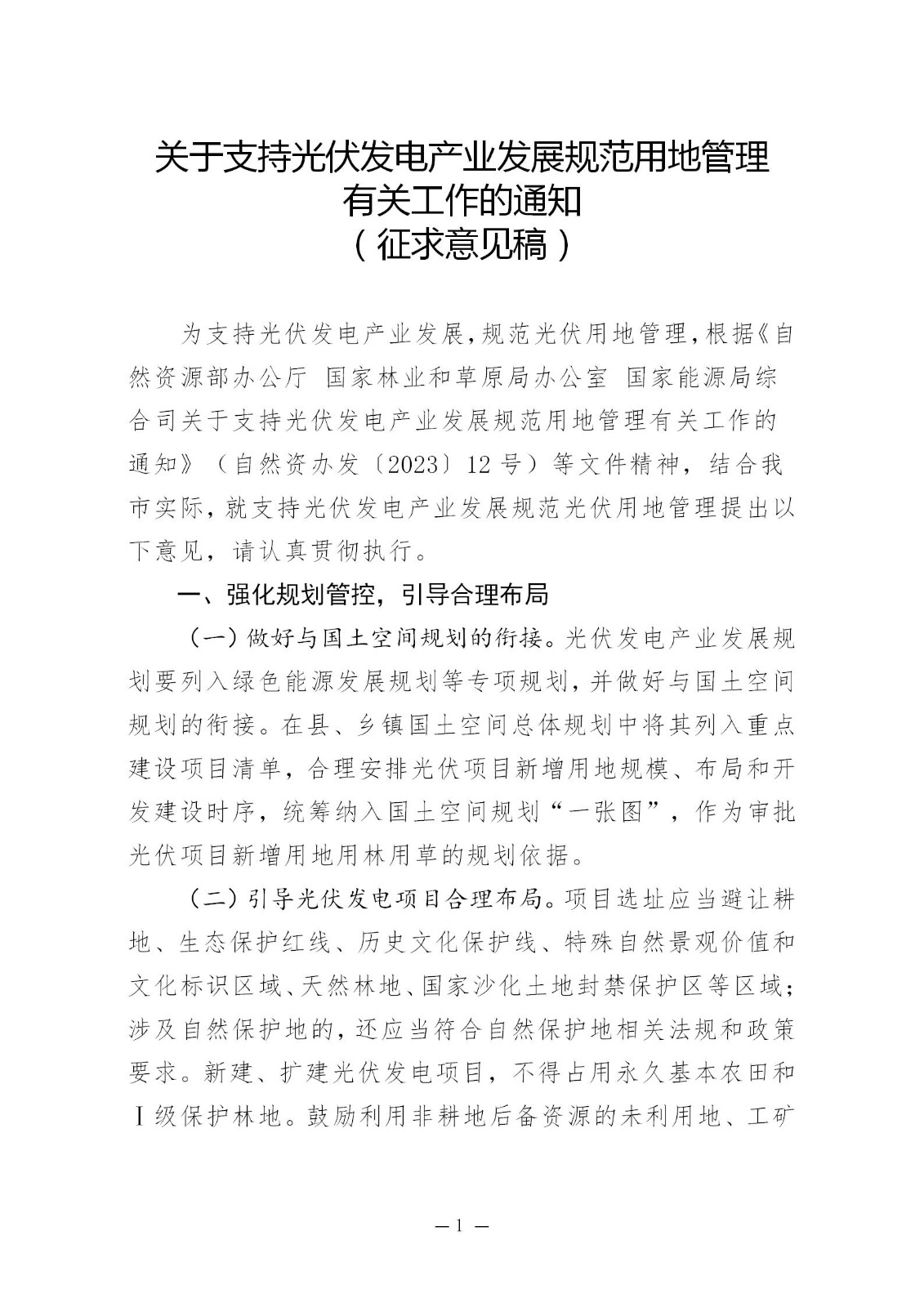 1月8日,濰坊市(shi)自然資源和規(gui)劃局發布關于征(zheng)求《關于支持光伏發(fa)(fa)電產業發(fa)(fa)展規范用地管理有關工作的通知(征求意見(jian)稿)》意見(jian)的通知。 文件提出,新建、擴建光伏發(fa)電項目(mu),不得(de)占用(yong)(yong)(yong)永(yong)久(jiu)基本(ben)農(nong)田和Ⅰ級保護林地(di)(di)。鼓勵利(li)用(yong)(yong)(yong)非耕(geng)地(di)(di)后備資源(yuan)的未利(li)用(yong)(yong)(yong)地(di)(di)、工礦廢棄(qi)地(di)(di)等存量(liang)建設用(yong)(yong)(yong)地(di)(di)以及難以復耕(geng)的災(zai)毀(hui)地(di)(di)發(fa)展(zhan)光伏發(fa)電產業(ye)。 配套設(she)施用(yong)地(di)(含(han)變電站及運行(xing)管理中(zhong)心、集(ji)電線路、場(chang)內外道路等用(yong)地(di))按建(jian)設(she)用(yong)地(di)管理,應依(yi)法依(yi)規辦理建(jian)設(she)用(yong)地(di)審批手續。其中(zhong),涉(she)及占用(yong)耕地(di)的,按規定落實占補平(ping)衡。 原(yuan)文如下(xia): 關于征求《關于支持光伏發電產業發展規范用地管理有關工作的通知(征求意見稿)》意見的通知 為支持(chi)光伏發電產(chan)業發展,規范光伏用地(di)(di)管理(li),我局(ju)(ju)制(zhi)定了《關(guan)于(yu)支持光伏發電產業發展(zhan)規范用地(di)(di)管理(li)有關(guan)工(gong)作的通知(zhi)(征求(qiu)意見(jian)(jian)稿(gao))》,現向社會公開(kai)征求(qiu)意見(jian)(jian)。如有意見(jian)(jian)建議,請于(yu)2024年(nian)1月23日前反饋(kui)市自然資源和規劃局(ju)(ju)。 聯系電話:8521212 郵(you)箱:liyongke@wf.shandong.cn 附(fu)件:關于支持光伏發電產業發展規范用地(di)管理有關工作(zuo)的通(tong)知(征求意見稿) 濰坊市自然(ran)資源和規劃(hua)局 2024年1月8日
