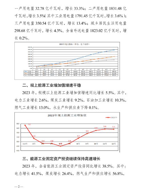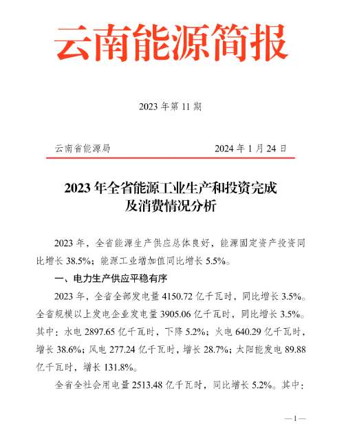 1月25日,云南省能源局公布云南能源簡報2023年第11期。 根據簡報內容,2023年,全省全部發電量4150. 72億千瓦時,同比增長3. 5%。全省規模以上發電企業發電量3905. 06億千瓦時,同比增長3. 5%.其中:水電2897. 65億千瓦時,下降5. 2%;火電640. 29億千瓦時,增長38. 6%;風電277. 24億千瓦時,增長28. 7%;太陽能發電89. 88億千瓦時,增長131. 8%。 全文見下: