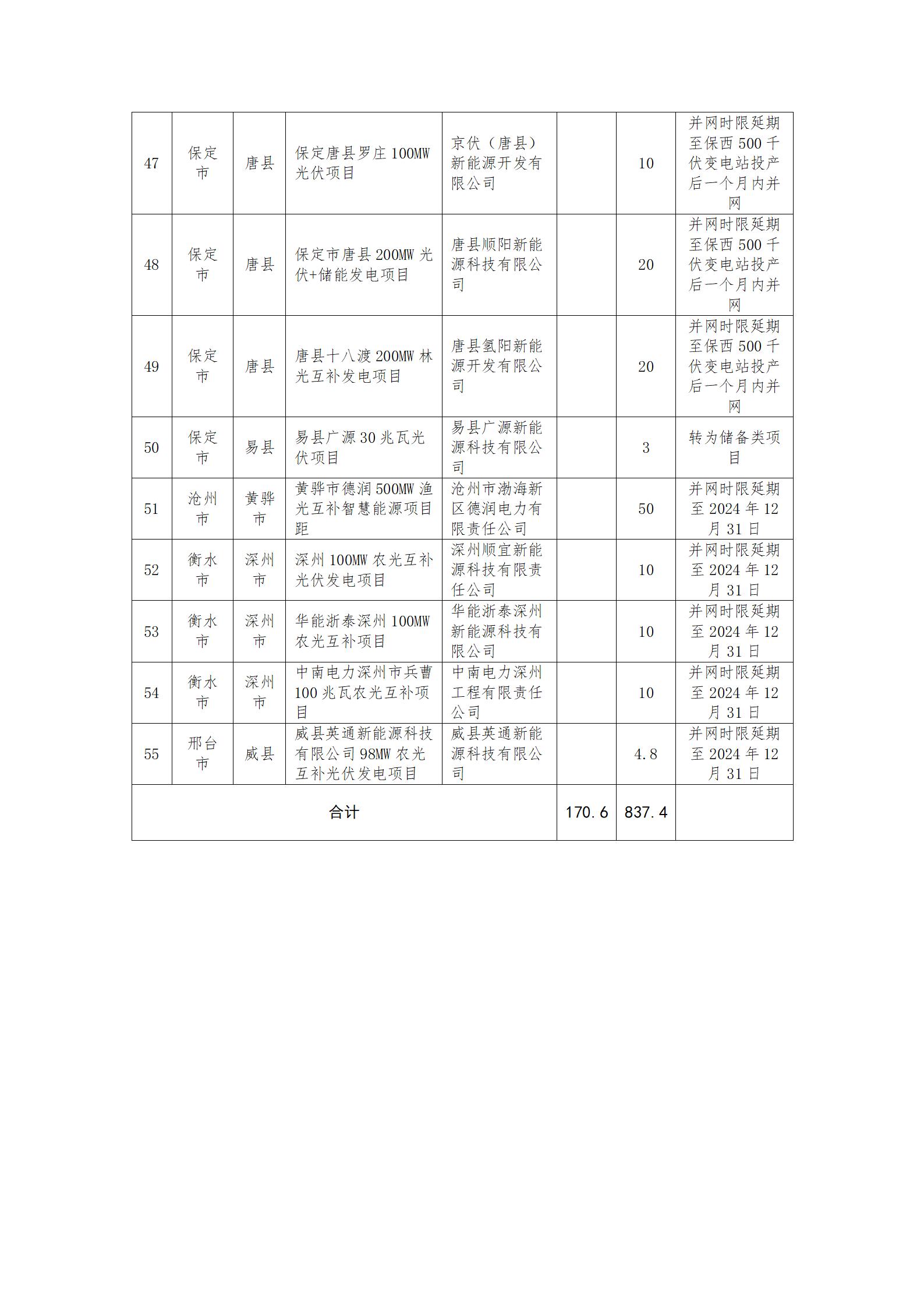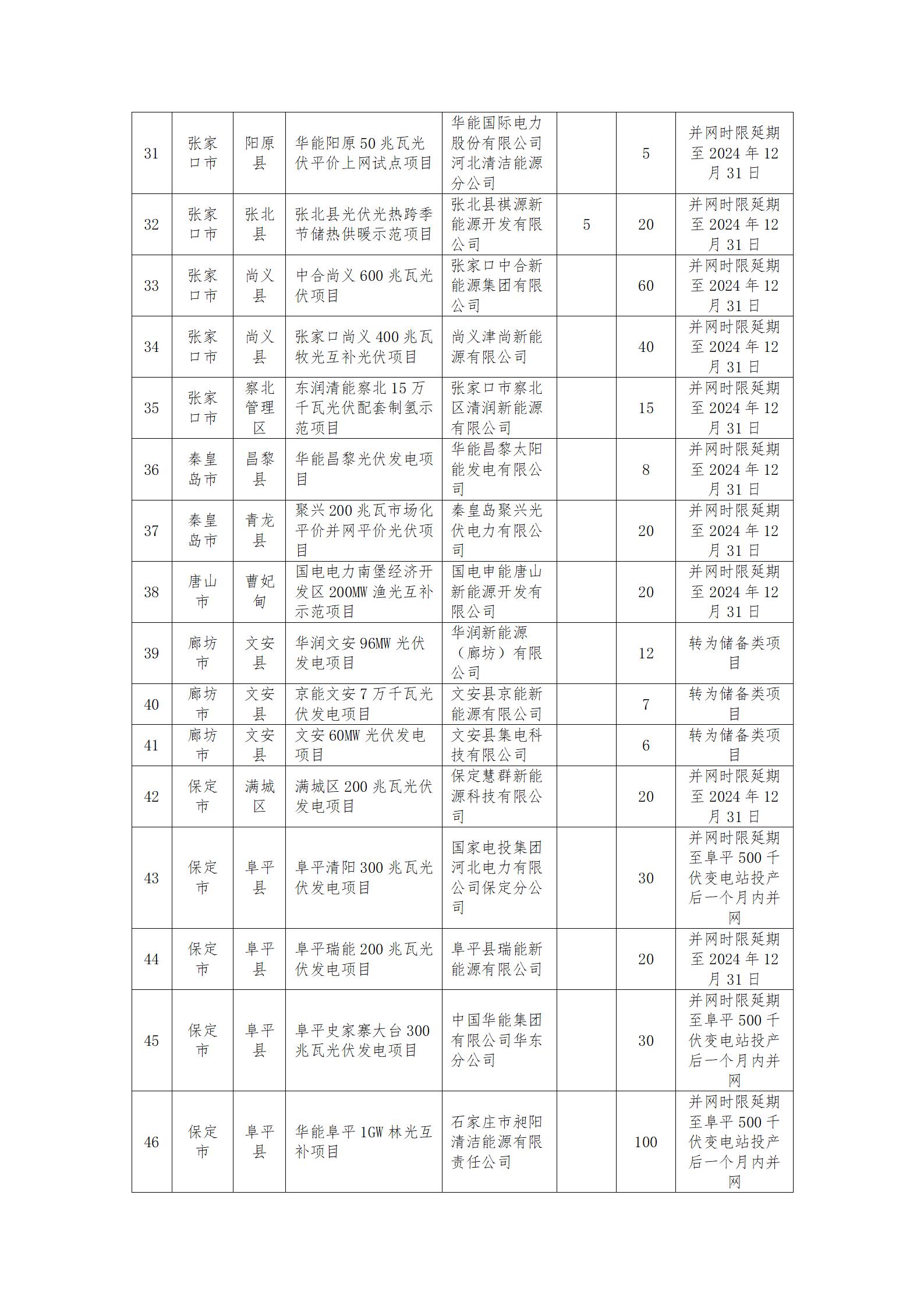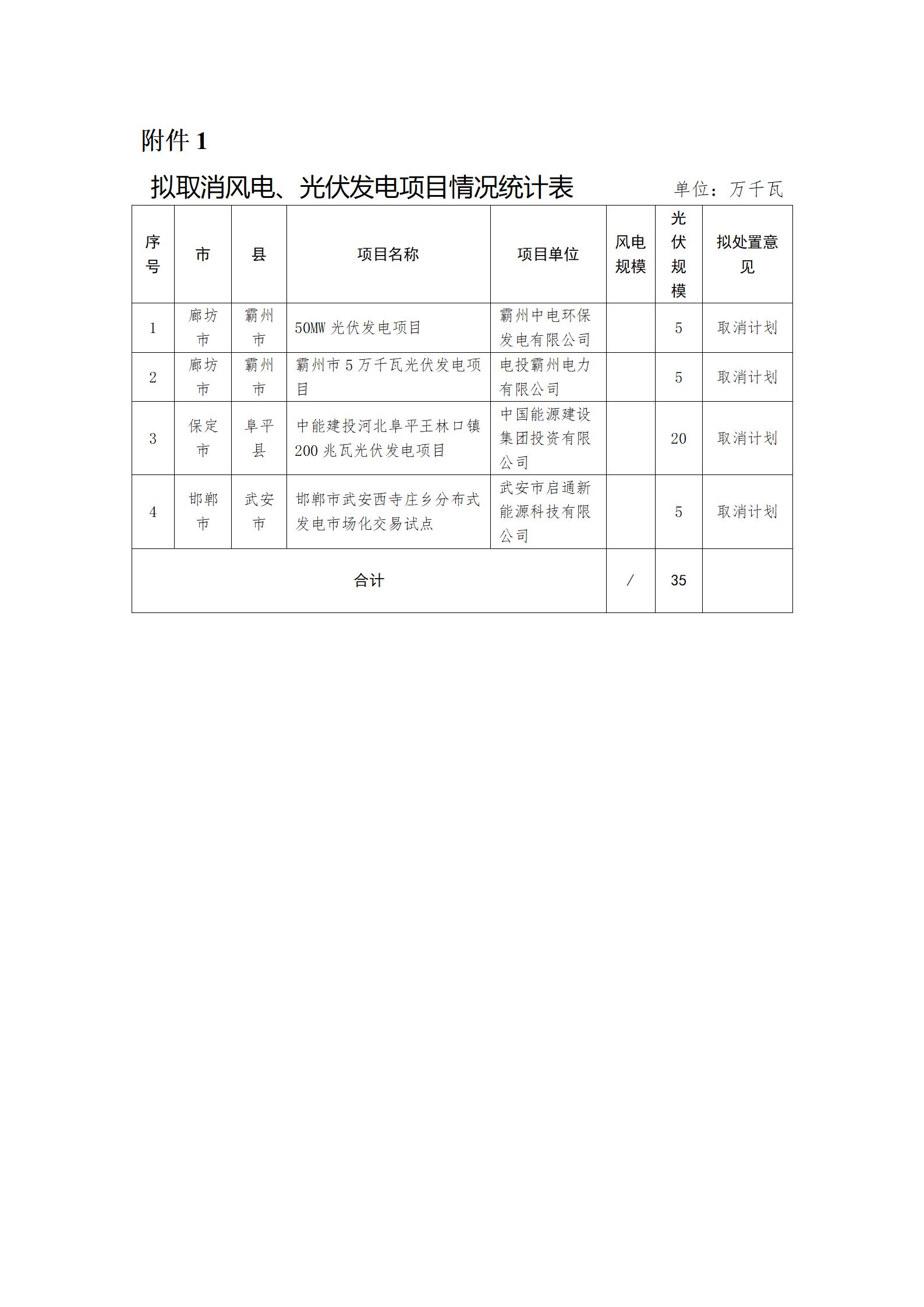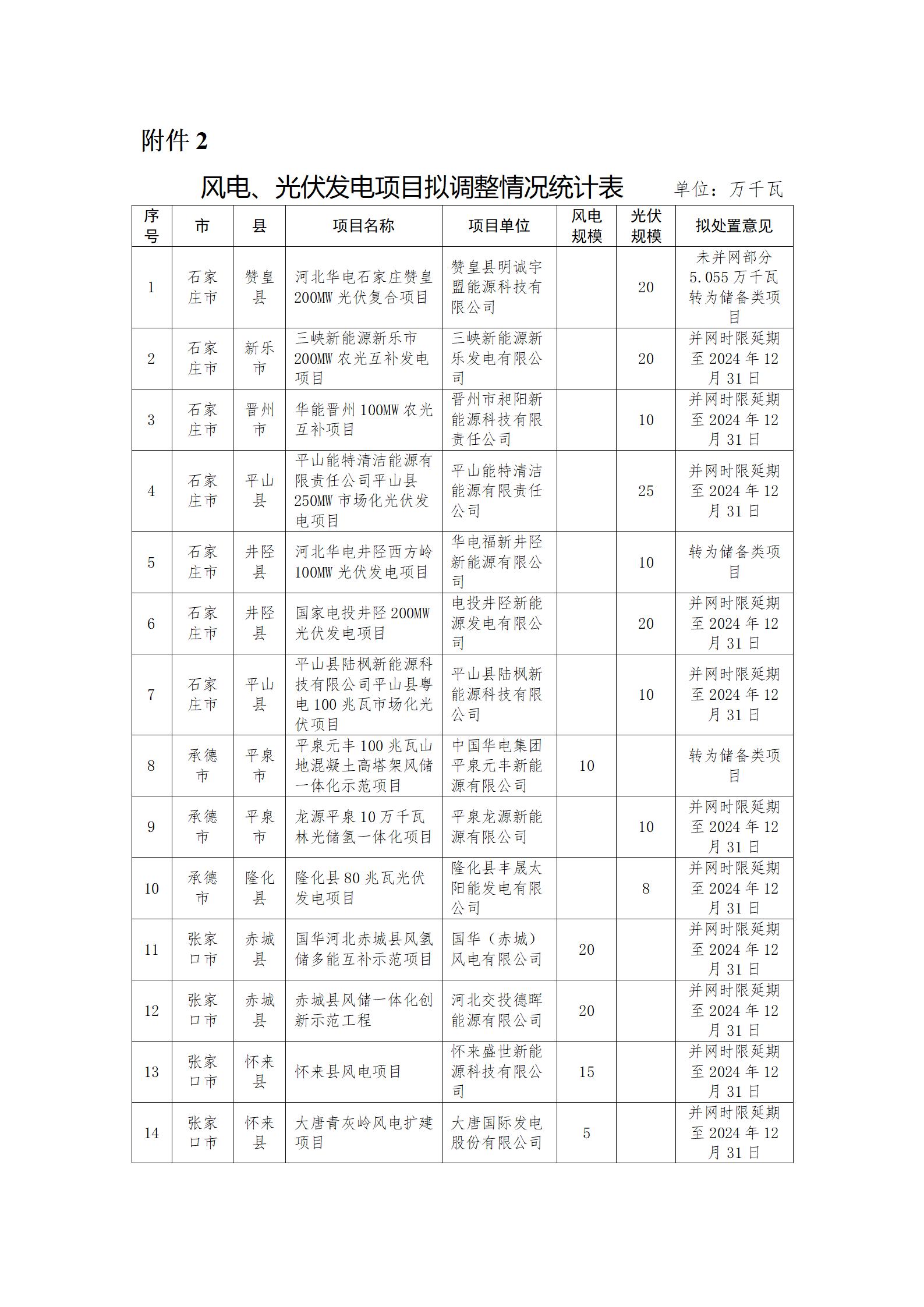 2月5日,河北省2023年底到期風電、光伏發電項目擬調整情況公示。 根據公示,河北省發改委對各市2023年底已到期風電、光伏發電項目建設進度進行了摸底統計,并對逾期未建成項目提出了處置意見。 其中,擬取消350MW光伏發電項目,擬調整8.374GW光伏發電項目、1.706GW風電項目。擬調整情況多為將項目并網時間延長至2024年12月31日。 事實上,今年1月18日,河北能源局公示了四季度風光集中并網行動到期風電、光伏項目擬調整情況,被調整的共涉及100MW風電、2.17GW光伏以及1.2GW地面光伏項目,其中部分項目取消計劃,還有一部分轉為儲備類或者延遲并網。 總體來說,自2023年以來,河北省風光項目共經過4次調整,分別是2024年2月、1月、2023年4月、8月。經統計,4次共計取消1828.13萬千瓦光伏項目指標。 詳情見下: 河北省2023年底到期風電、光伏發電項目擬調整情況公示 為進一步加強風電、光伏發電項目管理,我委組織各市對2023年底已到期風電、光伏發電項目建設進度進行了摸底統計,并對逾期未建成項目提出了處置意見。現將相關項目擬調整意見予以公示。具體項目名單及調整意見見附件。 公示時間為2024年2月5日至2月9日。期間,如有異議,請向省發展改革委(能源局)新能源處反映。 聯系電話:0311—88600512(傳真) 電子郵箱:nyjxnyc@hbdrc.gov.cn 附件:1.風電、光伏發電項目擬取消情況統計表 2.風電、光伏發電項目擬調整情況統計表