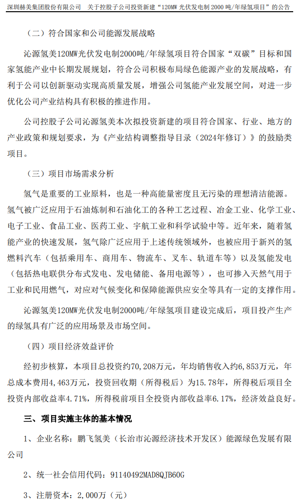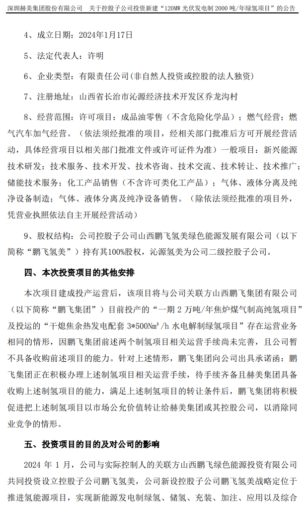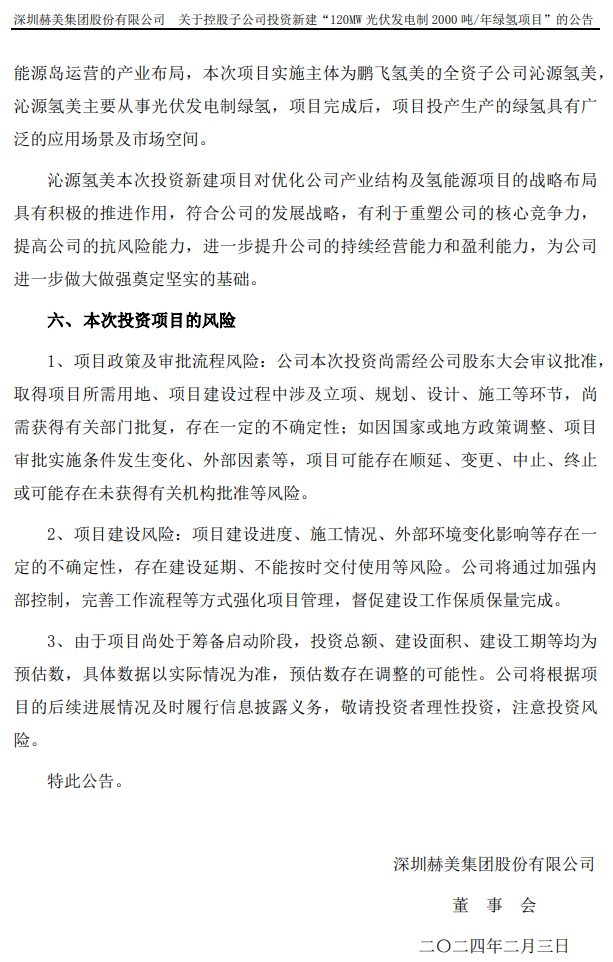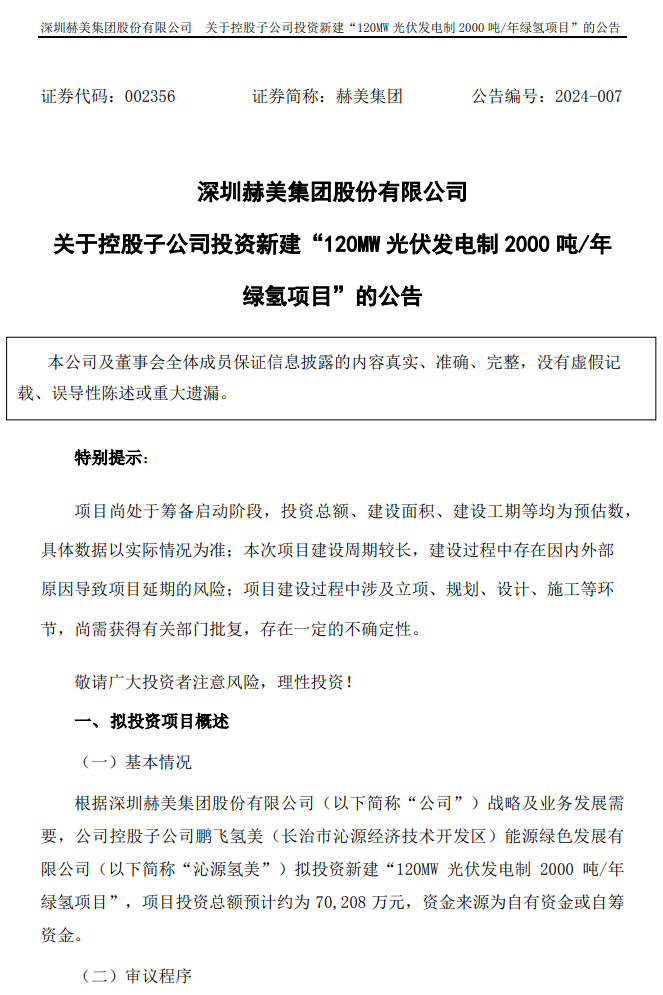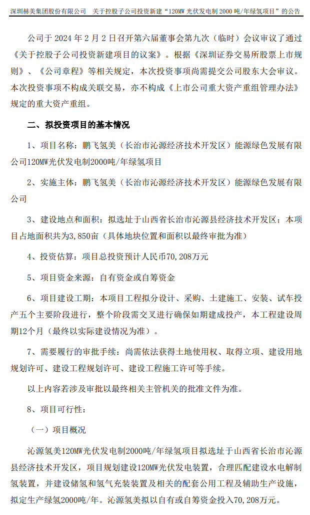 近日(ri),深(shen)圳赫(he)美集團股份有限公(gong)司(si)(簡稱“赫(he)美集團”)發布《關(guan)于控股子公(gong)司(si)投資(zi)新建120MW光伏發電(dian)制(zhi)2000噸每年綠氫項目的公(gong)告(gao)》。 公(gong)(gong)告(gao)稱,根據赫美集團戰(zhan)略及(ji)業務發(fa)(fa)展需要,公(gong)(gong)司(si)控(kong)股(gu)子公(gong)(gong)司(si)鵬(peng)飛氫美(長(chang)治市沁源(yuan)經濟技(ji)術開(kai)發(fa)(fa)區)能源(yuan)綠(lv)色(se)發(fa)(fa)展有限(xian)公(gong)(gong)司(si)(以下簡稱“沁源(yuan)氫美”)擬投資(zi)(zi)新建“120MW 光伏發(fa)(fa)電制2000噸/年綠(lv)氫項目”,項目投資(zi)(zi)總額預計約為(wei)70,208萬元,資(zi)(zi)金(jin)來源(yuan)為(wei)自(zi)有資(zi)(zi)金(jin)或自(zi)籌資(zi)(zi)金(jin)。 據悉, 沁源氫美120MW光伏發電(dian)制(zhi)2000噸/年(nian)綠(lv)氫項(xiang)目擬選址于(yu)山西(xi)省長治(zhi)市沁源縣(xian)經(jing)濟技術(shu)開(kai)發區(qu),項(xiang)目規劃(hua)建設120MW光伏發電(dian)裝(zhuang)置,合(he)理(li)匹配(pei)建設水(shui)電(dian)解制(zhi)氫裝(zhuang)置,并建設儲氫和氫氣充裝(zhuang)裝(zhuang)置及相關(guan)的配(pei)套(tao)公(gong)用工程(cheng)及輔(fu)助生產(chan)設施,擬定(ding)生產(chan)綠(lv)氫2000噸/年(nian)。 該項(xiang)目(mu)工程(cheng)擬分設計、采(cai)購、土建施工、安裝、試車投(tou)(tou)產五個(ge)主(zhu)要階段進行,整(zheng)個(ge)階段需交叉進行確保(bao)如期(qi)(qi)建成投(tou)(tou)產,本工程(cheng)建設周(zhou)期(qi)(qi)12個(ge)月(最終以實際建設情況為準(zhun))。 赫美集團表示(shi), 沁源氫(qing)(qing)美120MW光伏(fu)發(fa)電(dian)制(zhi)2000噸/年綠(lv)氫(qing)(qing)項目符(fu)合國家(jia)“雙碳”目標和國家(jia)氫(qing)(qing)能(neng)產業(ye)(ye)中長(chang)期發(fa)展(zhan)(zhan)規劃,符(fu)合公(gong)司(si)積(ji)極布局綠(lv)色能(neng)源產業(ye)(ye)的發(fa)展(zhan)(zhan)戰(zhan)略,有(you)利于(yu)公(gong)司(si)以創新驅(qu)動實現高質量發(fa)展(zhan)(zhan),增強(qiang)公(gong)司(si)氫(qing)(qing)能(neng)產業(ye)(ye)發(fa)展(zhan)(zhan)空間,對進一步優(you)化公(gong)司(si)產業(ye)(ye)結構具(ju)有(you)積(ji)極的推進作(zuo)用。 公告如下: 上一篇: 1.45億!華能制氫項目正式開工