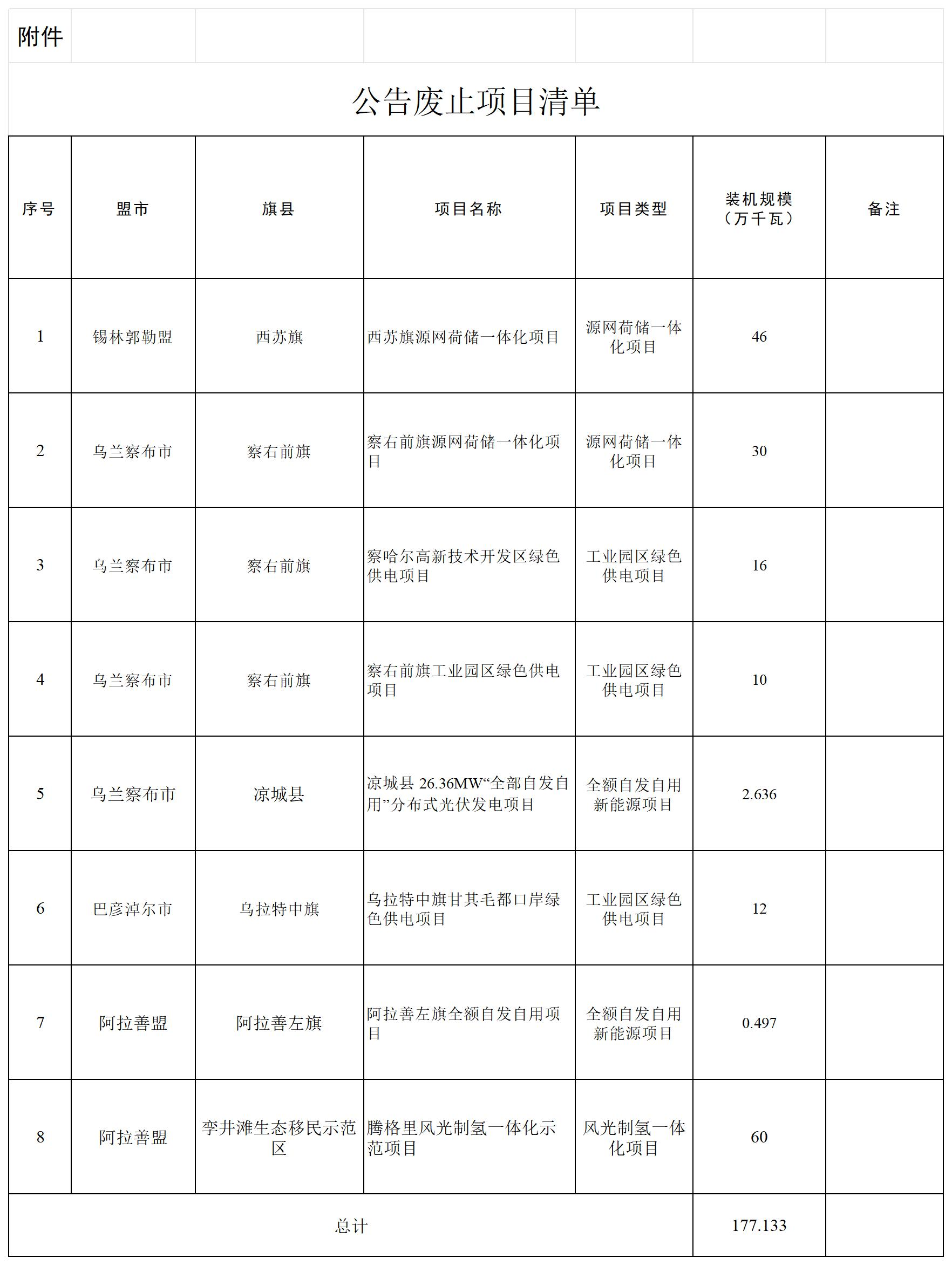 2月8日,內蒙古能源局發布關于全區新能源“再起底”第二階段項目廢止情況的公告。 根據公告,2023年11月起,內蒙古自治區能源局組織開展了全區新能源項目“再起底”工作,全面實行市場化新能源項目“能進、能出”機制。根據工作安排,現對2023年11月1日至2024年1月31日各盟市廢止的市場化并網新能源項目進行公告。本次共廢止8個市場化項目,規模總計177.133萬千瓦。 全文見下: 關于全區新能源“再起底”第二階段項目廢止情況的公告 內能源公告〔2024〕12號 按照自治區黨委、政府工作要求,2023年11月起,自治區能源局組織開展了全區新能源項目“再起底”工作,圍繞項目建設存在的問題分類施策,督促和指導各盟市和有關企業加快項目建設,同時全面實行市場化新能源項目“能進、能出”機制,企業可隨時申報市場化并網新能源項目,也可隨時申請廢止已獲批但難以推進的市場化并網新能源項目,避免無法實施的新能源項目圈占土地等資源。根據工作安排,現對2023年11月1日至2024年1月31日各盟市廢止的市場化并網新能源項目進行公告。 附件:公告廢止項目清單 內蒙古自治區能源局 2024年2月8日 (此件主動公開)