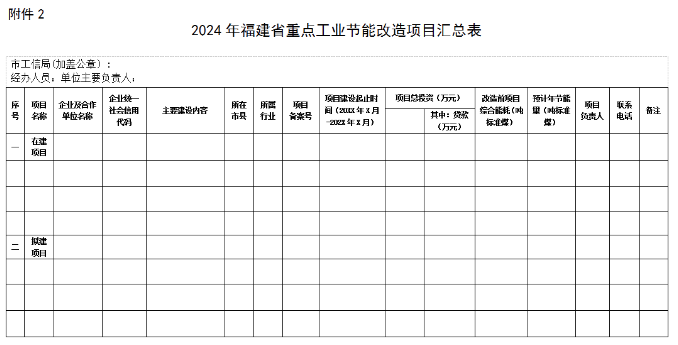 2月21日,福建省龍巖市工業和信息化局發布關于做好2024年省級重點工業節能改造項目申報工作的通知。文件指出,申報入庫項目須符合省文件要求的范圍和條件,包含2023年已建成但未入庫項目、2024年在建和擬開工建設項目,相關項目按省文件要求的流程申報。 節能改造項目支持對象為重點用能工業企業(不含能源企業)。支持工業企業采取自主投資、合同能源管理、工程項目總包建設營運等多種方式實施低效設備更新改造、能效水平提升等節能改造項目。 工業企業利用廠區建設分布式光伏發電項目、優化企業傳統用能結構等可再生能源綠色化改造項目,消納自發可再生能源的能耗量視同企業節能改造節能量,需滿足項目改造實施主體為重點用能工業企業的條件。 原文件如下: 龍巖市工業和信息化局關于做好2024年省級重點工業節能改造項目申報工作的通知 各縣(市、區)工信科技局、龍巖高新區(經開區)經發局: 為做好2024年省重點工業節能改造項目入庫申報工作,現將《福建省工業和信息化廳關于做好2024年省級重點工業節能改造項目申報工作的通知》(閩工信函節能〔2024〕77號)轉發你們,并就有關事項通知如下,請認真組織落實: 一、申報入庫項目須符合省文件要求的范圍和條件,包含2023年已建成但未入庫項目、2024年在建和擬開工建設項目,相關項目按省文件要求的流程申報。 二、節能改造項目支持對象為重點用能工業企業(不含能源企業)。支持工業企業采取自主投資、合同能源管理、工程項目總包建設營運等多種方式實施低效設備更新改造、能效水平提升等節能改造項目。 三、工業企業利用廠區建設分布式光伏發電項目、優化企業傳統用能結構等可再生能源綠色化改造項目,消納自發可再生能源的能耗量視同企業節能改造節能量,需滿足項目改造實施主體為重點用能工業企業的條件(以改造項目核準或備案表為準)。 四、申報單位提交材料清單(無需紙質材料,僅提供可編輯電子檔和加蓋公章后的PDF掃描文件): 1.《2024年福建省重點工業節能改造項目申報表》(含項目真實性承諾); 2.《2024年度福建省節能技術改造項目匯總表》; 3.《改造項目核準或備案表》; 4.合同能源管理項目還需另外提供合作協議及其他必要的佐證材料。 五、各縣(市、區)工信科技局、龍巖高新區(經開區)經發局應按要求對申報單位提交的材料進行初審、現場核實項目情況后,將符合條件的項目匯總上報。已列入省重點節能改造項目庫且2024年仍在建的項目,經與項目實施單位核實后填報匯總表一并上報,結轉列入2024年省重點節能改造項目。 六、省級節能和循環經濟專項轉移支付資金對入庫項目予以支持,請各縣(市、區)工信科技局、龍巖高新區(經開區)經發局重視項目入庫申報工作,抓緊組織項目實施,按要求做好項目跟蹤、監管和服務工作。 龍巖市工業和信息化局 2024年2月20日 福建省工業和信息化廳關于做好2024年省重點工業節能改造項目申報工作的通知 閩工信函節能〔2024〕77號 各設區市工信局、平潭綜合實驗區經發局,省屬有關集團(控股)公司: 經研究,現組織開展2024年省重點工業節能改造項目申報,有關事項通知如下。 一、項目范圍 (一)支持重點用能工業企業(能源企業除外,下同)實施低效設備更新改造、能效水平提升等節能改造項目。 (二)支持重點用能工業企業實施廠區可再生能源項目建設并消納自發可再生能源的綠色化節能改造項目。 二、申報條件 (一)在福建省內生產經營,具有獨立法人資格且為節能改造項目實施主體。 (二)項目應符合國家和我省相關產業政策、市場準入標準、資源開發、能耗與環境管理等要求,非《產業結構調整指導目錄(2024年本)》中限制類和淘汰類項目。 (三)按工信部《高耗能落后機電設備(產品)淘汰目錄》(共四批)等相關文件規定,對應淘汰的工藝技術、裝備進行節能改造的項目不得申報。 (四)項目改造后年節能量達500噸標準煤及以上。 (五)2023年已建但未入庫項目、2024年在建或擬開工建設項目。 (六)近三年未發生重大安全和環境事故,無涉黑涉惡違法行為;未被列入企業經營異常名錄或失信企業名單。 三、申報流程 (一)申報單位需填報《2024年福建省重點工業節能改造項目申報表》(以下簡稱《申報表》,見附件1)和《2024年福建省重點工業節能改造項目匯總表》(以下簡稱《匯總表》,見附件2),連同項目核準或備案有效文件復印件、節能項目真實性承諾、合作協議(合同能源管理項目提供)復印件及其他佐證材料報送設區市工信部門。以上所有材料均為電子版材料(加蓋公章后的pdf掃描件和可編輯電子版各一份)。 (二)設區市工信部門對申報的項目進行初審后,將紙質版推薦文隨附項目申報材料電子版光盤報送至我廳(節能處);已列入2023年省級重點節能改造項目庫且2024年仍在建項目,項目單位無需重新申報,由設區市工信部門填報《匯總表》后一并上報,結轉列入2024年省級重點節能改造項目庫。 (三)我廳將組織開展項目審核,并適時集中對外發布省重點工業節能改造項目及示范項目。 (四)省屬有關集團(控股)公司所屬項目參照上述流程,從項目所在地設區市工信部門上報。 四、申報時間 省級重點節能改造項目庫實行動態管理,建立隨時受理申報、審核入庫、集中發布制度。符合條件的節能改造項目備齊申報材料后即可