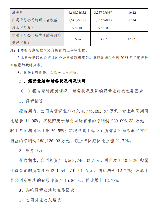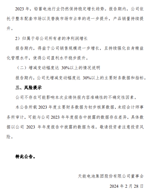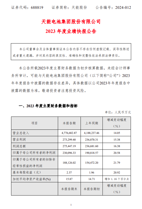 近日,天能(neng)股(gu)份發布《天能(neng)電池集團股(gu)份有(you)限(xian)公(gong)司(si)2023年度業(ye)績快報公(gong)告》。 根據(ju)公(gong)告顯示,報告期內,天能股(gu)份實(shi)現營業(ye)總(zong)收(shou)入(ru)4,776,682.87萬(wan)元,較(jiao)(jiao)上年(nian)同期同比增(zeng)長14.05%,實(shi)現歸屬于(yu)母(mu)公(gong)司(si)所(suo)有(you)者的凈利(li)潤230,096.33 萬(wan)元, 較(jiao)(jiao)上年(nian)同期同比上漲20.58%;實(shi)現歸屬于(yu)母(mu)公(gong)司(si)所(suo)有(you)者的扣(kou)除非(fei)經常性損益(yi)的凈利(li)潤 188,126.02 萬(wan)元,較(jiao)(jiao)上年(nian)同期同比上漲21.79%。