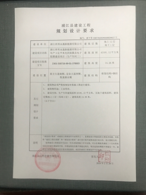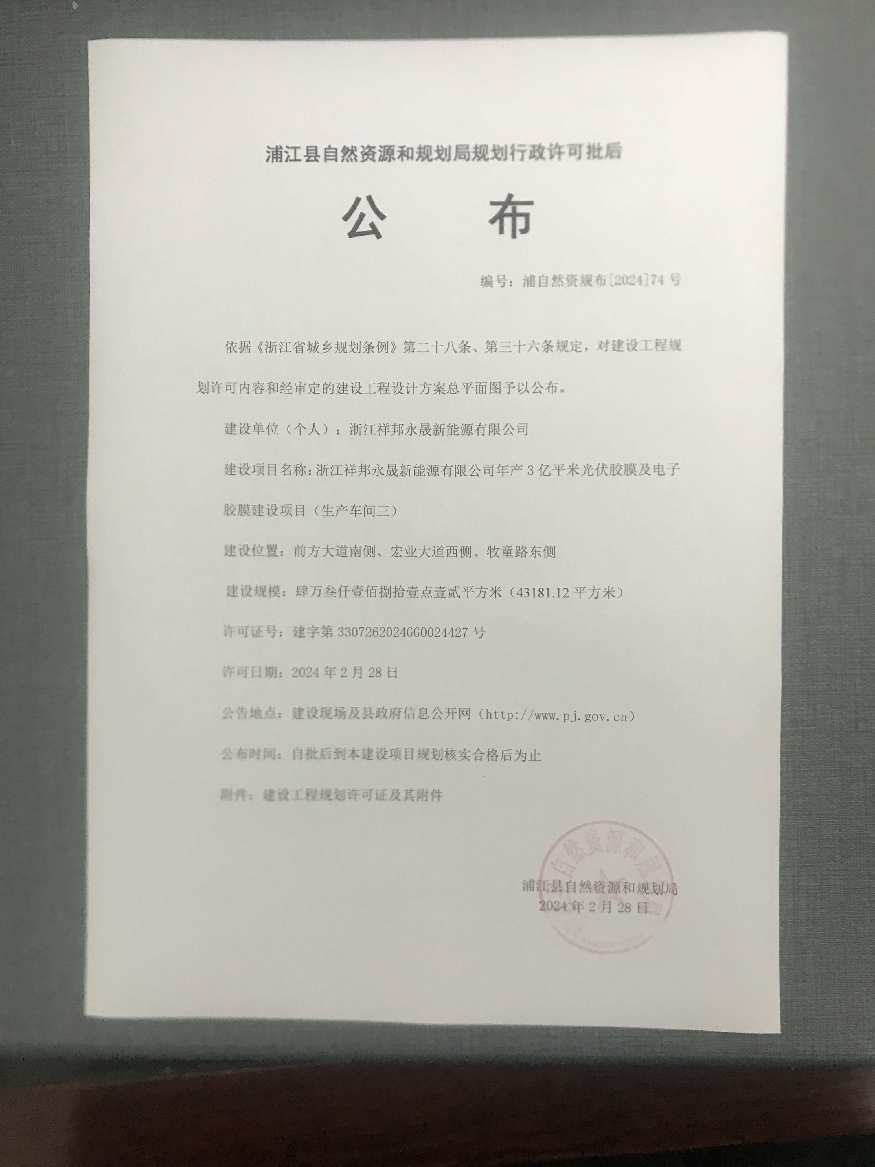 2月29日,浦江縣自然資源和規劃局發布《浙江祥邦永晟新能源有限公司年產3億平米光伏膠膜及電子膠膜建設項目建設工程規劃許可批后公布》。根據公示文件顯示,該項目建設單位為浙江祥邦永晟新能源有限公司,建設項目名稱為浙江祥邦永晟新能源有限公司年產3億平米光伏膠膜及電了膠膜建設項目(生產車間三),建設規模43181.12平方米,許可日前為2024年2月28日。