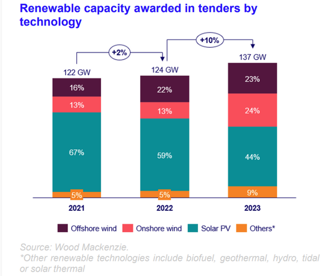 調研機構Wood Mackenzie公司在日前發布的一份研究報告指出,通過政府招標,全球在2023年安裝的可再生能源發電設施裝機容量達到137GW。在2023年的政府招標中,光伏系統仍然是中標最多的可再生能源,但其裝機容量在可再生能源總裝機容量中的份額從59%下降到44%。該公司預計2024年的政府招標至少會達到2023年的水平。 圖1 政府招標2021~2023年按技術劃分的可再生能源裝機容量 Wood Mackenzie公司表示,盡管2023年出現了成本上漲、物流緊張和能源危機等不利因素,但全球安裝的可再生能源設施裝機容量仍同比增長了10%。 在去年的政府招標中,光伏系統是中標最多的可再生能源。亞太地區獲得了全球三分之二的政府采購合同,約為90GW。中國通過49項招標分配了55GW以上的可再生能源。印度在55項可再生能源招標中分配了20GW的可再生能源。而德國是歐洲最大的參與者,通過11輪招標分配了19GW可再生能源。 Wood Mackenzie公司預測,到2024年,政府招標將推動全球安裝102GW的可再生能源發電設施,其中包括60GW以上的海上風電設施。該公司預計,隨著時間的推移,可再生能源裝機容量將會繼續增長,最終達到2023年的水平。 Wood Mackenzie公司高級研究分析師Ana Fernandez Garcia表示:“政府招標的可再生能源裝機容量每年都在增加,我們預計到2024年將看到一些巨大的回報——EMEA地區將占預期招標的50%以上,主要增長來自海上風電。中國等一些主要市場將繼續占據主導地位。” 根據Wood Mackenzie公司的分析,全球可再生能源的招標目前正經歷兩種相反的趨勢。報告解釋說,雖然海上風能行業經歷了激烈的市場競爭,導致出現無補貼招標和負投標,但陸上風力和光伏系統招標卻沒有得到足夠的認購。 該公司表示,由于缺乏感興趣的競標者,2023年全球政府招標中,還有30%的可再能源裝機容量未分配。零投標導致在一些項目在開發階段的后期取消合同。 Fernandez Garcia表示,這兩種情況都使全球可再生能源裝機容量的增長面臨風險,并說明了招標設計改革的必要性。她補充說,Wood Mackenzie公司預計,上限價格和非價格標準的提高將在未來一年發揮重要作用。 Wood Mackenzie公司的最新分析是在今年早些時候發布的關于亞太地區度電成本(LCOE)的最新研究和對2032年光伏系統裝機容量增長的預測之后進行的。