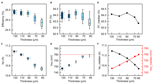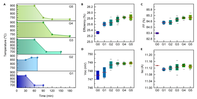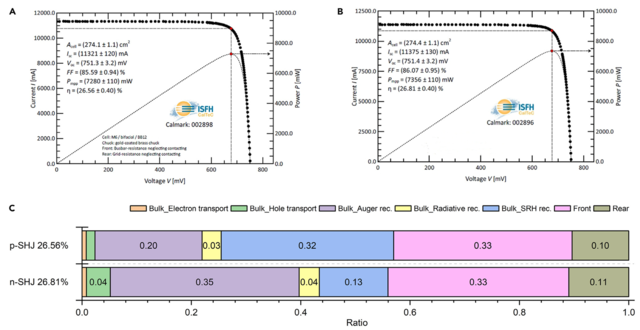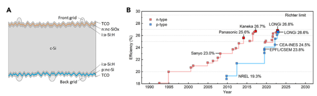 在非晶(jing)/結晶(jing)硅(a-Si:H/c-Si)界(jie)面形成的異(yi)(yi)質(zhi)結(jie)具(ju)有獨特(te)的電子(zi)特(te)性,可用于硅異(yi)(yi)質(zhi)結(jie)(SHJ)太陽能電池。超薄(bo)a-Si:H鈍化層的結(jie)合(he)實現了750 mV的高開路電壓(ya)(Voc)。此外(wai),n型或p型摻雜的a-Si:H接觸(chu)層可以(yi)結(jie)晶成混(hun)合(he)相,減輕寄生吸收,并提高載流子(zi)選擇性和收集效率。 隆基綠能(neng)(neng)(neng)科技股份有限公(gong)司Xu Xixiang、Li Zhenguo等人(ren)在p型(xing)硅(gui)片上實現效率為26.6%的(de)SHJ太陽能(neng)(neng)(neng)電(dian)池。作(zuo)者在晶片上采用(yong)了(le)磷擴散吸(xi)雜預處理(li)策略,并使用(yong)了(le)納米(mi)晶體硅(gui)(nc-Si:H)的(de)載流(liu)子選(xuan)擇(ze)性接觸,將p型(xing)SHJ太陽能(neng)(neng)(neng)電(dian)池的(de)效率大幅提高到(dao)26.56%,從(cong)而(er)為p型(xing)硅(gui)太陽能(neng)(neng)(neng)電(dian)池建立了(le)新的(de)性能(neng)(neng)(neng)基準。 作(zuo)者(zhe)(zhe)詳(xiang)細介紹了(le)該器件(jian)的工藝發展和光電性(xing)能改善。最后,作(zuo)者(zhe)(zhe)進行功率損耗分析以確(que)定(ding)p型SHJ太陽能電(dian)池(chi)技術的(de)未來發展路徑。