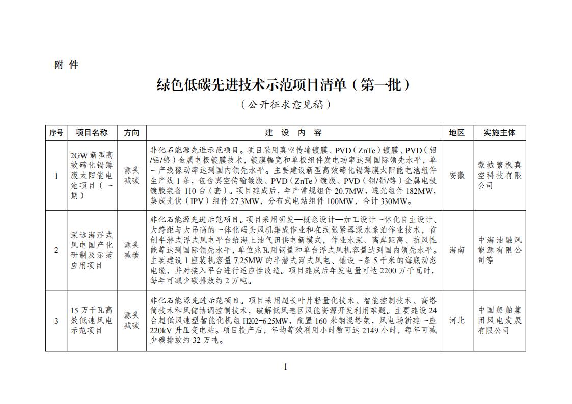 3月19日,國家發展改革委發布向社會公開征求《綠色低碳先進技術示范項目清單(第一批)》意見的公告。 文件顯示,第一批綠色低碳先進技術示范項目清單,共納入47個項目。其中包括,2GW新型高效碲化鎘薄膜太陽能電池項目(一期)、綠色低碳新城建設及近零能耗建筑示范項目等。 原文如下: 關于向社會公開征求《綠色低碳先進技術示范項目 清單(第一批)》意見的公告 為貫徹落實黨中央、國務院決策部署,加快綠色低碳先進技術示范應用和推廣,按照國家發展改革委等10部門聯合印發的《綠色低碳先進技術示范工程實施方案》(發改環資〔2023〕1093號)有關部署,經過項目單位申報、地方審核推薦、第三方機構評審、部門及地方復核等流程,確定了第一批綠色低碳先進技術示范項目清單,共納入47個項目,現向社會公開征求意見。 此次公開征求意見的時間為2024年3月19日至2024年3月25日。公眾可登錄國家發展改革委門戶網站(.cn)首頁“互動”板塊,進入“征求意見”專欄,提出意見建議。提出異議的單位或個人應對相關材料的真實性和可靠性負責,對無具體事實根據的異議,以及其他不正當要求將不予受理。 感謝您的參與和支持! 附件:綠色低碳先進技術示范項目清單(第一批)(公開征求意見稿) 國家發展改革委 2024年3月19日