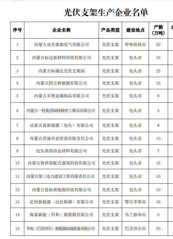 為落實自治區新能源裝備制造與新能源開發一體化發展戰略部署,做大做強呼包鄂通光伏產業基地建設,進一步推動光伏裝備制造企業與新能源開發企業開展供需對接,內蒙古自治區工業和信息化廳將光伏裝備生產企業名單(第二批)予以公布。