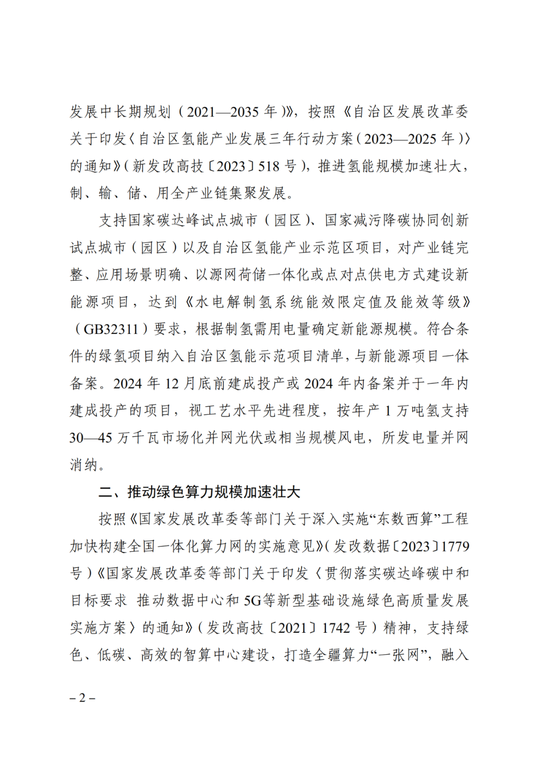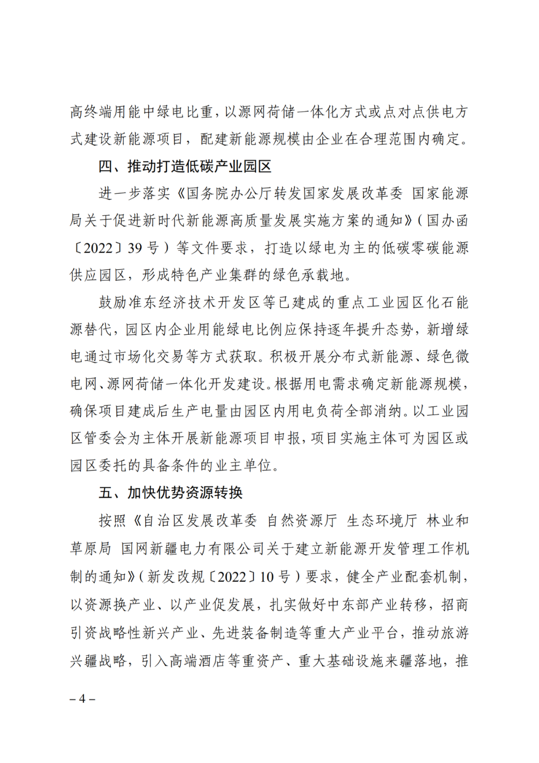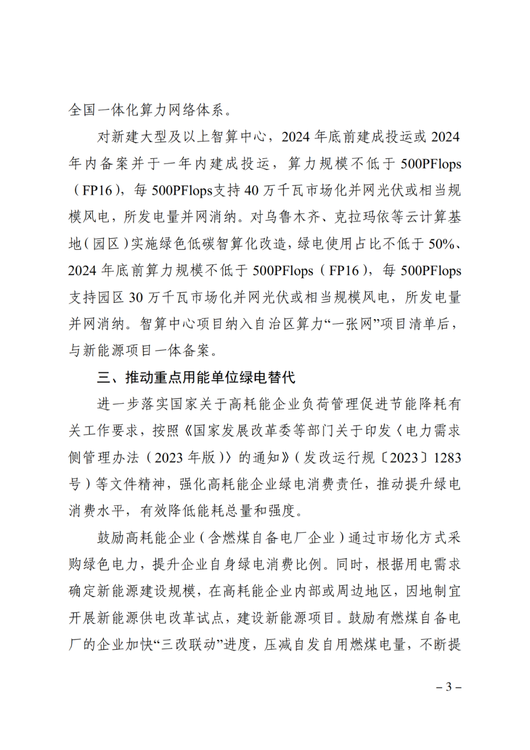 3月27日,新(xin)疆發改(gai)委、國網新(xin)疆電力有(you)限公司聯(lian)合(he)印(yin)發《關于進一步發揮風(feng)光資源優勢(shi)促進特色產(chan)業高質量發展政策措施的通(tong)知(zhi)》。通(tong)知(zhi)指(zhi)出,通(tong)過五大路徑配比一定規模(mo)的風(feng)、光市場化指(zhi)標。 一、推動氫能產業加快發展,按年產1萬噸氫支持30—45萬千瓦市場化并網光伏或相當規模風電。 支持國(guo)(guo)家碳(tan)達(da)峰試(shi)點城市(園(yuan)區(qu))、國(guo)(guo)家減污降碳(tan)協同創新試(shi)點城市(園(yuan)區(qu))以(yi)及自(zi)治(zhi)區(qu)氫(qing)(qing)(qing)能(neng)產(chan)(chan)業示范區(qu)項目(mu),對產(chan)(chan)業鏈完整、應用場景(jing)明確、以(yi)源(yuan)(yuan)網荷儲一體(ti)化或(huo)點對點供電方式(shi)建設新能(neng)源(yuan)(yuan)項目(mu),達(da)到《水電解制氫(qing)(qing)(qing)系統能(neng)效限(xian)定值及能(neng)效等級》(GB32311)要求,根(gen)據(ju)制氫(qing)(qing)(qing)需用電量確定新能(neng)源(yuan)(yuan)規模(mo)。符合條件的綠氫(qing)(qing)(qing)項目(mu)納入自(zi)治(zhi)區(qu)氫(qing)(qing)(qing)能(neng)示范項目(mu)清單,與新能(neng)源(yuan)(yuan)項目(mu)一體(ti)備(bei)案(an)。2024年(nian)12月底前(qian)建成(cheng)投產(chan)(chan)或(huo)2024年(nian)內備(bei)案(an)并(bing)于一年(nian)內建成(cheng)投產(chan)(chan)的項目(mu)。 二、推動綠色算力規模加速壯大,每500PFlops算力支持40萬千瓦市場化并網光伏或相當規模風電。 對新(xin)建(jian)大型及以上智(zhi)算(suan)(suan)(suan)中心(xin),2024年(nian)(nian)底前建(jian)成投運或(huo)2024年(nian)(nian)內備案(an)并于(yu)一年(nian)(nian)內建(jian)成投運,算(suan)(suan)(suan)力規模(mo)(mo)不低(di)(di)于(yu)500PFlops(FP16),每500PFlops支(zhi)持(chi)40萬千(qian)瓦市(shi)場化并網(wang)(wang)光伏或(huo)相(xiang)(xiang)當規模(mo)(mo)風(feng)電(dian),所發(fa)電(dian)量并網(wang)(wang)消納。對烏(wu)魯木齊、克拉(la)瑪依(yi)等云計(ji)算(suan)(suan)(suan)基地(園區)實(shi)施綠(lv)(lv)色低(di)(di)碳(tan)智(zhi)算(suan)(suan)(suan)化改造,綠(lv)(lv)電(dian)使用占比(bi)不低(di)(di)于(yu)50%、2024年(nian)(nian)底前算(suan)(suan)(suan)力規模(mo)(mo)不低(di)(di)于(yu)500PFlops(FP16),每500PFlops支(zhi)持(chi)園區30萬千(qian)瓦市(shi)場化并網(wang)(wang)光伏或(huo)相(xiang)(xiang)當規模(mo)(mo)風(feng)電(dian),所發(fa)電(dian)量并網(wang)(wang)消納。 三、推動重點用能單位綠電替代,配建新能源規模由企業在合理范圍內確定。 根據(ju)用(yong)電需求確定(ding)新能源(yuan)(yuan)建設(she)規模,在(zai)高耗(hao)能企業內部或(huo)周邊地區,因地制宜(yi)開展新能源(yuan)(yuan)供電改革(ge)試(shi)點(dian),建設(she)新能源(yuan)(yuan)項(xiang)目。以(yi)源(yuan)(yuan)網荷儲一體化(hua)方式或(huo)點(dian)對點(dian)供電方式建設(she)新能源(yuan)(yuan)項(xiang)目。 四、推動打造低碳產業園區,根據用電需求確定新能源規模,確保項目建成后生產電量由園區內用電負荷全部消納。 積(ji)極(ji)開展分布式(shi)新(xin)能源(yuan)、綠色微(wei)電(dian)網(wang)、源(yuan)網(wang)荷(he)儲(chu)一體(ti)化開發(fa)建設。根據(ju)用電(dian)需求確(que)定新(xin)能源(yuan)規模,確(que)保項目建成(cheng)后生產(chan)電(dian)量由(you)園(yuan)區內用電(dian)負荷(he)全(quan)部(bu)消納。以工業園(yuan)區管委會為(wei)主體(ti)開展新(xin)能源(yuan)項目申報,項目實施主體(ti)可為(wei)園(yuan)區或園(yuan)區委托的具備條件的業主單位。 五、加快優勢資源轉換,以資源換產業。 健全(quan)產業(ye)配套(tao)機(ji)制,以(yi)資(zi)(zi)源(yuan)換產業(ye)、以(yi)產業(ye)促發展,扎(zha)實(shi)做(zuo)好中東部產業(ye)轉移,招商引資(zi)(zi)戰(zhan)略(lve)性(xing)新(xin)(xin)興(xing)產業(ye)、先(xian)進裝備制造等(deng)重(zhong)大產業(ye)平臺,推(tui)動旅游(you)興(xing)疆戰(zhan)略(lve),引入高端酒店等(deng)重(zhong)資(zi)(zi)產、重(zhong)大基礎設(she)施來疆落地(di),推(tui)動新(xin)(xin)能(neng)源(yuan)優先(xian)布(bu)局。 原文如(ru)下:
