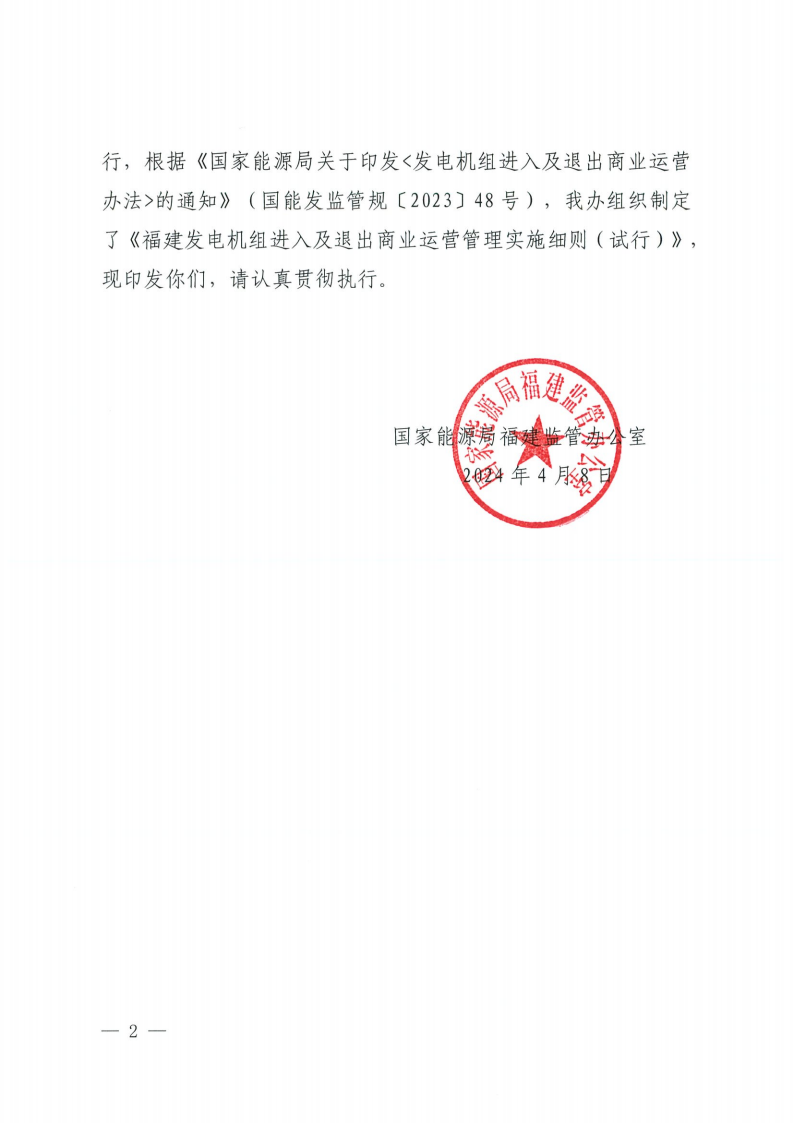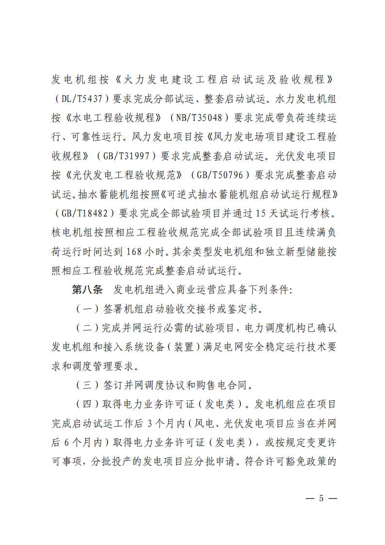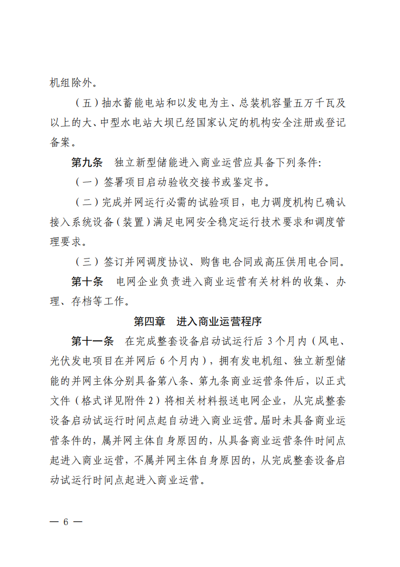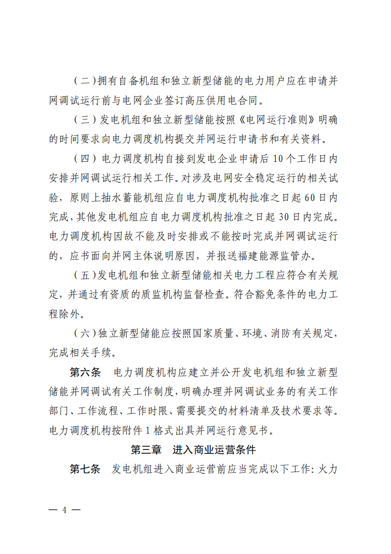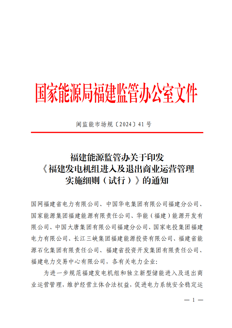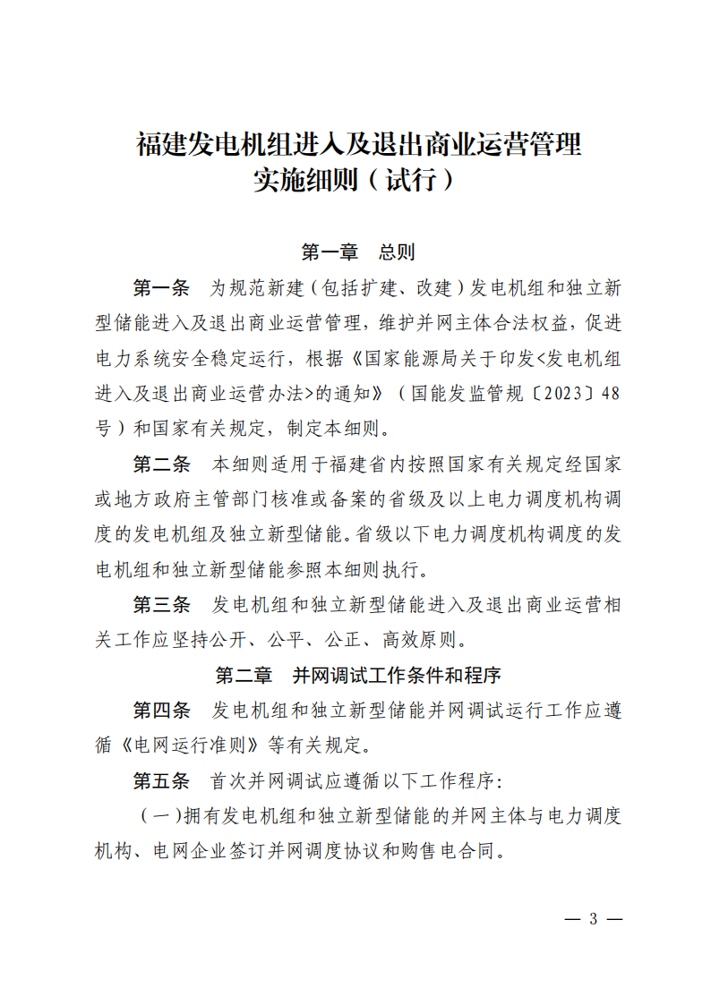福(fu)建(jian)能源監管(guan)辦關于印發(fa)《福(fu)建(jian)發(fa)電機組進入及(ji)退出商業運營管(guan)理實施(shi)細則(試行)》的(de)通知(閩(min)監能市場規〔2024〕41號). 文件明確(que),為規(gui)范新(xin)建(jian)(包括擴建(jian)、改建(jian))發(fa)電機(ji)組(zu)和獨立(li)新(xin)型儲能進入及退出(chu)商業運(yun)營管理,維(wei)護并網主體合法權益,促進 電力系(xi)統安全穩定(ding)運(yun)行,根據《國家能源局關于印(yin)發(fa)<發(fa)電機(ji)組(zu) 進入及退出(chu)商業運(yun)營辦法>的通知(zhi)》(國能發(fa)監管規(gui)〔2023〕48 號)和國家有關規(gui)定(ding),制定(ding)本(ben)細則(ze)。發(fa)電機(ji)組(zu)和獨立(li)新(xin)型儲能進入及退出(chu)商業運(yun)營相 關工作應(ying)堅持(chi)公開、公平、公正、高效原則(ze)。 文件(jian)提出,獨立新型儲能進入商業運(yun)營應具(ju)備下列條件(jian): (一)簽署(shu)項目啟動(dong)驗收(shou)交接(jie)書(shu)或鑒定書(shu)。 (二)完成并網運(yun)行必(bi)需的(de)試驗項目,電(dian)力調度機構已確認 接(jie)入系(xi)統設(she)備(裝置)滿足(zu)電(dian)網安(an)全穩定運(yun)行技術(shu)要求和調度管 理要求。 (三)簽訂并網調度協議、購售電(dian)合(he)同或高(gao)壓供用電(dian)合(he)同。 原文如下: