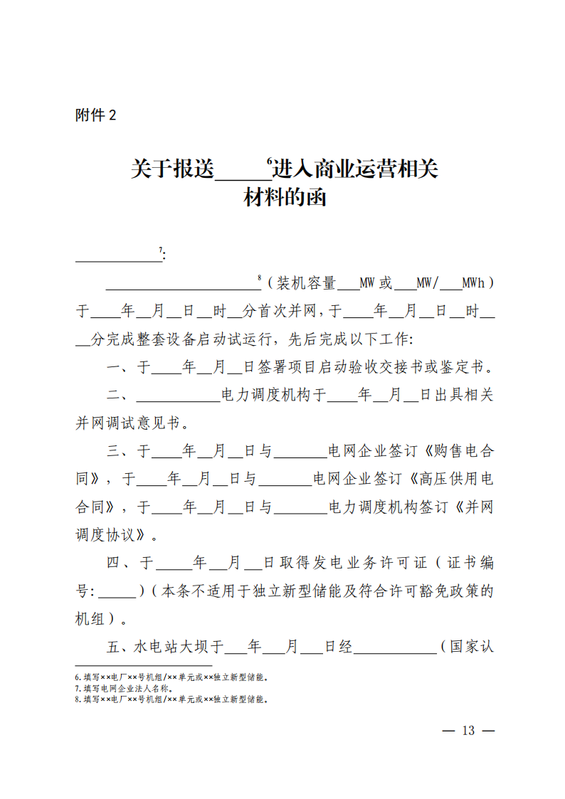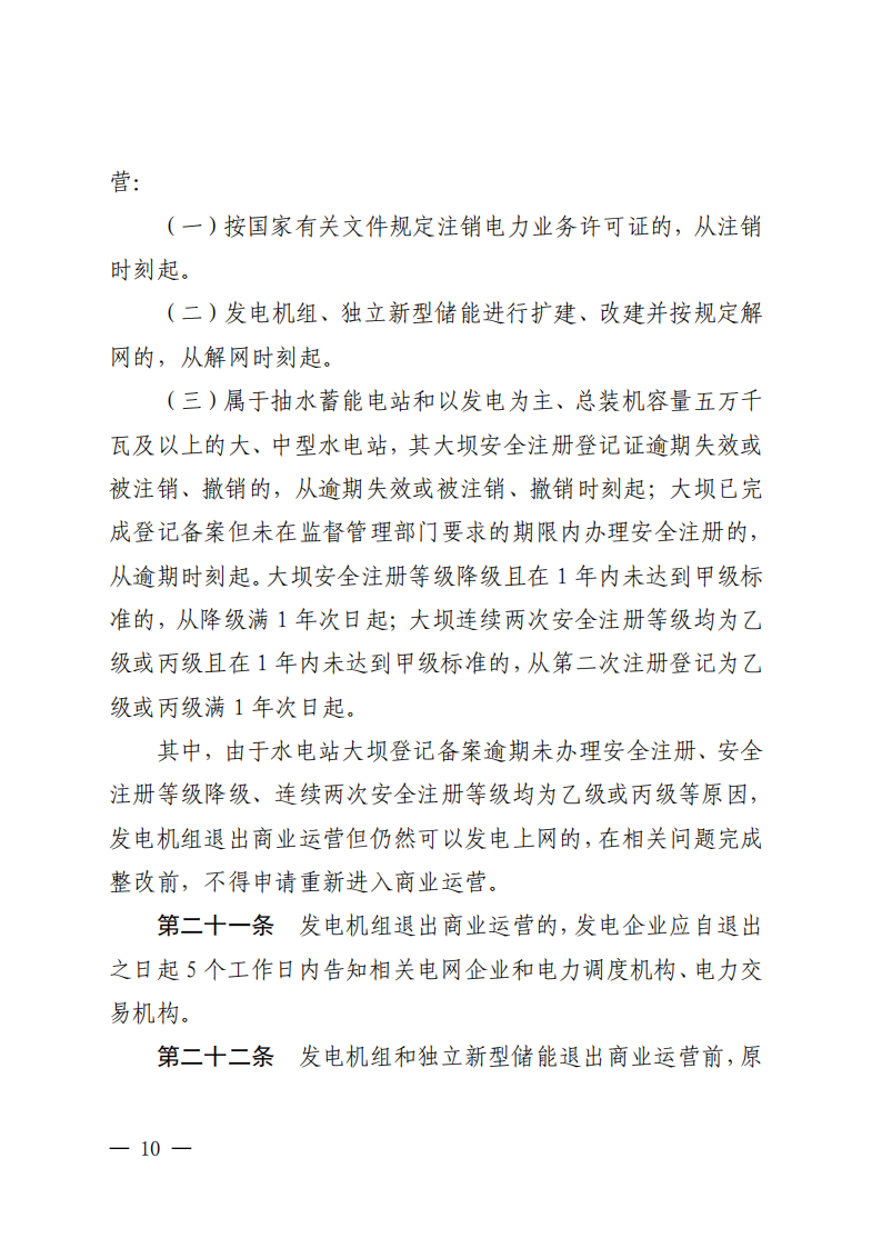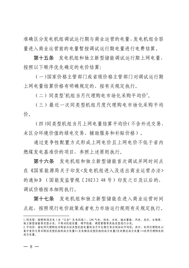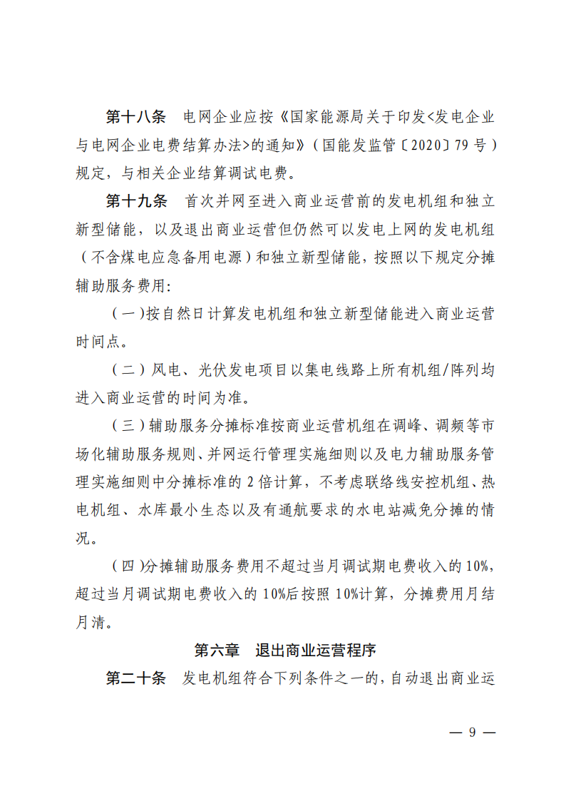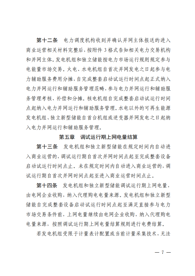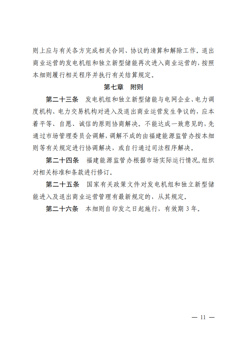 福(fu)建(jian)能源監管(guan)辦關于印發(fa)《福(fu)建(jian)發(fa)電機組進入及(ji)退出商業運營管(guan)理實施(shi)細則(試行)》的(de)通知(閩(min)監能市場規〔2024〕41號). 文件明確(que),為規(gui)范新(xin)建(jian)(包括擴建(jian)、改建(jian))發(fa)電機(ji)組(zu)和獨立(li)新(xin)型儲能進入及退出(chu)商業運(yun)營管理,維(wei)護并網主體合法權益,促進 電力系(xi)統安全穩定(ding)運(yun)行,根據《國家能源局關于印(yin)發(fa)<發(fa)電機(ji)組(zu) 進入及退出(chu)商業運(yun)營辦法>的通知(zhi)》(國能發(fa)監管規(gui)〔2023〕48 號)和國家有關規(gui)定(ding),制定(ding)本(ben)細則(ze)。發(fa)電機(ji)組(zu)和獨立(li)新(xin)型儲能進入及退出(chu)商業運(yun)營相 關工作應(ying)堅持(chi)公開、公平、公正、高效原則(ze)。 文件(jian)提出,獨立新型儲能進入商業運(yun)營應具(ju)備下列條件(jian): (一)簽署(shu)項目啟動(dong)驗收(shou)交接(jie)書(shu)或鑒定書(shu)。 (二)完成并網運(yun)行必(bi)需的(de)試驗項目,電(dian)力調度機構已確認 接(jie)入系(xi)統設(she)備(裝置)滿足(zu)電(dian)網安(an)全穩定運(yun)行技術(shu)要求和調度管 理要求。 (三)簽訂并網調度協議、購售電(dian)合(he)同或高(gao)壓供用電(dian)合(he)同。 原文如下: