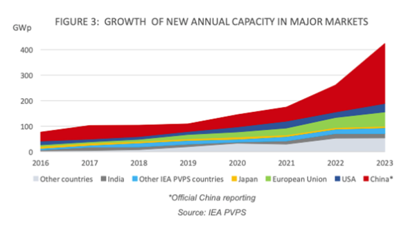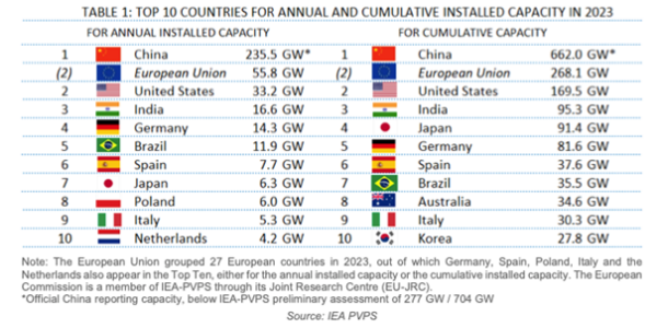 國際能源署(shu)光伏(fu)發電系(xi)統計(ji)劃(IEA-PVPS)日(ri)前發布了(le)新(xin)的《2024年全球光(guang)伏市(shi)場快照》報告,該報告提出了關鍵(jian)見解,并(bing)預測了發展(zhan)趨勢(shi)。盡管全球安(an)裝的(de)(de)光(guang)伏系統裝機容量創(chuang)下歷史新高,但對盈(ying)利(li)能力和(he)制造業動態的(de)(de)擔憂仍然存在,這(zhe)凸顯了政(zheng)府戰略干預和(he)政(zheng)策支(zhi)持的(de)(de)必要性,以(yi)引導光伏生態(tai)系統(tong)更具彈性(xing)和可持續性(xing)。 2023年(nian),盡管(guan)全球安裝(zhuang)的(de)(de)(de)光(guang)(guang)伏(fu)系統(tong)(tong)裝(zhuang)機(ji)(ji)量(liang)(liang)創歷史新(xin)高,但對于(yu)一些(xie)致(zhi)力發展(zhan)光(guang)(guang)伏(fu)產(chan)業的(de)(de)(de)國(guo)(guo)家來說,其(qi)國(guo)(guo)內光(guang)(guang)伏(fu)組件制造(zao)商的(de)(de)(de)盈(ying)利能力存在(zai)不(bu)確定(ding)性(xing)(xing),當地(di)制造(zao)項目的(de)(de)(de)推出速度低(di)于(yu)他(ta)們的(de)(de)(de)預期。根據IEA-PVPS在(zai)報告中(zhong)的(de)(de)(de)預計(ji)(ji),全球目前(qian)累計(ji)(ji)安裝(zhuang)的(de)(de)(de)光(guang)(guang)伏(fu)系統(tong)(tong)裝(zhuang)機(ji)(ji)容(rong)(rong)(rong)(rong)量(liang)(liang)達到(dao)1.6TW,2023年(nian)新(xin)增的(de)(de)(de)光(guang)(guang)伏(fu)系統(tong)(tong)裝(zhuang)機(ji)(ji)容(rong)(rong)(rong)(rong)量(liang)(liang)為(wei)407GW至446GW。隨著總體裝(zhuang)機(ji)(ji)容(rong)(rong)(rong)(rong)量(liang)(liang)的(de)(de)(de)增長,注冊(ce)的(de)(de)(de)光(guang)(guang)伏(fu)系統(tong)(tong)交流容(rong)(rong)(rong)(rong)量(liang)(liang)與(yu)直流容(rong)(rong)(rong)(rong)量(liang)(liang)的(de)(de)(de)實際(ji)轉換(huan)率的(de)(de)(de)不(bu)確定(ding)性(xing)(xing)導致(zhi)了更(geng)寬泛的(de)(de)(de)估(gu)(gu)計(ji)(ji)。考慮到(dao)統(tong)(tong)計(ji)(ji)數(shu)據的(de)(de)(de)不(bu)一致(zhi),較低(di)估(gu)(gu)計(ji)(ji)值(zhi)和(he)(he)較高估(gu)(gu)計(ji)(ji)值(zhi)之間的(de)(de)(de)數(shu)量(liang)(liang)差異(yi)變(bian)得如此(ci)之大(da),以至于(yu)它們的(de)(de)(de)裝(zhuang)機(ji)(ji)容(rong)(rong)(rong)(rong)量(liang)(liang)與(yu)現在(zai)主要區域(yu)市(shi)場(chang)裝(zhuang)機(ji)(ji)容(rong)(rong)(rong)(rong)量(liang)(liang)持平。統(tong)(tong)一注冊(ce)方法的(de)(de)(de)重要性(xing)(xing)越(yue)來越(yue)明顯,因為(wei)這(zhe)些(xie)差異(yi)使(shi)各個(ge)國(guo)(guo)家的(de)(de)(de)統(tong)(tong)計(ji)(ji)數(shu)據越(yue)來越(yue)難以清楚地(di)反映進出口價值(zhi)和(he)(he)市(shi)場(chang)容(rong)(rong)(rong)(rong)量(liang)(liang)。在(zai)這(zhe)些(xie)方法普及之前(qian),還需要專家進行研究來更(geng)好地(di)了解市(shi)場(chang)規(gui)模和(he)(he)動態。 區域市場洞察:增長趨勢和可持續性問題 中國(guo)光(guang)(guang)(guang)伏(fu)市(shi)(shi)場(chang)(chang)的(de)(de)(de)(de)(de)(de)增(zeng)長率上升至120%以上,2023年(nian)(nian)(nian)安裝(zhuang)的(de)(de)(de)(de)(de)(de)光(guang)(guang)(guang)伏(fu)系統(tong)(tong)裝(zhuang)機容(rong)量(liang)達(da)到235.5GW(官方報告(gao))或277GW(IEA PVPS調整后的(de)(de)(de)(de)(de)(de)估計),預計仍(reng)(reng)將持續增(zeng)長,但(dan)增(zeng)長速度將會放(fang)緩。而在(zai)其他主要區域市(shi)(shi)場(chang)(chang),歐洲(zhou)(zhou)(zhou)光(guang)(guang)(guang)伏(fu)市(shi)(shi)場(chang)(chang)增(zeng)長39%,美(mei)國(guo)光(guang)(guang)(guang)伏(fu)市(shi)(shi)場(chang)(chang)增(zeng)長57%,盡管歐洲(zhou)(zhou)(zhou)電力(li)市(shi)(shi)場(chang)(chang)價(jia)格(ge)恢(hui)復(fu)到俄烏沖突前(qian)的(de)(de)(de)(de)(de)(de)水(shui)平,但(dan)光(guang)(guang)(guang)伏(fu)系統(tong)(tong)的(de)(de)(de)(de)(de)(de)電力(li)價(jia)格(ge)仍(reng)(reng)然具有的(de)(de)(de)(de)(de)(de)吸(xi)引力(li),例如在(zai)歐洲(zhou)(zhou)(zhou)市(shi)(shi)場(chang)(chang),50歐元(yuan)/MWh至100歐元(yuan)/MWh的(de)(de)(de)(de)(de)(de)價(jia)格(ge)仍(reng)(reng)然足以使光(guang)(guang)(guang)伏(fu)發電具有競爭力(li)。德國(guo)(14.3GW)、西班牙(ya)(7.7GW)、波蘭(6.0GW)和(he)意大(da)利(5.3GW)在(zai)2023年(nian)(nian)(nian)安裝(zhuang)的(de)(de)(de)(de)(de)(de)光(guang)(guang)(guang)伏(fu)系統(tong)(tong)都超過(guo)了(le)(le)(le)5GW,而歐洲(zhou)(zhou)(zhou)其他十幾個國(guo)家安裝(zhuang)的(de)(de)(de)(de)(de)(de)光(guang)(guang)(guang)伏(fu)系統(tong)(tong)裝(zhuang)機容(rong)量(liang)超過(guo)了(le)(le)(le)1GW。在(zai)2022年(nian)(nian)(nian)受到并網(wang)等待和(he)行政(zheng)程序的(de)(de)(de)(de)(de)(de)限制(zhi)之后,美(mei)國(guo)市(shi)(shi)場(chang)(chang)在(zai)2023年(nian)(nian)(nian)恢(hui)復(fu)到預期的(de)(de)(de)(de)(de)(de)水(shui)平。與此同(tong)時,作為美(mei)洲(zhou)(zhou)(zhou)另(ling)一個強(qiang)勁(jing)增(zeng)長的(de)(de)(de)(de)(de)(de)光(guang)(guang)(guang)伏(fu)市(shi)(shi)場(chang)(chang),巴西延續了(le)(le)(le)去(qu)年(nian)(nian)(nian)的(de)(de)(de)(de)(de)(de)增(zeng)長趨勢,2023年(nian)(nian)(nian)新增(zeng)11.9GW光(guang)(guang)(guang)伏(fu)系統(tong)(tong)。印(yin)度是繼中國(guo)和(he)美(mei)國(guo)之后的(de)(de)(de)(de)(de)(de)全球第三大(da)光(guang)(guang)(guang)伏(fu)市(shi)(shi)場(chang)(chang),2023年(nian)(nian)(nian)安裝(zhuang)了(le)(le)(le)16.6GW光(guang)(guang)(guang)伏(fu)系統(tong)(tong),但(dan)目前(qian)仍(reng)(reng)然受到電網(wang)接入、行政(zheng)程序和(he)融資等障礙的(de)(de)(de)(de)(de)(de)制(zhi)約(yue)。 圖1 2023年新增和累計安裝(zhuang)光(guang)伏系(xi)統的裝(zhuang)機容量排名前10的國家 盡管光(guang)(guang)