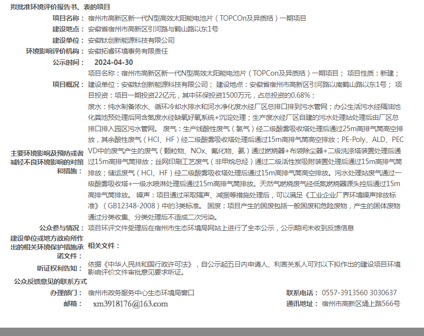 根據建設項目環境影響評價審批程序的有關規定,經審查,我局擬對安徽鈦創新能源科技有限公司《宿州市高新區新一代N型高效太陽能電池片(TOPCOn及異質結)一期項目》環境影響評價文件作出審批意見。為保證此次審查工作的嚴肅性和公正性,現將擬作出審批意見的環境影響評價文件基本情況予以公示 ,公示期為5個工作日。 安徽鈦創新能源科技有限公司宿州市高新區新一代 N 型高效太陽能電池片(TOPCOn 及異質結)一期項目主要的特點有: 1、本項目為新建項目,產品為 TOPCon 太陽能電池及異結構(HJT)太陽能電池,項目位于安徽省宿州市高新區引河路與鶴山路以東 1 號。 2、本項目為宿州市高新區新一代 N 型高效太陽能電池片(TOPCOn 及異質結)一期項目,總投資 22 億元,一期項目建設包括引進購置 5GW TOPCon 及1GW 異質結(HJT)電池片工藝設備,新建電池車間、動力站、原料倉庫、成品倉庫、化學品庫等工程,形成年生產 5GW TOPCon 太陽能電池及 1GW 異質結(HJT)太陽能電池的生產能力。 綜合結論 本項目建設符合國家和地方產業政策要求,項目選址符合當地規劃要求,建設項目所在區域環境質量現狀良好,建設條件和設施較完善,可以滿足建設項目的需要。項目運行期產生的污染物在采取了本報告書提出的防治措施并嚴格落實后,可保證污染物穩定達標排放。參照公眾參與調查結果,公眾對本項目的實施無反對意見。因此,從環境保護的角度分析,本項目的建設是可行的。 上一篇: 能建葛洲壩簽署墨西哥兩個光伏電站項目