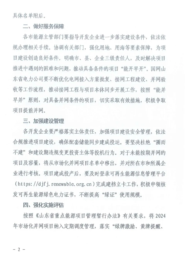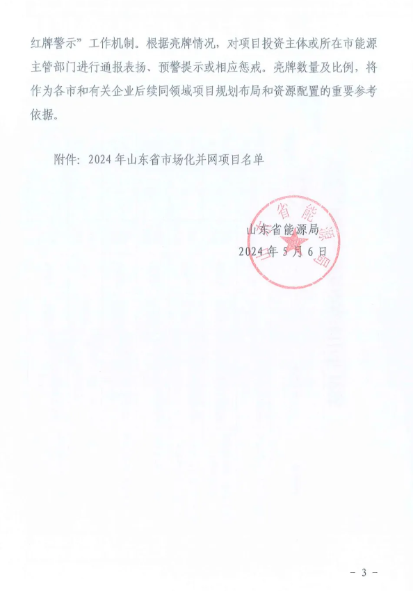 日(ri)前,山(shan)東省能源(yuan)局發(fa)布《關于(yu)公布2024年(nian)市(shi)(shi)場化并網項目(mu)名單(dan)的通(tong)知》,通(tong)知提(ti)到(dao),納入山東省2024年市(shi)(shi)場化并網名單(dan)的項目(mu)共118個、裝機容量(liang)1051.2萬(wan)千瓦,其(qi)中(zhong),光(guang)伏項目(mu)117個共計(ji)1046.2萬(wan)千瓦。