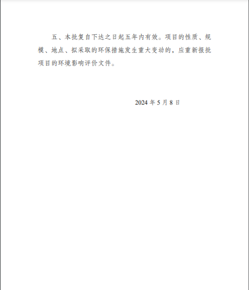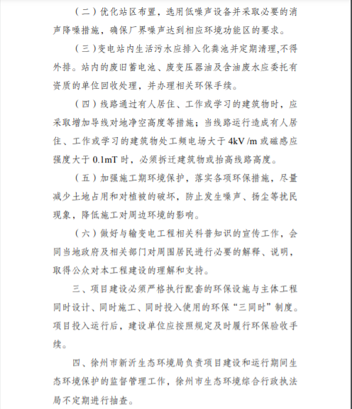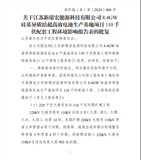 根據建設項目環境影響評價審批程序和建設項目環境影響評價政府信息公開的有關規定,我局對《江蘇新璟宏能源科技有限公司8.4GW硅基異質結超高效電池生產基地項目110千伏配套工程環境影響報告表》已作出批復。現將該建設項目環境影響報告表的批復予以公示。 公示如下: 江蘇新沂經濟開發區管理委員會: 你公司報送的《江蘇新璟宏能源科技有限公司 8.4GW 硅基異質結超高效電池生產基地項目 110 千伏配套工程環境影響報告表》(以下簡稱《報告表》)收悉。經研究,批復如下: 根據報告表評價結論,項目建設具備環境可行性。從環境保護角度考慮,我局同意你公司按《報告表》確定的方案建設江蘇新璟宏能源科技有限公司 8.4GW 硅基異質結超高效電池生產基地項目 110 千伏配套工程。 公示日期:2024年5月10日; 聯系電話:0516-80800685; 傳真:0516-80800699; 通訊地址:徐州新城區行政中心中區東三區456房間(郵編:221018); 行政復議與行政訴訟權利告知:公民、法人或者其他組織認為公示的環境影響評價文件批準決定侵犯其合法權益的,可以自公示期限屆滿之日起六十日內提起行政復議,也可以自公告期限屆滿之日起三個月內提起行政訴訟。