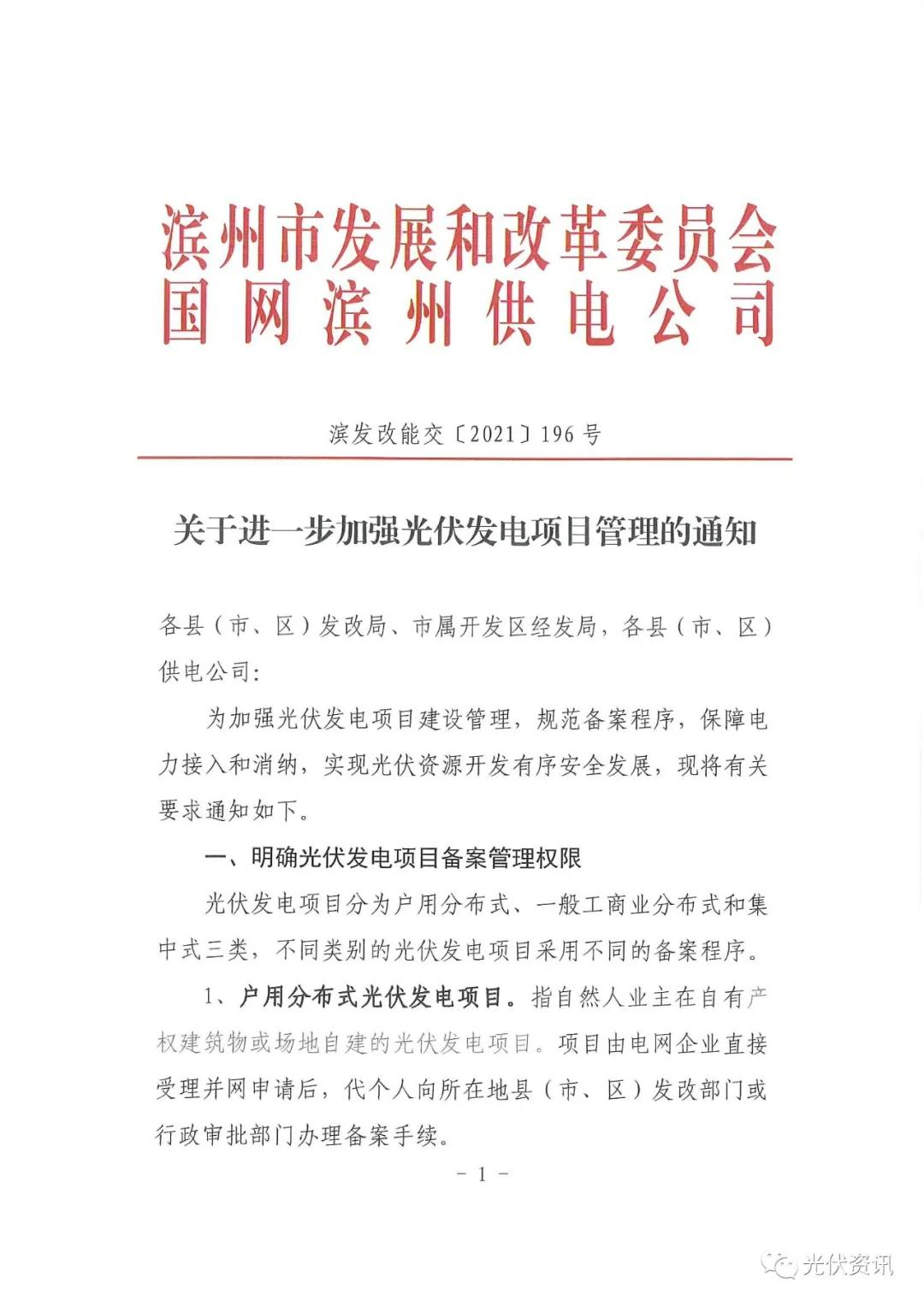 濱州市發改委、國網濱州發布《關于進一步加強光伏發電項目管理的通知》,文件明確光伏發電項目備案管理權限光伏發電項目分為戶用分布式、一般工商業分布式和集中式三類,不同類別的光伏發電項目采用不同的備案程序并嚴格光伏發電項目建設。 (來源:微信公眾號“光伏資訊”ID:PV-info) 戶用分布式光伏發電項目:指自然人業主在自有產權建筑物或場地自建的光伏發電項目。項目由電網企業直接受理并網申請后,代個人向所在地縣(市、區)發改部門或行政審批部門辦理備案手續。 一般工商業分布式光伏發電項目:指黨政機關,學校、醫院、村委會等公共建筑以及工商業業主在自有產權建筑物或場地自建的光伏發電項目,以10千伏及以下電壓等級接入電網,且單點并網裝機容量不超過6兆瓦。項目由所在地縣(市、區)發改部門初審后,報市發改委辦理項目備案手續。 集中式光伏發電項目:指單點并網裝機容量6兆瓦以上的光伏發電項目。該類項目在落實資源聚產業等條件后,全市統一招標進行資源配置。項目由所在地縣(市、區)