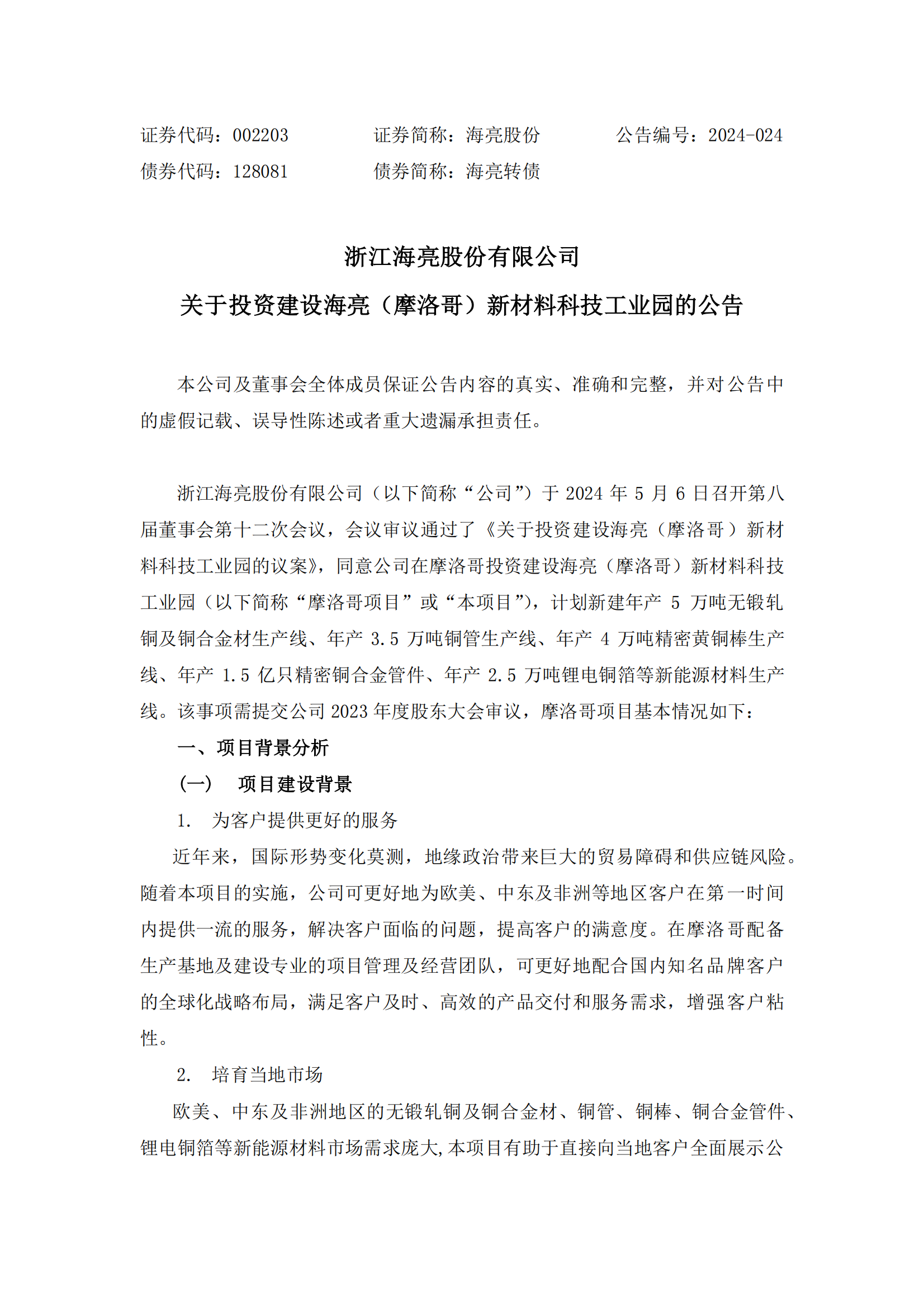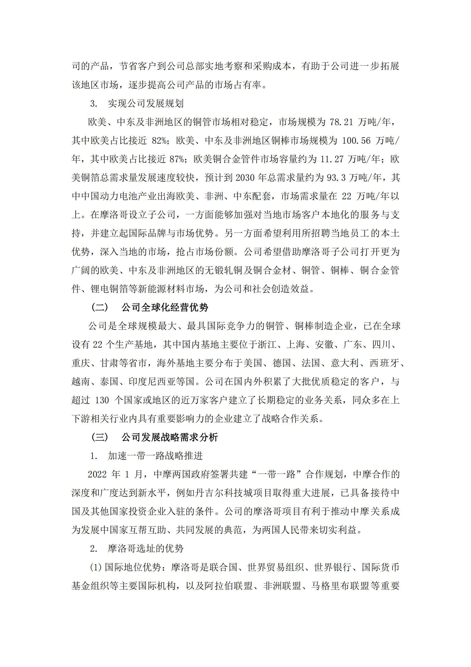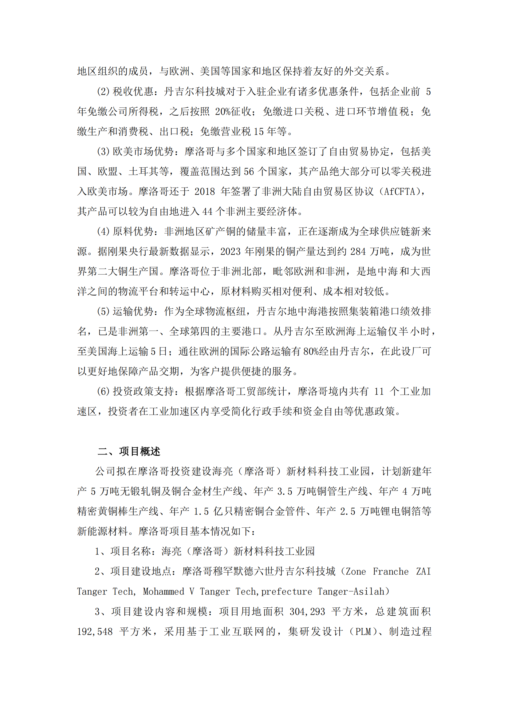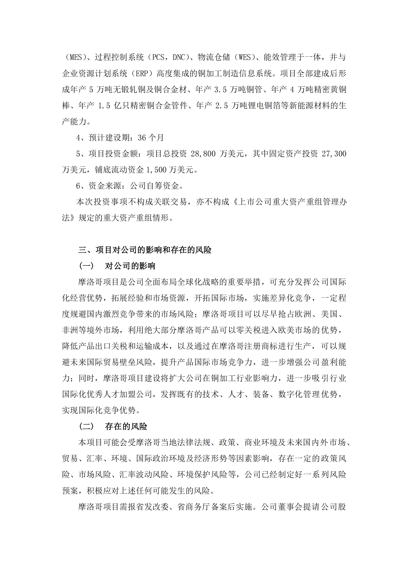 5月8日(ri),浙江(jiang)海亮股份有限(xian)公司發布關于投資建設(she)海亮(摩洛哥)新材(cai)(cai)料科技工業園的(de)公告。該項目計劃(hua)新建年(nian)(nian)產(chan)(chan)(chan)5萬噸無鍛軋銅(tong)(tong)(tong)及銅(tong)(tong)(tong)合金材(cai)(cai)生產(chan)(chan)(chan)線(xian)(xian)、年(nian)(nian)產(chan)(chan)(chan)3.5萬噸銅(tong)(tong)(tong)管(guan)生產(chan)(chan)(chan)線(xian)(xian)、年(nian)(nian)產(chan)(chan)(chan)4萬噸精密黃銅(tong)(tong)(tong)棒生產(chan)(chan)(chan)線(xian)(xian)、年(nian)(nian)產(chan)(chan)(chan)1.5億只精密銅(tong)(tong)(tong)合金管(guan)件、年(nian)(nian)產(chan)(chan)(chan)2.5萬噸鋰電(dian)銅(tong)(tong)(tong)箔等(deng)新能源材(cai)(cai)料生產(chan)(chan)(chan)線(xian)(xian)。 據悉,海亮(liang)(摩洛(luo)哥)新(xin)材料科技(ji)工(gong)業園項目位于(yu)摩洛(luo)哥穆罕默德六世丹(dan)吉爾科技(ji)城(Zone Franche ZAITanger Tech, Mohammed V Tanger Tech,prefecture Tanger-Asilah)。該(gai)項目總投(tou)資(zi)2.88億美元,資(zi)金來源為公(gong)司自籌資(zi)金。 原公告內容如下: