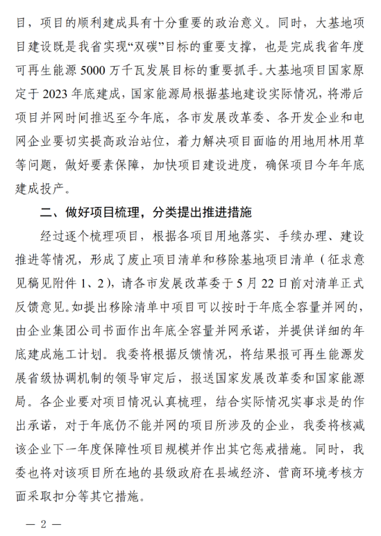 5月17日,陜西發改委印(yin)發《關于(yu)加快推動新能(neng)源大(da)基(ji)地建設進展的通知(zhi)》,就第一批風光大基地推(tui)進(jin)情(qing)況給出有關要求。 根(gen)據文(wen)件,國家(jia)能(neng)源局下發了(le)《關于加(jia)快推(tui)動第一、二、三批以沙漠、戈壁、荒漠地(di)區為(wei)重(zhong)點的(de)大(da)型(xing)風電光(guang)伏(fu)基(ji)地(di)建設的(de)函》,陜西省梳(shu)理(li)了(le)省內大(da)基(ji)地(di)項(xiang)目的(de)推(tui)進(jin)情況,形成了(le)廢(fei)止項(xiang)目清(qing)單和(he)移除基(ji)地(di)項(xiang)目清(qing)單。 文件(jian)指出,第(di)一批大基地原定于2023年底(di)(di)并(bing)網(wang),但根據實際情況可(ke)推遲至(zhi)2024年底(di)(di)并(bing)網(wang),列入移除(chu)清單中的項目如(ru)能(neng)按(an)時并(bing)網(wang),則投資企業需(xu)書面做(zuo)出全容量并(bing)網(wang)的承諾(nuo),并(bing)提(ti)供詳細的建成施(shi)工計(ji)劃(hua)。 對(dui)于承(cheng)諾但不能按時(shi)并網(wang)的企業將在(zai)(zai)下一年度核減其保障性(xing)項目(mu)規模并作出(chu)其他懲(cheng)罰措施(shi),同時(shi)對(dui)項目(mu)所(suo)在(zai)(zai)地的縣(xian)級政(zheng)府在(zai)(zai)評分(fen)方面采(cai)取扣分(fen)等措施(shi)。 各(ge)市發展(zhan)改(gai)革委(wei)、各(ge)開發企業和電網企業要(yao)切實(shi)提(ti)高(gao)政治(zhi)站位,著力解決項目(mu)(mu)面臨(lin)的用(yong)(yong)地(di)用(yong)(yong)林(lin)用(yong)(yong)草等問題,做好要(yao)素保(bao)障,加快項目(mu)(mu)建設進度,確保(bao)項目(mu)(mu)今(jin)年年底建成投(tou)產(chan)。 文件表示(shi),渭南(nan)、延安、榆林市和各有關企業(ye)(ye)要進一步落(luo)實屬地(di)責任和項目(mu)單位主體責任,杜絕等(deng)靠思想(xiang),各市要推(tui)進基地(di)項目(mu)加(jia)快建設(she)(she),協調解決設(she)(she)備招標、土地(di)征(zheng)用、大件運(yun)輸、電網線路過境等(deng)問題;電網企業(ye)(ye)要加(jia)快配(pei)套(tao)電網建設(she)(she),確保接(jie)入工程為(wei)項目(mu)并網做好服務(wu)。 事(shi)實(shi)上,盡管第(di)一(yi)批風光大基地早在(zai)2021年就(jiu)已下發,但受(shou)限于土地、消納、設備價(jia)格等一(yi)系(xi)列(lie)因(yin)素影響, 推進進度則不如預期。根(gen)據(ju)國(guo)家能源局2023年底的最新數據(ju)顯示,第(di)一(yi)批97GW風光大基地實(shi)際(ji)并網規模約45GW左右,并網率不足50%。 陜西省作為第一(yi)批風光大基(ji)地(di)大省,其下發規模(mo)達(da)12.5GW,其業主(zhu)涉及(ji)眾多且單體規模(mo)相對(dui)較小,疊加土地(di)影響,大基(ji)地(di)建設進(jin)度(du)緊張。 今年年初(chu),陜西榆林在(zai)國家林草局、省自然資源廳的聯合督查下,榆林市已(yi)審(shen)批的部分(fen)在(zai)建光伏(fu)項目存在(zai)擅自破壞(huai)草原、改變地表形態等違法違規行為,已(yi)責(ze)令(ling)停工,下發了(le)督辦函(han),要求依法查處整改。 與(yu)之(zhi)對應的(de)是,陜西(xi)發改委(wei)印發《關于新能源基(ji)地(di)項(xiang)(xiang)目延(yan)期并網的(de)通知》,對渭(wei)南市(shi)協調基(ji)地(di)并網問題(ti)、榆林市(shi)新能源項(xiang)(xiang)目的(de)請示給予回復(fu),明確(que)表示同意新能源基(ji)地(di)項(xiang)(xiang)目并網時間延(yan)期至2024年6月30日(ri)。 根據(ju)文件,新能(neng)源基地開展以來,各市及相關(guan)企業積極(ji)辦理前期手(shou)續,大力(li)推進項目開工建設,部分(fen)項目并網(wang),取得了一定進展。但是,仍有部分(fen)項目受(shou)國家(jia)土地林草政策變化影響、冬(dong)春施工揚塵等生態風險(xian)原因尚(shang)未建成投(tou)產。 考慮到相關項目(mu)建設受國家(jia)土地林(lin)草(cao)政策變化等(deng)因(yin)素(su)的(de)實際影響,同意新能源(yuan)基地并網時(shi)間延期(qi)至2024年6月(yue)30日。各(ge)市要積(ji)極協調解決突出問(wen)題,督(du)促相關企業倒(dao)排工期(qi),加快項目(mu)建設。 可以預見的(de)是,土地問題已逐漸成為影響風、光大基地建設進度的(de)關鍵制約因素,如何解(jie)決用地的(de)緊缺與(yu)預防相關性政(zheng)策風險(xian),對每一(yi)個投資商以及項(xiang)目都至關重要(yao)。 下一篇: 湖南能源集團首個GW級光伏項目成功備案