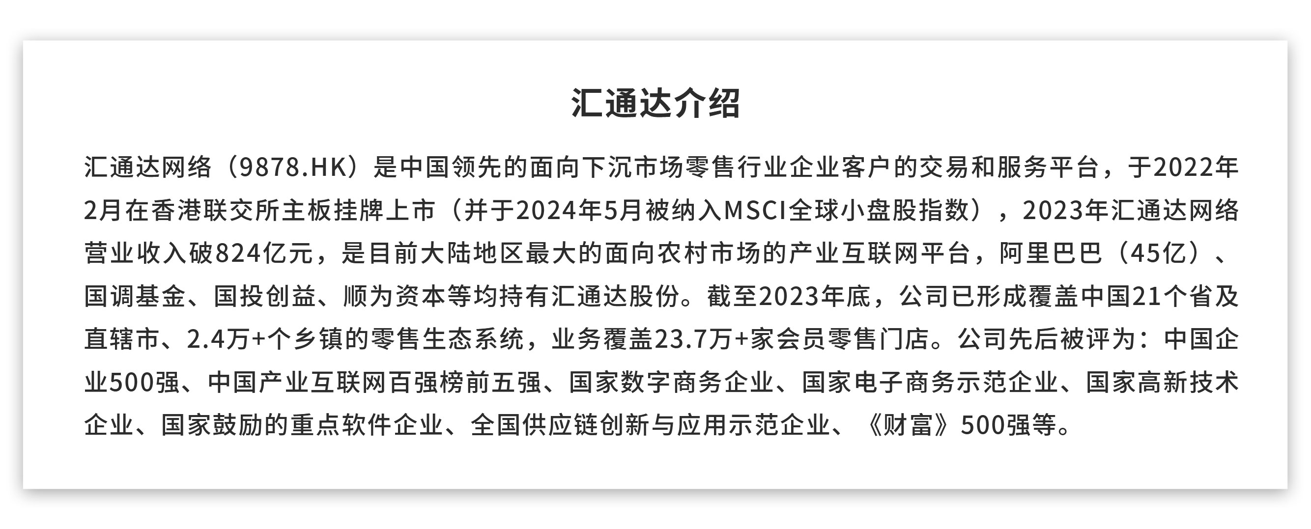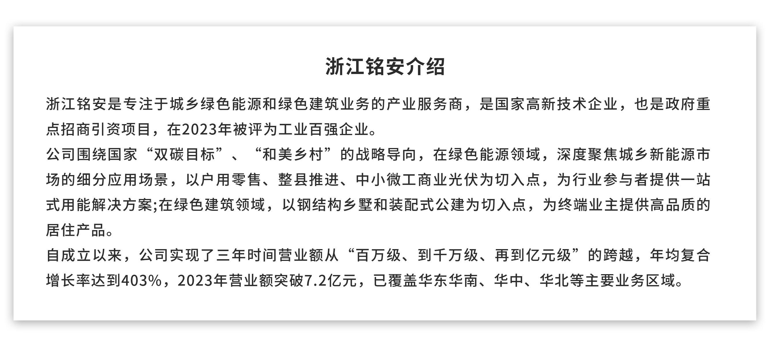 5月29日,匯通(tong)達網絡股份有(you)限公司(股票代碼9878.HK,以下簡(jian)稱匯通(tong)達)與浙江銘安潮居智能科技有限公司(以下簡稱“浙江銘安”)合作簽約暨聯合打造綠色能源產業全國運營中心啟動儀式,在杭州臨平隆重舉行。 臨(lin)平區委(wei)、區政府,臨(lin)平新城(cheng)管(guan)委(wei)會(hui)以及南苑街道相(xiang)關領導,匯通(tong)達(da)(da)副(fu)總(zong)裁(cai)、董(dong)事會(hui)秘書(shu)倪娟,匯通(tong)達(da)(da)助理總(zong)裁(cai)楊盼,浙(zhe)江銘(ming)安(an)創始(shi)人、董(dong)事長褚銘(ming),浙(zhe)江銘(ming)安(an)總(zong)經理孟黎華等出席本次活(huo)動。 在交(jiao)流環節,匯(hui)通(tong)達副總(zong)裁(cai)、董事會秘書倪娟講到,匯(hui)通(tong)達是(shi)國內領先的(de)(de)面向下沉市場(chang)零(ling)售(shou)行業(ye)企業(ye)客戶的(de)(de)交(jiao)易和(he)服務(wu)平(ping)臺,多家(jia)資本大鱷均持有(you)匯(hui)通(tong)達股份。多年(nian)來匯(hui)通(tong)達深耕農(nong)村市場(chang),探索和(he)實踐出一(yi)條以“平(ping)臺+鄉(xiang)鎮店(dian)”為(wei)核(he)心(xin)的(de)(de)高(gao)效率(lv)、高(gao)效能商(shang)業(ye)流通(tong)路徑(jing)。截(jie)至(zhi)2023年(nian)底(di),公司已形成覆蓋中國21個(ge)省及直轄市、2.4萬+個(ge)鄉(xiang)鎮的(de)(de)零(ling)售(shou)生態系統,業(ye)務(wu)覆蓋23.7萬+家(jia)會員零(ling)售(shou)門店(dian),營業(ye)收入(ru)突破(po)824億元。匯(hui)通(tong)達一(yi)直關注(zhu)著浙江銘安,雙方(fang)在發展理念(nian)和(he)戰略目標(biao)方(fang)面不(bu)謀而合(he),希望(wang)以此(ci)次合(he)作為(wei)契機(ji),實現業(ye)務(wu)強耦合(he),形成一(yi)個(ge)互為(wei)賦能、共創(chuang)價值的(de)(de)有(you)機(ji)閉環,共商(shang)分布式光伏(fu)市場機遇。 接(jie)下來,浙江銘(ming)安(an)創始人、董(dong)事長(chang)褚銘(ming)就雙(shuang)方(fang)合作情況進行介紹。褚董(dong)表示,隨(sui)著光(guang)(guang)伏(fu)產(chan)業集成度不斷提高,加深(shen)產(chan)業鏈合作成為(wei)必然的(de)(de)(de)(de)趨勢(shi)。匯通達作為(wei)國(guo)內下沉(chen)市場的(de)(de)(de)(de)龍頭企業,在(zai)國(guo)內特別是在(zai)廣大的(de)(de)(de)(de)農村地區擁有完善的(de)(de)(de)(de)渠道架構(gou)。此次(ci)浙江銘(ming)安(an)與匯通達的(de)(de)(de)(de)合作是公司(si)發展戰略中的(de)(de)(de)(de)重(zhong)要一(yi)環(huan),通過雙(shuang)方(fang)的(de)(de)(de)(de)資源疊加、優勢(shi)互(hu)補,公司(si)將為(wei)社會提供更(geng)為(wei)卓越、可靠的(de)(de)(de)(de)光(guang)(guang)伏(fu)及衍生產(chan)品服務(wu),積極拓展市場份額(e),一(yi)同(tong)為(wei)綠水青山建設貢獻力量(liang)。 本次活動的(de)(de)核心環(huan)節上,浙(zhe)江銘(ming)安與匯通(tong)(tong)達(da)正式(shi)簽約。此次合(he)作將依托匯通(tong)(tong)達(da)網絡的(de)(de)品牌背書和渠(qu)道(dao)資源,浙(zhe)江銘(ming)安的(de)(de)專業(ye)團隊、行業(ye)資源以及(ji)自主SAAS平(ping)臺(tai)優勢,資源疊加、優勢互(hu)補,共同打造上市公司板塊的(de)(de)綠色能源產業(ye)全國運營中(zhong)心,攜手(shou)進軍分(fen)布(bu)式(shi)光伏以及(ji)衍生(sheng)光儲充市場。該業(ye)務計(ji)劃將通(tong)(tong)過6年時間實現60億元的(de)(de)業(ye)績目標,真正成為分(fen)布(bu)式(shi)綠色能源領(ling)域的(de)(de)產業(ye)領(ling)創者。 4月30日召開的(de)中(zhong)央政治(zhi)局會議(yi)審議(yi)了《關于(yu)持續深入(ru)推進長(chang)三角一體化高質量發(fa)(fa)展(zhan)若干(gan)政策措施(shi)的(de)意見(jian)》的(de)方(fang)案,會議(yi)認為要(yao)積極(ji)推進長(chang)三角內(nei)部協同(tong)發(fa)(fa)展(zhan),聯動構建創新(xin)鏈(lian)、產業鏈(lian)、供應鏈(lian),加強(qiang)區域綠色發(fa)(fa)展(zhan)協作。此(ci)次上市(shi)公司匯通達與(yu)浙江銘安合作簽約,是(shi)杭寧(ning)兩(liang)地接軌長(chang)三角一體化產業協同(tong)發(fa)(fa)展(zhan)的(de)體現(xian)。接下(xia)來,雙方(fang)將(jiang)此(ci)次簽約為契機(ji),乘勢而上,緊(jin)抓分(fen)布式光伏發(fa)(fa)展(zhan)新(xin)機(ji)遇,將(jiang)綠色健(jian)康的(de)生活方(fang)式帶(dai)入(ru)千家萬戶,為農村新(xin)能源建設做出(chu)貢(gong)獻。