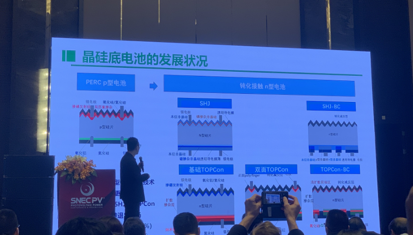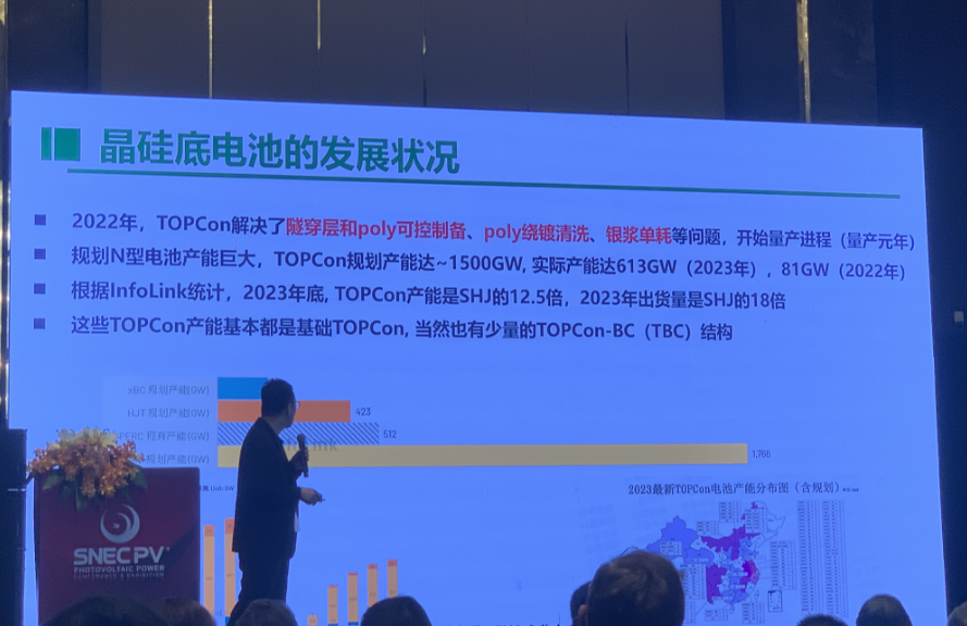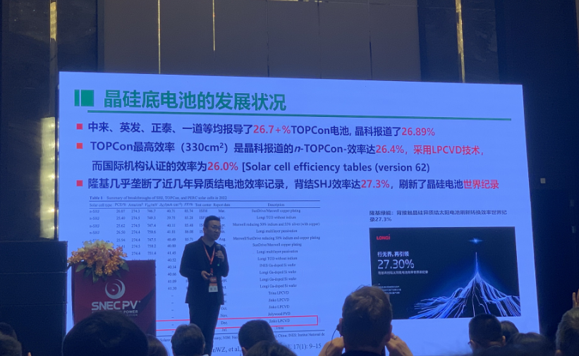 葉(xie)繼春博士在全球光伏前沿技術大會(6):薄膜與鈣鈦礦(kuang)上(shang)針對The Application of Tunnel oxide passivating contact (TOPCon)in the perovskite/c-Si tandem solar cells進行分享。 國家發(fa)(fa)改委預測,光(guang)伏(fu)發(fa)(fa)電(dian)于2060年(nian)(nian)將占我(wo)國發(fa)(fa)電(dian)量60%,是實(shi)現“碳中和”的(de)重要(yao)支(zhi)撐,光(guang)伏(fu)產業2023年(nian)(nian)底制造(zao)端產值為1.75萬(wan)億(yi),按(an)照過去5年(nian)(nian)的(de)速度發(fa)(fa)展(zhan)(+40%/年(nian)(nian)),有望于不久的(de)將來(lai)使產業規模再(zai)上一個臺階,成為國(guo)(guo)家的(de)(準) 支柱(zhu)行業,發(fa)展高效光(guang)伏技術對中國(guo)(guo)實現“碳中和(he)”目標、維護光(guang)伏產業長期穩定發(fa)展具(ju)有(you)重大戰(zhan)略意義。 受限(xian)(xian)子材(cai)(cai)料帶隙對太陽光(guang)譜的(de)(de)利用率(lv)(lv)(lv),晶(jing)體硅(gui)太陽電(dian)池(chi)(chi)(chi)(chi)的(de)(de)理論(lun)極限(xian)(xian)效(xiao)率(lv)(lv)(lv)僅(jin)為29.4%;兩端(duan)疊層(ceng)(ceng)電(dian)池(chi)(chi)(chi)(chi),可以拓(tuo)展太陽光(guang)譜,其(qi)理論(lun)極限(xian)(xian)效(xiao)率(lv)(lv)(lv)達到(dao)(dao)~46%。鈣鈦礦薄膜電(dian)池(chi)(chi)(chi)(chi)具有帶隙可調(diao)、成本較低等(deng)優點(dian),成為疊層(ceng)(ceng)頂(ding)電(dian)池(chi)(chi)(chi)(chi)的(de)(de)理想材(cai)(cai)料。晶(jing)硅(gui)底電(dian)池(chi)(chi)(chi)(chi)具有技術成熟、穩定性好(hao)、產(chan)業規模大等(deng)優點(dian),成為疊層(ceng)(ceng)底電(dian)池(chi)(chi)(chi)(chi)理想材(cai)(cai)料。鈣鈦礦/晶(jing)體硅(gui)疊層(ceng)(ceng)電(dian)池(chi)(chi)(chi)(chi)是國(guo)際研究前(qian)沿熱點(dian),最高(gao)效(xiao)率(lv)(lv)(lv)己經達到(dao)(dao)33.9%,超過晶(jing)體硅(gui)電(dian)池(chi)(chi)(chi)(chi)極限(xian)(xian)效(xiao)率(lv)(lv)(lv)。 2022年,TOPCon解決了隧穿層和poly可控制備、poly繞鍍清洗(xi)、銀漿單耗等問題,開始量產進(jin)程(量產元年)。規劃(hua)N型電池(chi)產能巨大,TOPCon規劃(hua)產能達~1500GW,實際產能達613GW (2023年), 81GW (2022年)。 根據InfoLink統計,2023年底,TOPCon產能(neng)(neng)是SHU的12.5倍(bei),2023年出貨量是SHJ的18倍(bei)。這(zhe)些TOPCon產能(neng)(neng)基(ji)本都(dou)是基(ji)礎TOPCon,當然也有少量的TOPCOn-BC (TBC)結構。 中來、英發、正(zheng)泰、一(yi)道等均報導了26.7+%TOPCon電(dian)池,晶(jing)(jing)科(ke)報道了26.89%。TOPCon最(zui)高效(xiao)率 (330cm2)是晶(jing)(jing)科(ke)報道的八-TOPCon-效(xiao)率達26.4%,采用LPCVD技術,而(er)國(guo)際機構認證的效(xiao)率為26.0% [Solar cellefficiency tables (version 62)。隆(long)基(ji)幾乎壟斷了近幾年異(yi)質結電(dian)池效(xiao)率記錄,背結SHJ效(xiao)率達27.3%,刷新了晶(jing)(jing)硅電(dian)池世界紀錄。