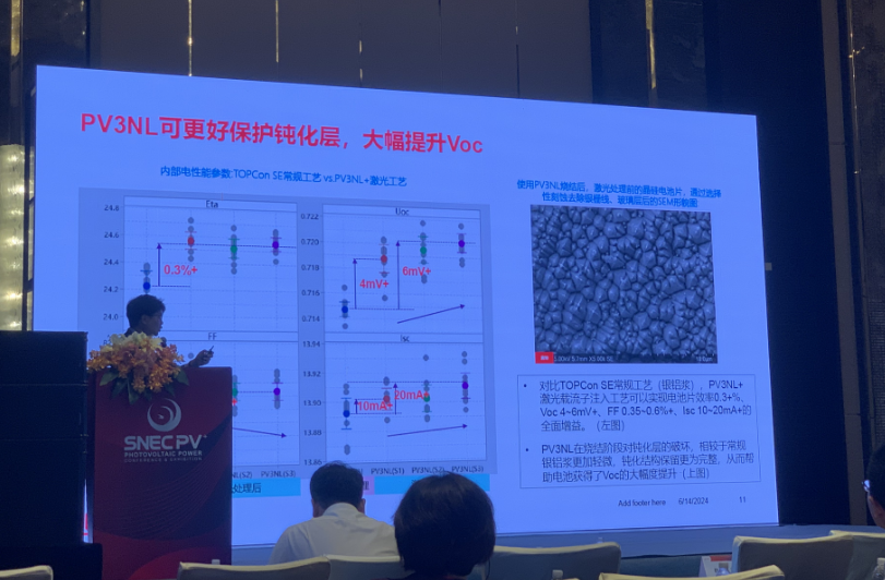 張子男先(xian)生在(zai)全球光(guang)伏前沿技(ji)術(shu)大會(6):異質結與TOPCon電池上針對激(ji)光(guang)載流(liu)子注入(ru)技(ji)術(shu)專用導電漿料方案進行(xing)介(jie)紹。 2023年9月,海(hai)內外多家知名光伏媒(mei)體報道索特成為(wei)全球唯一家激光載流子注(zhu)入技(ji)術專用漿料實現大(da)規模量(liang)產超(chao)1季度的漿料廠商。 PV3NL可更好保護鈍化層,大幅提升VoC。對比TOPCon SE常規工藝(銀鋁漿)PV3NL+ 激光載(zai)流子(zi)注入(ru)工藝可(ke)以實現電池片效率0.3+%Voc 4~6mV+、FF0.35~0.6%+、IsC 10~20mA+的全(quan)面增(zeng)益。PV3NL在燒結(jie)階段對鈍化層的破壞,相較于(yu)常(chang)規銀鋁漿更(geng)加輕微(wei),鈍化結(jie)構保(bao)留更(geng)為完(wan)整,從而(er)幫助(zhu)電池獲得了Voc的大幅度提升(sheng)。 PV3NL在激(ji)光(guang)(guang)誘導下生成區域(yu)觸點,大(da)幅(fu)提升(sheng)(sheng)(sheng)FF。PV3NL可(ke)更好保護鈍化(hua)層,大(da)幅(fu)提升(sheng)(sheng)(sheng)VoC。PV3NL疊加激(ji)光(guang)(guang)載流(liu)子(zi)注(zhu)入技(ji)術(shu)在客(ke)(ke)戶端(duan)實證提效+0.21~0.55%。PV3NL在近20家(jia)客(ke)(ke)戶實證匹配激(ji)光(guang)(guang)載流(liu)子(zi)注(zhu)入技(ji)術(shu),對比(bi)常規TOPCon (SE)實現+0.21-0.55%效率提升(sheng)(sheng)(sheng),絕大(da)部分(fen)的效率增(zeng)(zeng)益來自Voc和FF參(can)數(shu)提升(sheng)(sheng)(sheng),Isc普遍存在小(xiao)幅(fu)增(zeng)(zeng)益。在持續的工(gong)藝優化(hua)下,該項技(ji)術(shu)的效率提升(sheng)(sheng)(sheng)幅(fu)度(du)有望進一步拉大(da)。 索(suo)特TOPCon激光載(zai)流子注入技術全套金屬化方案: 第一正面細柵專用漿料:PV3NL系列產品(pin)。配合激光(guang)載流子(zi)注入工藝(yi),對(dui)比常規(gui)TOPCon (SE)電池,產效率(lv)大幅增益可(ke)以實(shi)現(xian)量可(ke)匹配10um開口(kou)的(de)無網(wang)結網(wang)版(ban)使(shi)用,印刷性(xing)、控(kong)線能力優秀,優異的(de)抗(kang)醋酸腐(fu)蝕特性(xing)、抗(kang)脫(tuo)粉特性(xing),穩健(jian)的(de)單(dan)、雙玻組件可(ke)靠性(xing)表現(xian)。 第二背面細柵專(zhuan)用漿料(liao):PVGNL系列產品(pin) 寬的工(gong)藝窗口,保證(zheng)背面(mian)接觸需(xu)求多梯度低濕重、低固含選項(xiang)。 第三正、背面主柵專用漿料:PVD2L系列(lie)產品(pin) 寬(kuan)的工藝(yi)窗(chuang)口(kou),燒結溫度(du)大幅降溫的同時(shi),仍可保證拉力(li)穩定、多梯度(du)低(di)固含選(xuan)項、優秀的印刷良率、燒結EL良率。