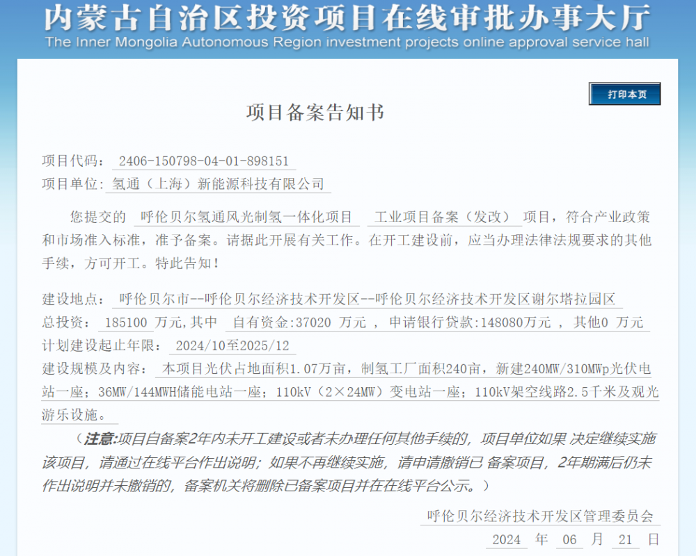 6月(yue)21日,呼倫(lun)貝爾氫通風光制氫一(yi)體化項目工業項目備案,申報單位為氫通(上海)新能源科(ke)技有限公(gong)司。 該(gai)項目位(wei)于呼倫貝爾經濟技術開(kai)發區(qu)謝爾塔拉園區(qu),總投資185100萬元,計劃2024年(nian)10月開(kai)工,2025年(nian)12月完工。 氫通(tong)新(xin)能源(yuan)成立于2020年5月,總(zong)部(bu)位于上海(hai)。公(gong)司(si)曾以燃料電(dian)(dian)池(chi)系(xi)統(tong)為主(zhu)營,已經(jing)開發(fa)(fa)完成80kW、110kW、130kW燃料電(dian)(dian)池(chi)系(xi)統(tong)的(de)產品設計,并正在(zai)開發(fa)(fa)針對礦卡大功(gong)率(lv)應用場景的(de)180kW、220kW、300kW氫燃料電(dian)(dian)池(chi)系(xi)統(tong)。今(jin)年以來公(gong)司(si)加(jia)強上游(you)布局,從制氫角(jiao)度開始(shi)發(fa)(fa)力進行全產業鏈投(tou)資和(he)建設,今(jin)年2月5日,氫通(tong)新(xin)能源(yuan)與(yu)新(xin)疆伊吾縣人民政(zheng)府簽(qian)(qian)訂投(tou)資協議,將(jiang)投(tou)資31.2億(yi)元,建設產能5000臺/年氫燃料電(dian)(dian)池(chi)系(xi)統(tong)生(sheng)產工廠、500MW風光發(fa)(fa)電(dian)(dian)、制氫工廠、加(jia)氫站、氫能車輛運力平臺等板塊。4月24日,氫通(tong)新(xin)能源(yuan)已與(yu)華能新(xin)能源(yuan)股份有(you)限公(gong)司(si)簽(qian)(qian)約內(nei)蒙古呼倫貝爾經(jing)濟技術開發(fa)(fa)區240MW/310.4MWp觀光牧(mu)場光伏發(fa)(fa)電(dian)(dian)站和(he)8710噸/年電(dian)(dian)解水制氫項(xiang)(xiang)目。項(xiang)(xiang)目建成后,年發(fa)(fa)電(dian)(dian)量為5.08億(yi)kW·h,年制氫量約為8710噸,年制氧量約為69680噸。