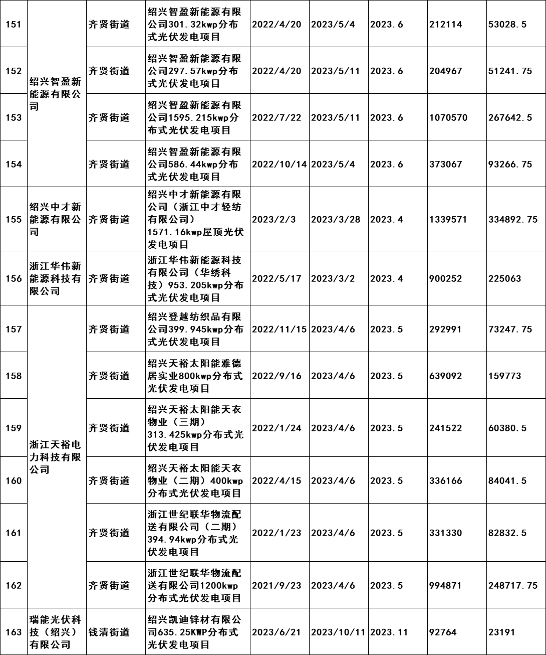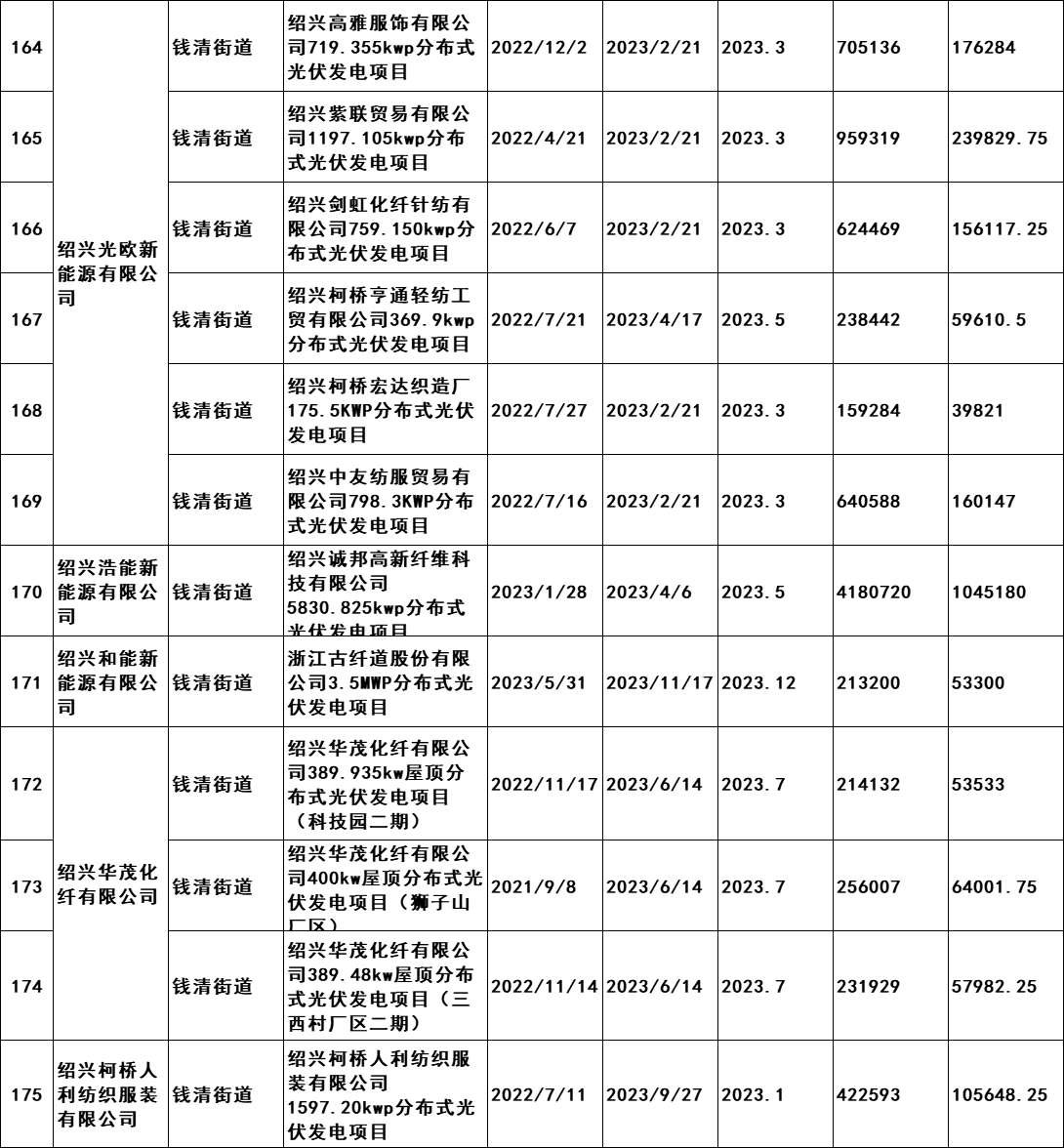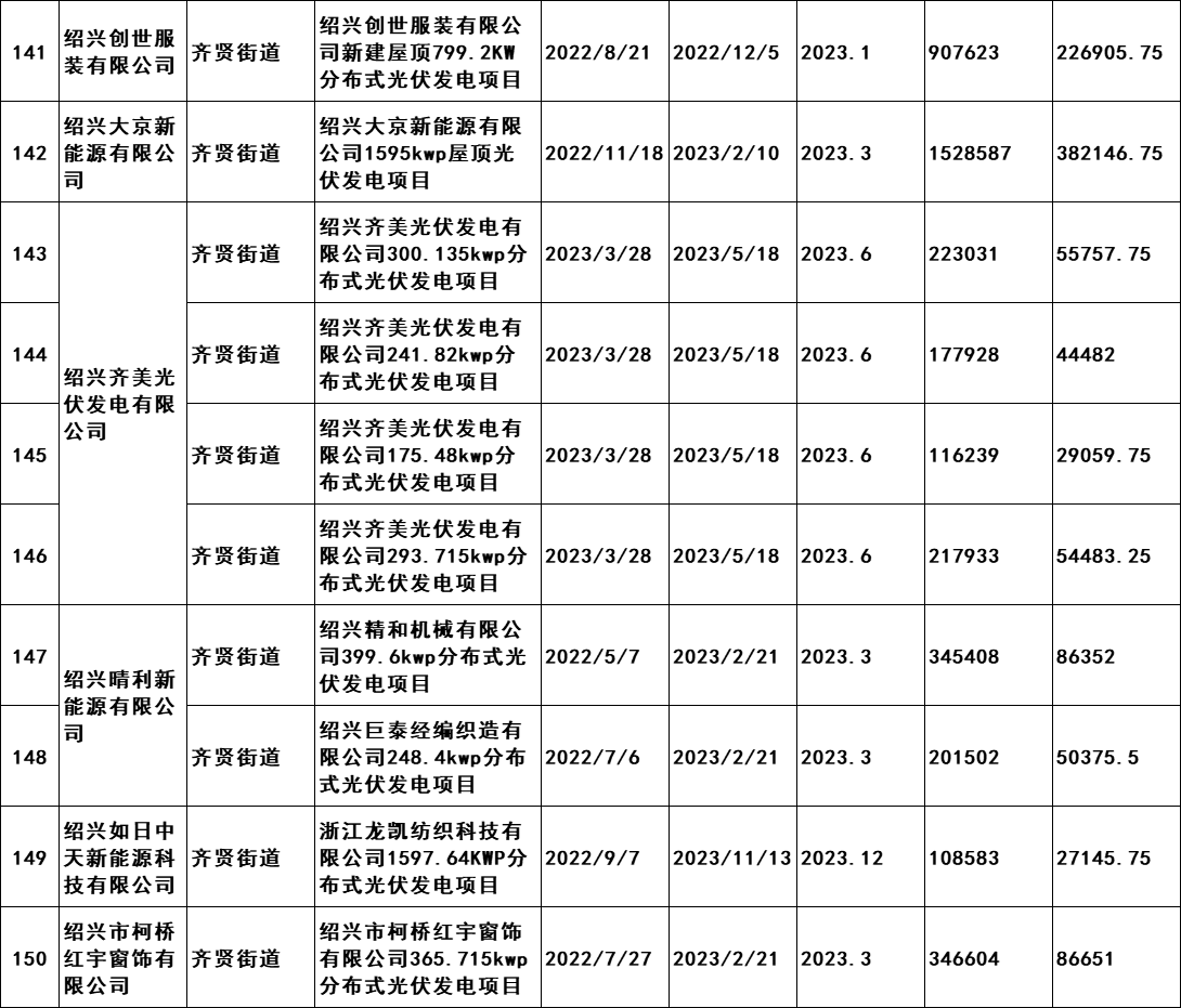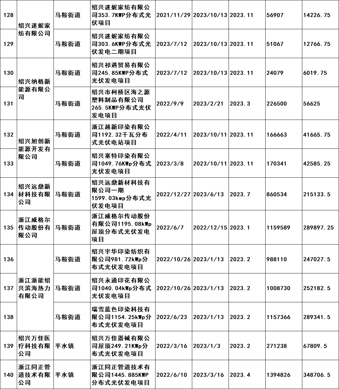 7月2日,浙江紹興市柯橋區發展和改革局發布《關于擬兌現2023年度非戶用分布式光伏發電項目發電量補助的公示》。公示文件顯示,共計190個項目符合補助兌現要求,擬補助總發電量105869402千瓦時,總金額26467350.5元,由此得出補貼標準為0.25元/KWH。從并網時間,本次獲的補貼的項目2021年并網36個,2022年并網127個,2023年并網28個。補貼開始時間均為2023年。 原文如下: 關于擬兌現2023年度非戶用分布式光伏發電項目發電量補助的公示 我區2023年度非戶用分布式光伏發電項目發電量補助兌現的前期申報工作已經完成,根據審核,共計190個項目符合補助兌現要求,擬補助總發電量105869402千瓦時,總金額26467350.5元。補助將在公示后通過瑞豐銀行進行發放,具體名單附后。 現按要求進行公示,公示時間為2024年7月2日至7月8日。如有意見,請于公示期內將書面意見反映至區發改局能源發展科(為便于溝通,請簽署或告知真實姓名、工作單位和聯系方式),并提供證明材料。來信請寄柯橋區群賢路1661號柯橋區發展和改革局能源發展科,電話:84780700。 附件:柯橋區整區屋頂分布式光伏開發試點建設補助明細表 紹興市柯橋區發展和改革局 2024年7月2日 附件:柯橋區整區屋頂分布式光伏開發試點建設補助明細表