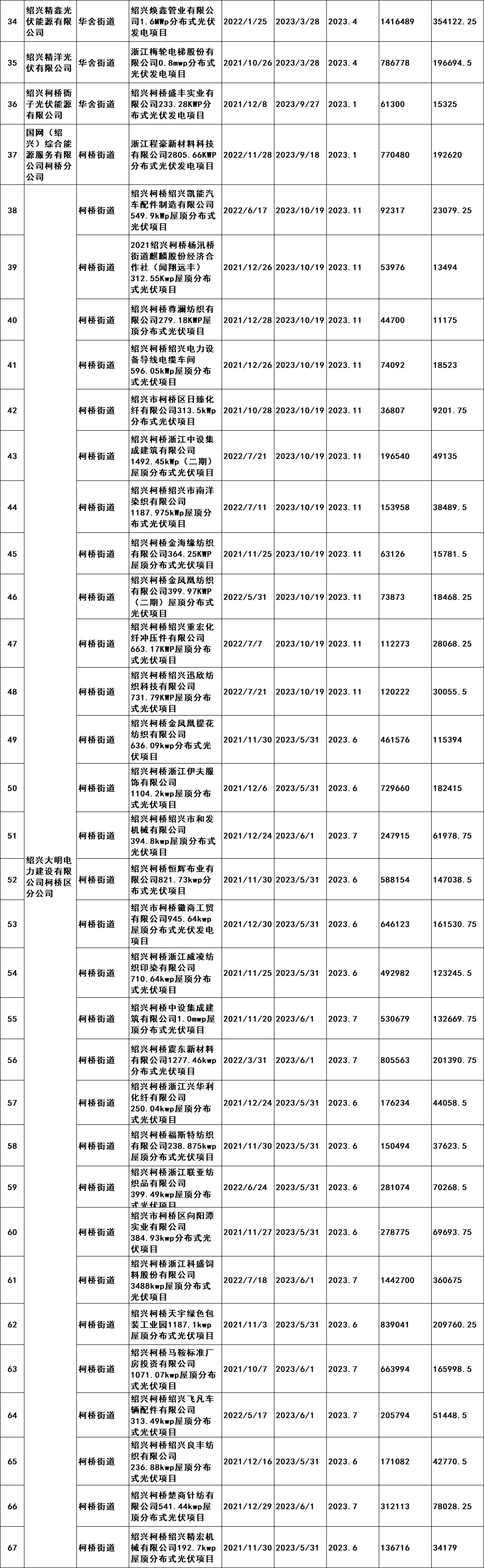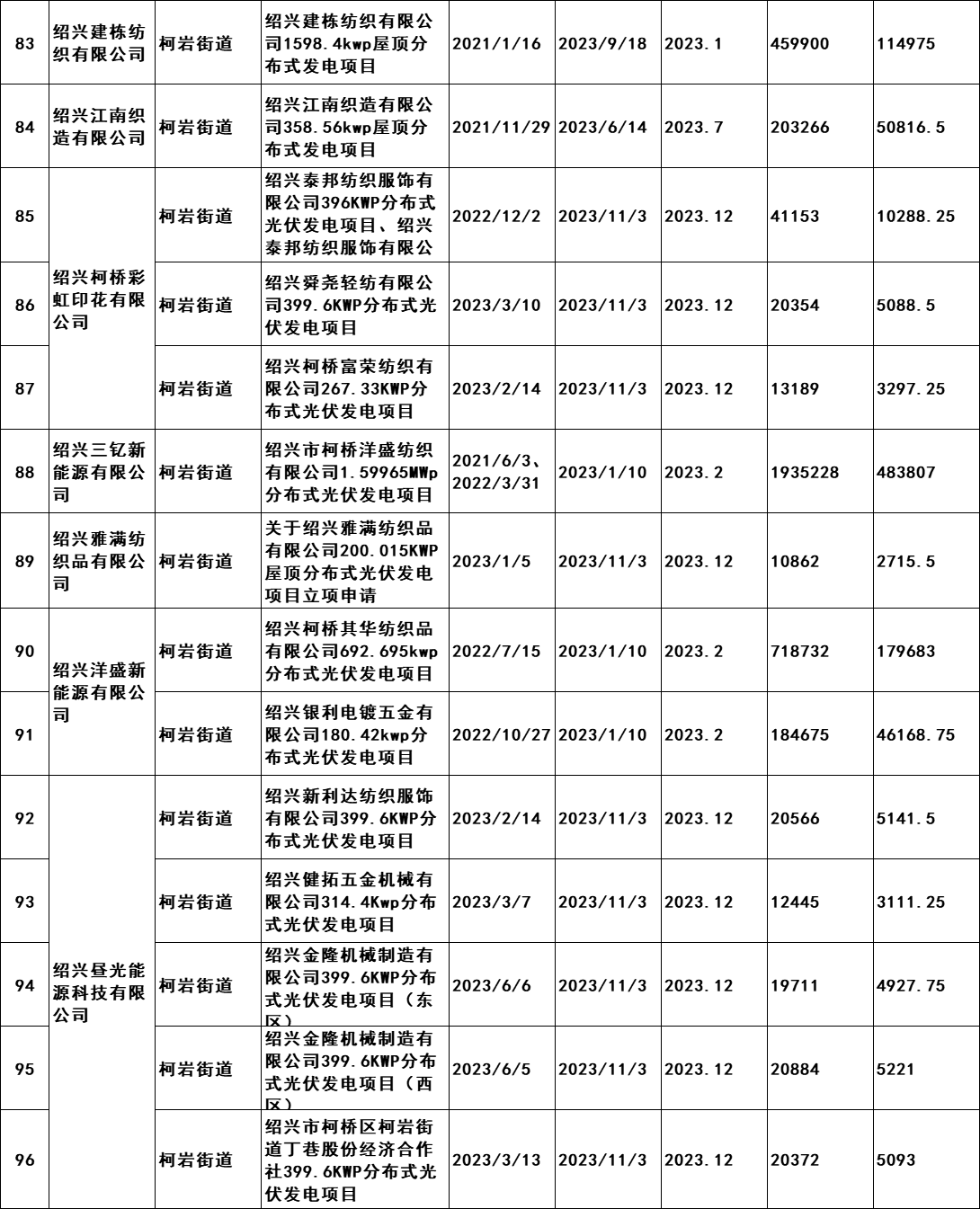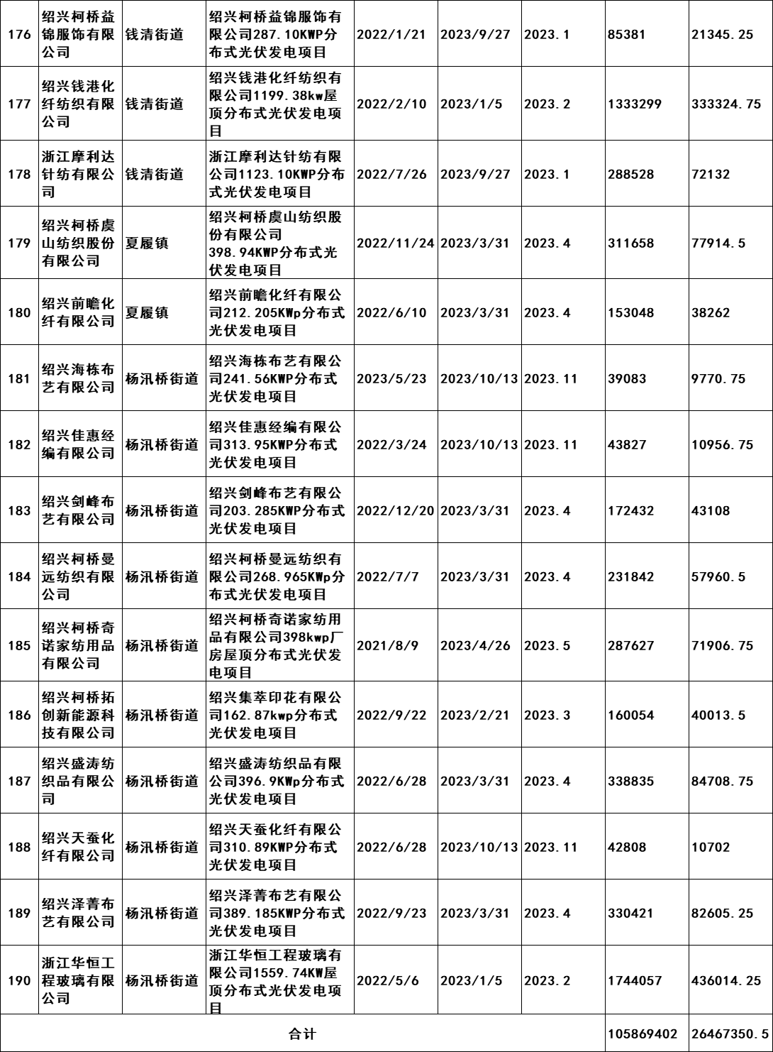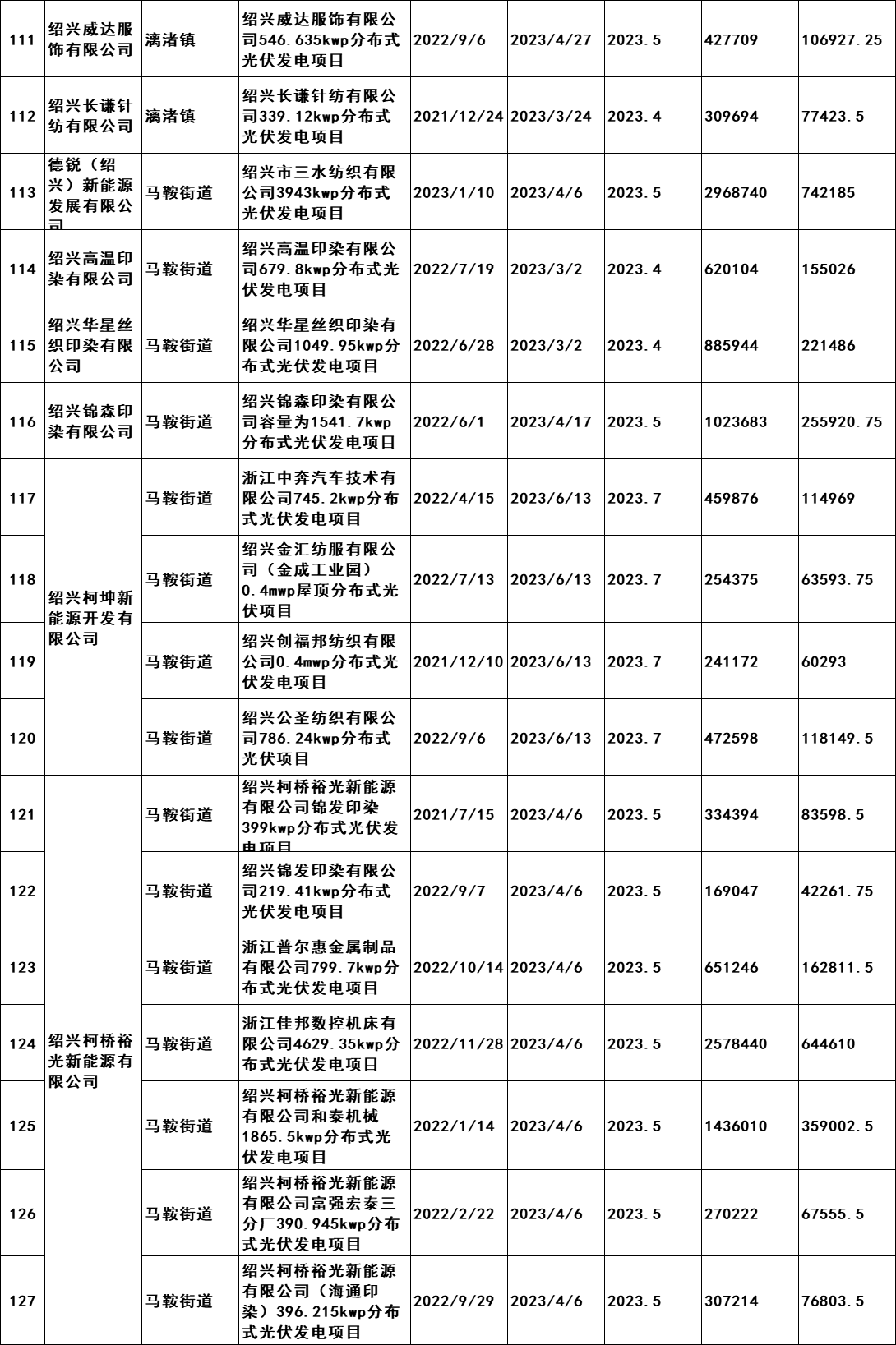 7月2日,浙江紹興市柯橋區發展和改革局發布《關于擬兌現2023年度非戶用分布式光伏發電項目發電量補助的公示》。公示文件顯示,共計190個項目符合補助兌現要求,擬補助總發電量105869402千瓦時,總金額26467350.5元,由此得出補貼標準為0.25元/KWH。從并網時間,本次獲的補貼的項目2021年并網36個,2022年并網127個,2023年并網28個。補貼開始時間均為2023年。 原文如下: 關于擬兌現2023年度非戶用分布式光伏發電項目發電量補助的公示 我區2023年度非戶用分布式光伏發電項目發電量補助兌現的前期申報工作已經完成,根據審核,共計190個項目符合補助兌現要求,擬補助總發電量105869402千瓦時,總金額26467350.5元。補助將在公示后通過瑞豐銀行進行發放,具體名單附后。 現按要求進行公示,公示時間為2024年7月2日至7月8日。如有意見,請于公示期內將書面意見反映至區發改局能源發展科(為便于溝通,請簽署或告知真實姓名、工作單位和聯系方式),并提供證明材料。來信請寄柯橋區群賢路1661號柯橋區發展和改革局能源發展科,電話:84780700。 附件:柯橋區整區屋頂分布式光伏開發試點建設補助明細表 紹興市柯橋區發展和改革局 2024年7月2日 附件:柯橋區整區屋頂分布式光伏開發試點建設補助明細表