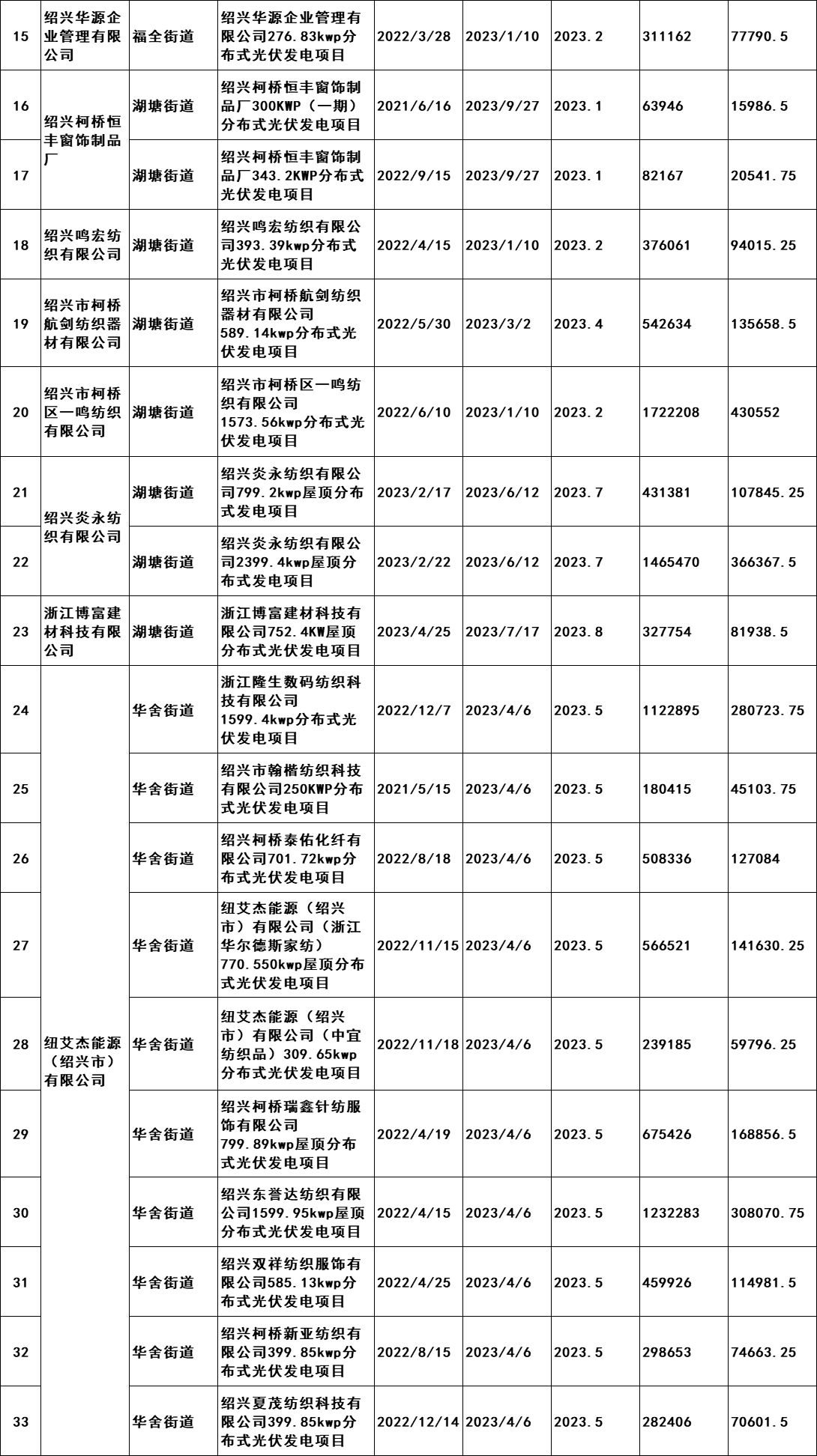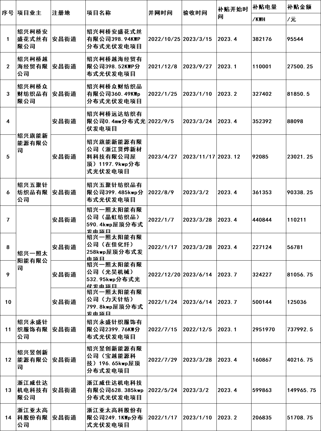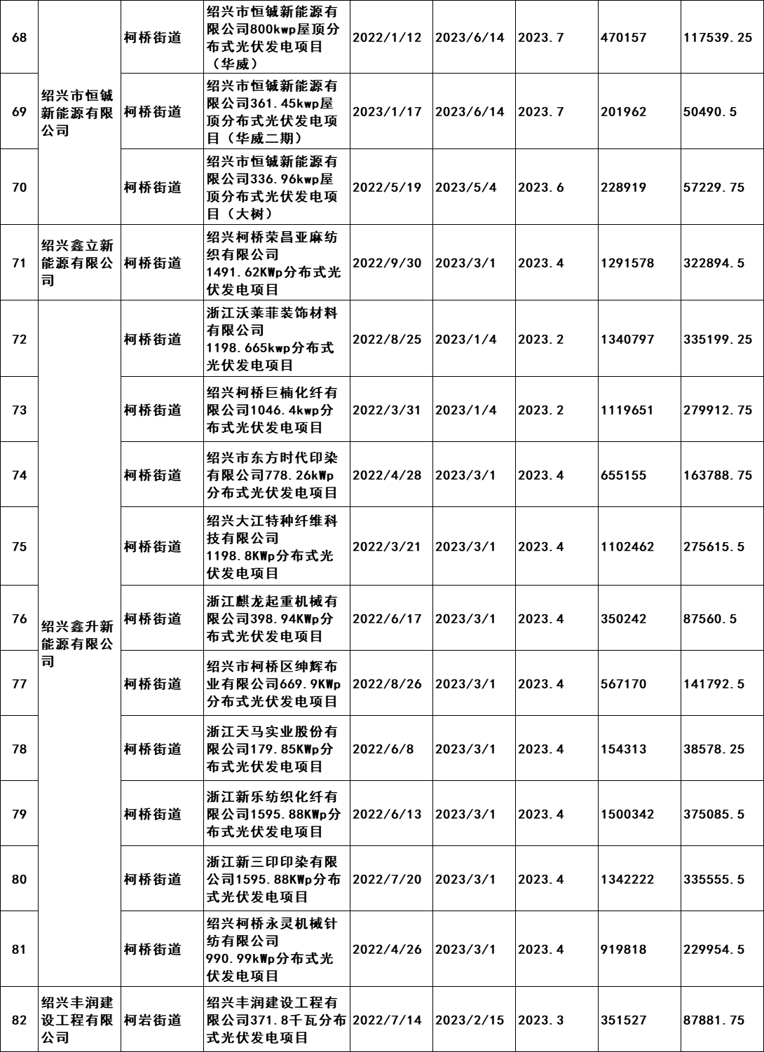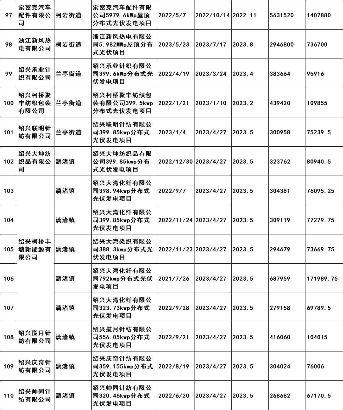 7月2日,浙江紹興市柯橋區發展和改革局發布《關于擬兌現2023年度非戶用分布式光伏發電項目發電量補助的公示》。公示文件顯示,共計190個項目符合補助兌現要求,擬補助總發電量105869402千瓦時,總金額26467350.5元,由此得出補貼標準為0.25元/KWH。從并網時間,本次獲的補貼的項目2021年并網36個,2022年并網127個,2023年并網28個。補貼開始時間均為2023年。 原文如下: 關于擬兌現2023年度非戶用分布式光伏發電項目發電量補助的公示 我區2023年度非戶用分布式光伏發電項目發電量補助兌現的前期申報工作已經完成,根據審核,共計190個項目符合補助兌現要求,擬補助總發電量105869402千瓦時,總金額26467350.5元。補助將在公示后通過瑞豐銀行進行發放,具體名單附后。 現按要求進行公示,公示時間為2024年7月2日至7月8日。如有意見,請于公示期內將書面意見反映至區發改局能源發展科(為便于溝通,請簽署或告知真實姓名、工作單位和聯系方式),并提供證明材料。來信請寄柯橋區群賢路1661號柯橋區發展和改革局能源發展科,電話:84780700。 附件:柯橋區整區屋頂分布式光伏開發試點建設補助明細表 紹興市柯橋區發展和改革局 2024年7月2日 附件:柯橋區整區屋頂分布式光伏開發試點建設補助明細表