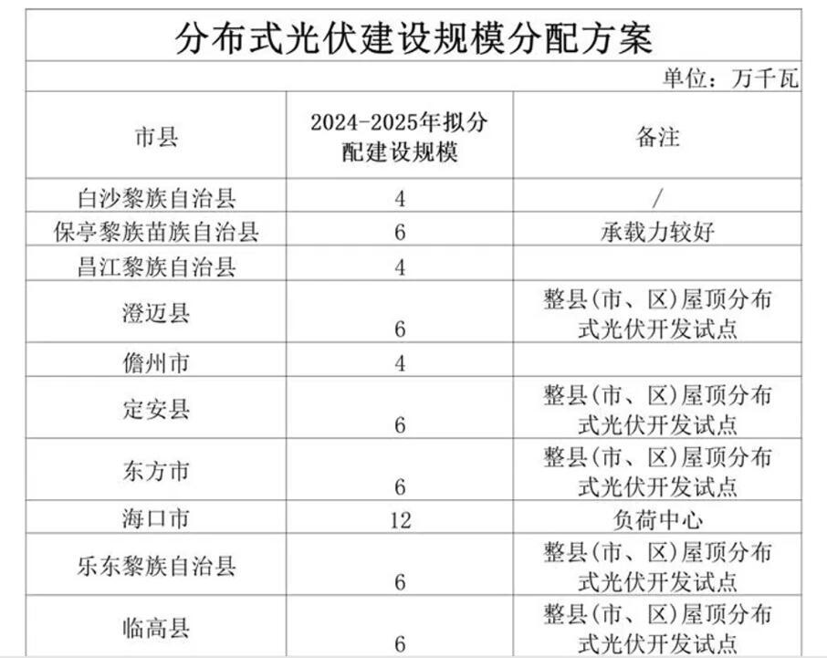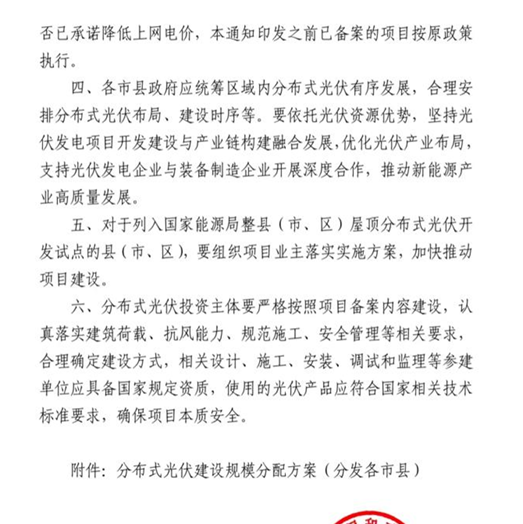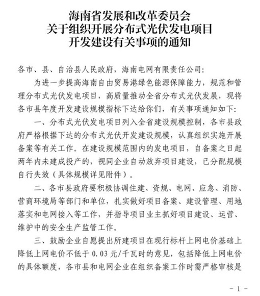 近日,海南省發展和改革委員會發布了關于組織開展分布式光伏發電項目開發建設有關事項的通知。通知指出:鼓勵企業自愿提出所建項目在現行標桿上網電價基礎上降低上網電價不低于0.03元/千瓦時的意見,包括降低上網電價的具體額度,各市縣和電網企業在組織備案工作時需嚴格審核是否已承諾降低上網電價,本通知印發之前已備案的項目按原政策執行。 原文如下: 海南省發展和改革委員會 關于組織開展分布式光伏發電項目 開發建設有關事項的通知 各市、縣、自治縣人民政府,海南電網有限責任公司: 為進一步提高海南自由貿易港綠色能源保障能力,規范和管理分布式光伏發電項目,高質量推動全省分布式光伏發展,現將各市縣年度開發建設規模指標下達給你們,有關事項通知如下: 一、分布式光伏發電項目列入全省建設規模控制,各市縣政府嚴格根據下達的分布式光伏開發建設規模,認真組織實施開展備案等有關工作。在建設規模范圍內的發電項目,自備案之日起兩年內未建成投產的,視同企業自動放棄項目建設,已分配規模自行失效(具體規模詳見附件)。 二、各市縣政府要積極協調住建、資規、電網、應急、消防、營商環境局等部門和單位,扎實做好項目備案、建設管理、用地落實和電網接入等工作,并指導項目業主抓好項目建設、運營、維護中的安全生產監管工作。 三、鼓勵企業自愿提出所建項目在現行標桿上網電價基礎上降低上網電價不低于0.03元/千瓦時的意見,包括降低上網電價的具體額度,各市縣和電網企業在組織備案工作時需嚴格審核是否已承諾降低上網電價,本通知印發之前已備案的項目按原政策執行。 四、各市縣政府應統籌區域內分布式光伏有序發展,合理安排分布式光伏布局、建設時序等。要依托光伏資源優勢,堅持光伏發電項目開發建設與產業鏈構建融合發展,優化光伏產業布局,支持光伏發電企業與裝備制造企業開展深度合作,推動新能源產業高質量發展。 五、對于列入國家能源局整縣(市、區)屋頂分布式光伏開發試點的縣(市、區),要組織項目業主落實實施方案,加快推動項目建設。 六、分布式光伏投資主體要嚴格按照項目備案內容建設,認真落實建筑荷載、抗風能力、規范施工、安全管理等相關要求,合理確定建設方式,相關設計、施工、安裝、調試和監理等參建單位應具備國家規定資質,使用的光伏產品應符合國家相關技術標準要求,確保項目本質安全。 附件:分布式光伏建設規模分配方案(分發各市縣)