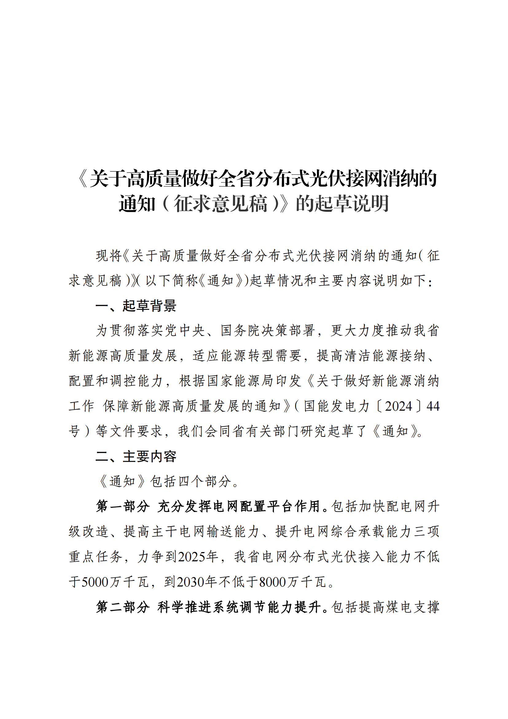 7月16日,江蘇省發展和改革委員會發布關于公開征求《關于高質量做好全省分布式光伏接網消納的通知(征求意見稿)》意見的通告。 公告顯示,大力推進儲能建設。積極開展抽水蓄能電站規劃布局,加快建設連云港抽水蓄能電站項目,充分利用電化學儲能響應快、配置靈活等優勢,重點發展電網側儲能,加快華能金壇、國信淮安等鹽穴壓縮空氣儲能項目建設,研究探索長時長儲能技術試點應用,提高儲能運行效率。到 2025年,全省抽水蓄能和新型儲能裝機規模達到約 900 萬千瓦,到 2030 年達到約 1300 萬千瓦。 原文件內容如下: 關于公開征求《關于高質量做好全省分布式光伏接網消納的通知(征求意見稿)》意見的通告 為進一步做好新形勢下分布式光伏接網消納工作,提升對新能源的消納能力,加快構建新型電力系統,我們起草了《關于高質量做好全省分布式光伏接網消納的通知(征求意見稿)》(見附件),現向全社會公開征求意見。如有修改意見,請于7月23日前反饋至省發展改革委(能源局)電力處。 公開征求意見時間:2024年7月16日至7月23日 郵箱:jsmtdlc@163.com,電話:025-83390366,025-83390126。 附件: 1. 關于高質量做好分布式光伏接網消納工作的通知(征求意見稿).pdf 2.《關于高質量做好全省分布式光伏接網消納的通知(征求意見稿)》的起草說明.pdf 江蘇省發展和改革委員會 2024年7月16日 附件1: 關于高質量做好全省分布式光伏接網消納的通知 (征求意見稿) 各設區市發展改革委,省電力公司,有關電力企業: 為進一步做好新形勢下分布式光伏接網消納工作,提升對新能源的消納能力,加快構建新型電力系統,現就有關事項通知如下。 一、充分發揮電網配置平臺作用 (一)加快配電網升級改造。積極適應大規模分布式光伏快速發展的新形勢,有針對性地開展全省城鄉新型配電網的規劃構造,堅持系統思維和問題導向,適度超前規劃建設,有序加大配電網投資力度,加快建設滿足分布式光伏規模化開發和就近消納要求的新型智能配電網。2024-2025 年,我省配電網計劃投資共約400億元;2026-2030年,我省配電網計劃投資共約1100億元。 (二)提高主干電網輸送能力。不斷優化電網結構,加 強縣域電網與主網聯系,保障分布式光伏匯集外送,提高主要斷面輸送能力,通過 500千伏東通道加強、西通道增容擴建、揚鎮過江交流改直流等工程,提高蘇北和沿海地區的新能源接網和外送能力。到2025 年,我省北電南送過江輸電通道能力達到約 2500萬千瓦,到2030年提高到約 2800 萬千瓦。 (三)提升電網綜合承載能力。 創新應用數字化技術, 加強配電網層面源網荷儲協同調控,有序開展交直流混合配電網、柔性互聯等新技術應用,綜合采用運方調整、網架延伸、配變增容布點等多種手段,逐步構建主配微網協同的新型有源配電網調度運行模式,提升電網綜合承載力和靈活性。到 2025 年,我省電網分布式光伏接入能力不低于 5000萬千瓦,到2030年不低于 8000萬千瓦。 二、科學推進系統調節能力提升 ( 一)提高煤電支撐能力。堅持“先立后改”,科學合理優化煤電布局,在負荷中心和重要城市周邊規劃建設一批兜底保障煤電,充分發揮支撐性清潔煤電對促進可再生能源消納的調節性作用,確保華能太倉、國能常州和國信沙洲等項目按時投運,加快推進國電投濱海、大唐呂四、華電望亭、中電常熟等項目。到2025 年,我省清潔燃煤發電裝機達到約 9000萬千瓦,到 2030 年達到約1億千瓦。 (二)加快調峰燃機建設。按照有序適度的原則,重點考慮在電網分區平衡有缺口、網架支撐薄弱、調峰需求較大的地區布局發展調峰燃機項目,加快推進華能南通、大唐南電、華電望亭等燃氣輪機創新發展示范項目建設。到2025年,全省各類燃氣發電裝機達到約 2250萬千瓦,到 2030 年達到約 2800萬千瓦。 (三)大力推進儲能建設。積極開展抽水蓄能電站規劃布局,加快建設連云港抽水蓄能電站項目,充分利用電化學儲能響應快、配置靈活等優勢,重點發展電網側儲能,加快華能金壇、國信淮安等鹽穴壓縮空氣儲能項目建設,研究探 索長時長儲能技術試點應用,提高儲能運行效率。到2025年,全省抽水蓄能和新型儲能裝機規模達到約900 萬千瓦,到 2030 年達到約1300萬千瓦。 三、積極促進網源協調發展 (一)加強配電網規劃引導。各設區市發展改革委要按照《國家能源局關于做好新能源消納工作保障新能源高質量發展的通知》(國能發電力[2024]44號)的要求, 科學研判各地新能源消納利用情況,部分資源條件較好的地區可適當放寬新能源消納利用率條件,并開展年度動態評估。各設區市發展改革委要結合新能源消納形勢,以服務分布式光伏發展為重點,組織各縣(區)電力主管部門和電網企業定期開展配電網規劃工作。特別在分布式光伏發展較快的地區,如縣(區)分布式光伏滲透率超過 50%,應及時啟動專項配電網規劃工作,進一步加強規劃深度并形成滾動調整機制,規劃中應將分布式光伏開發規模和布局作為規劃重要邊界條件予以明確,要根據分布式光伏發展現狀、資源情況、負荷水平和電網承載力等,有針對性地做好分布式光伏項目的接網消納方案。省電力公司配合電力主管部門,根據配電網規劃深度要求,于今年8月15日前編制專項配電網規劃大綱和模板供各地參考。 (二)動態評估電網承載力。各設區市發展改革委要按照國家能源局《分布式光伏接入電網承載力及提