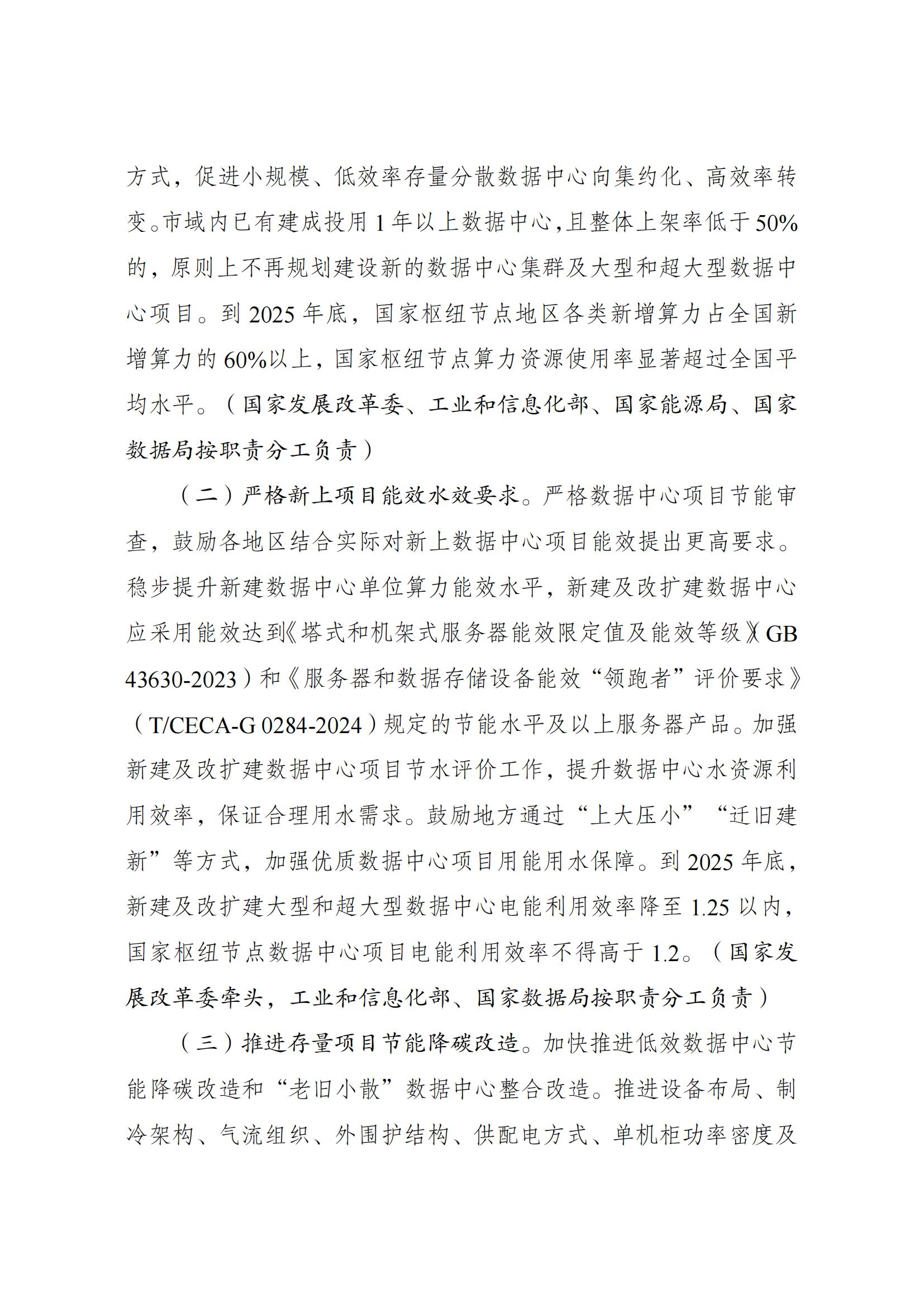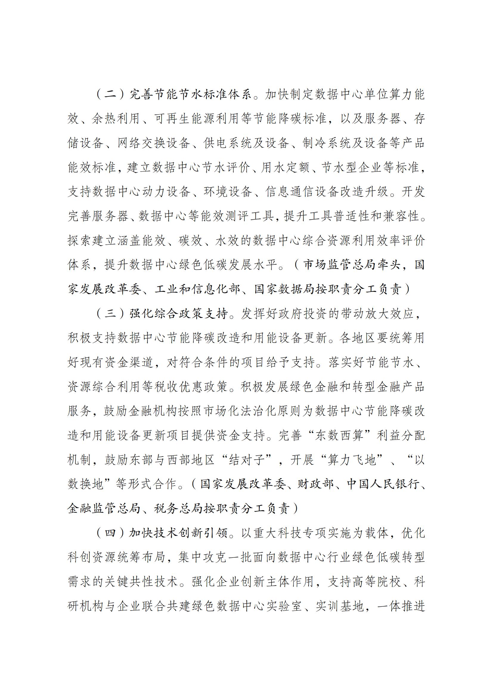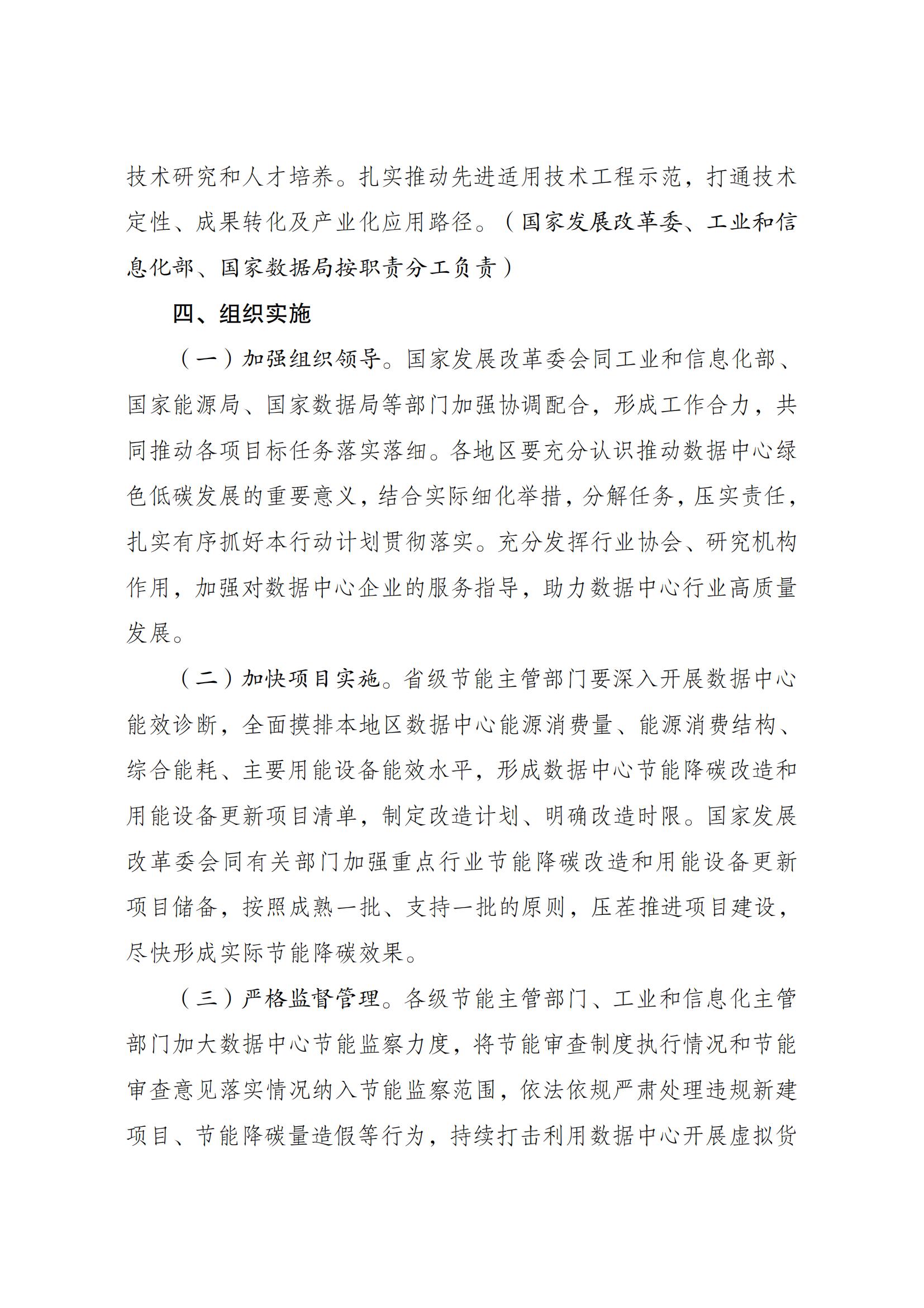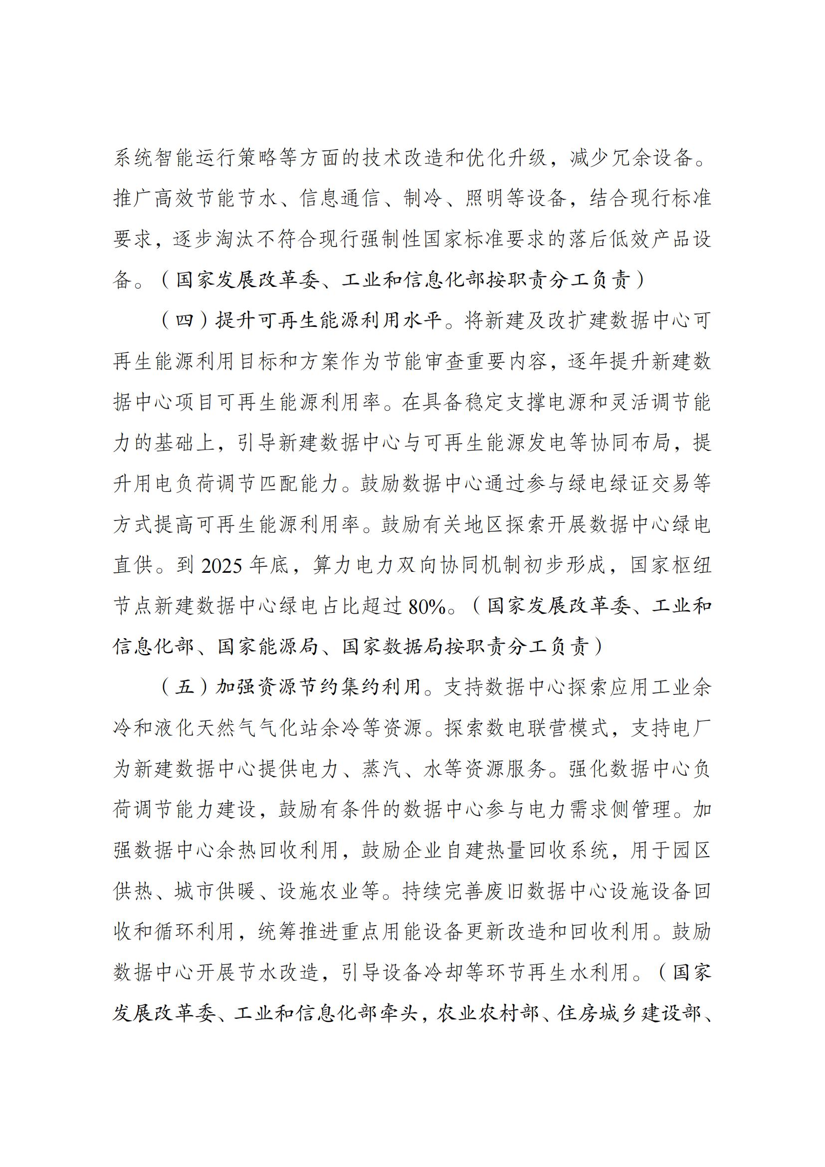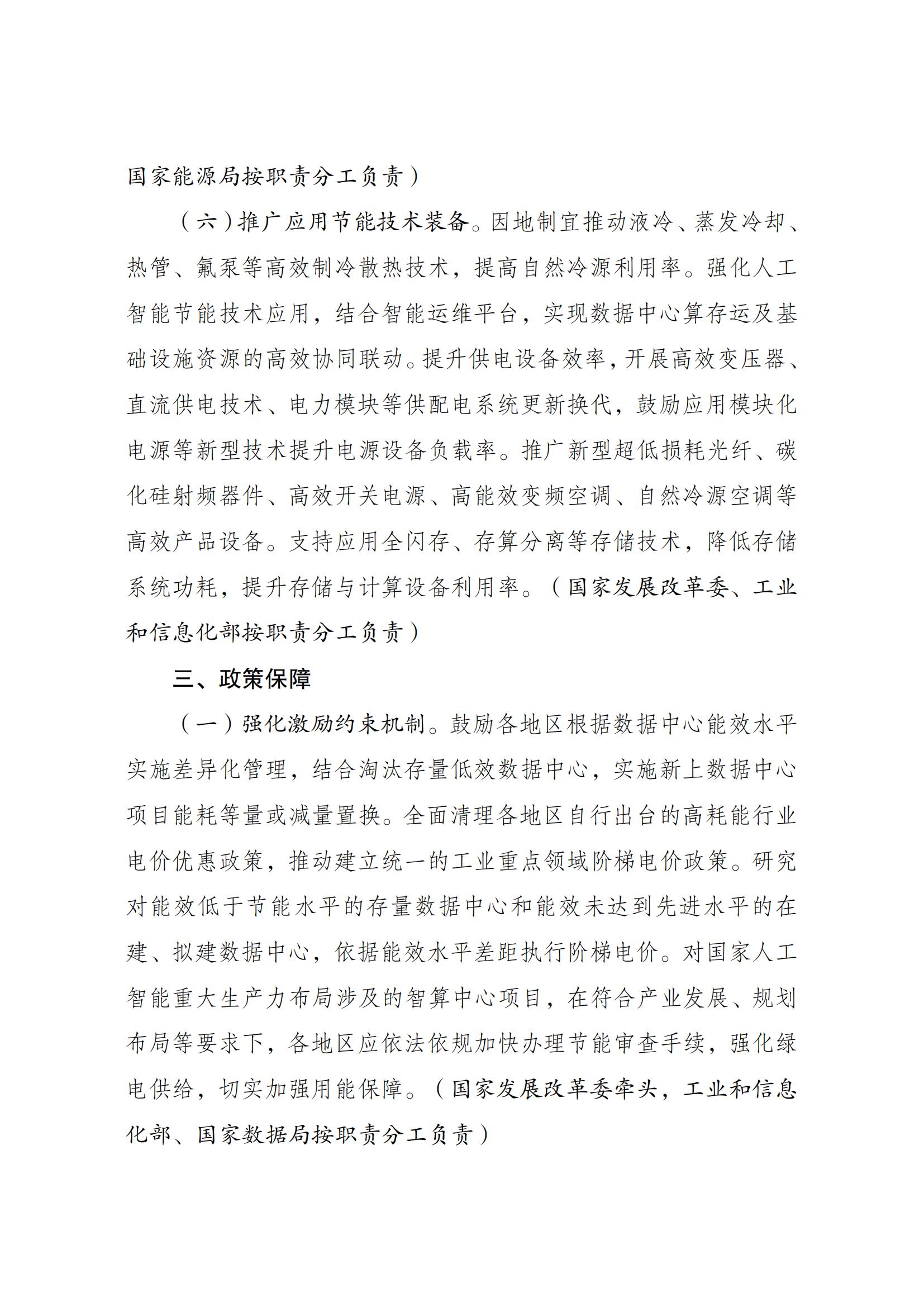 7月23日,國家發展改革委等部門關于印發《數據中心綠色低碳發展專項行動計劃》(以下簡稱《計劃》)的通知。《計劃》指出,提升可再生能源利用水平。將新建及改擴建數據中心可再生能源利用目標和方案作為節能審查重要內容,逐年提升新建數據中心項目可再生能源利用率。在具備穩定支撐電源和靈活調節能力的基礎上,引導新建數據中心與可再生能源發電等協同布局,提升用電負荷調節匹配能力。鼓勵數據中心通過參與綠電綠證交易等方式提高可再生能源利用率。鼓勵有關地區探索開展數據中心綠電直供。到2025年底,算力電力雙向協同機制初步形成,國家樞紐節點新建數據中心綠電占比超過80%。 原文如下: 國家發展改革委等部門關于印發 《數據中心綠色低碳發展專項行動計劃》的通知 發改環資〔2024〕970號 各省、自治區、直轄市、新疆生產建設兵團發展改革委、工業和信息化主管部門、能源局、數據管理機構: 為全面貫徹黨的二十大精神,認真落實黨中央、國務院決策部署,實施全面節約戰略,加大節能降碳工作力度,推動數據中心綠色低碳發展,加快節能降碳改造和用能設備更新,支撐完成“十四五”能耗強度降低約束性指標,國家發展改革委、工業和信息化部、國家能源局、國家數據局等部門制定了《數據中心綠色低碳發展專項行動計劃》。現印發給你們,請認真抓好落實。 國家發展改革委 工業和信息化部 國家能源局 國家數據局 2024年7月3日