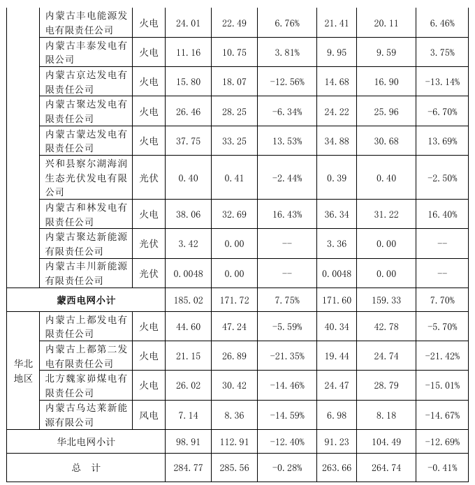 7月25日,內蒙華電發布2024 年上半年銷售量完成情況。 內蒙華電2024年上半年完成發電量284.77億千瓦時,較上年同期下降 0.28%;完成上網電量263.66億千瓦時,較上年同期下降0.41%。 2024年上半年,公司市場化交易電量255.73億千瓦時,占上網電 量比例為96.99%。 2024年上半年,實現平均售電單價340.37元/千千瓦時(不含 稅),同比降低18.79元/千千瓦時(不含稅),同比下降5.23%。 電力方面: