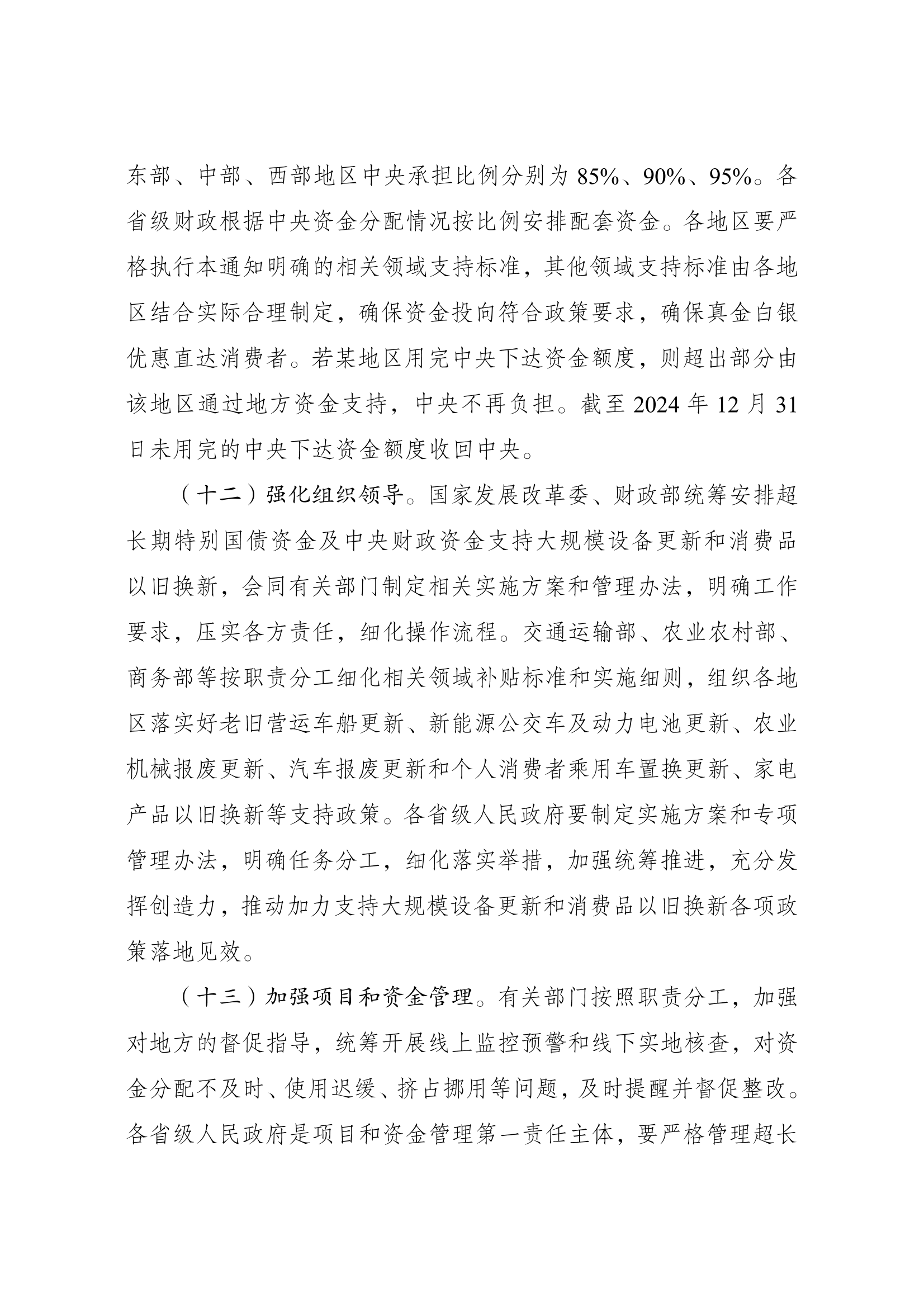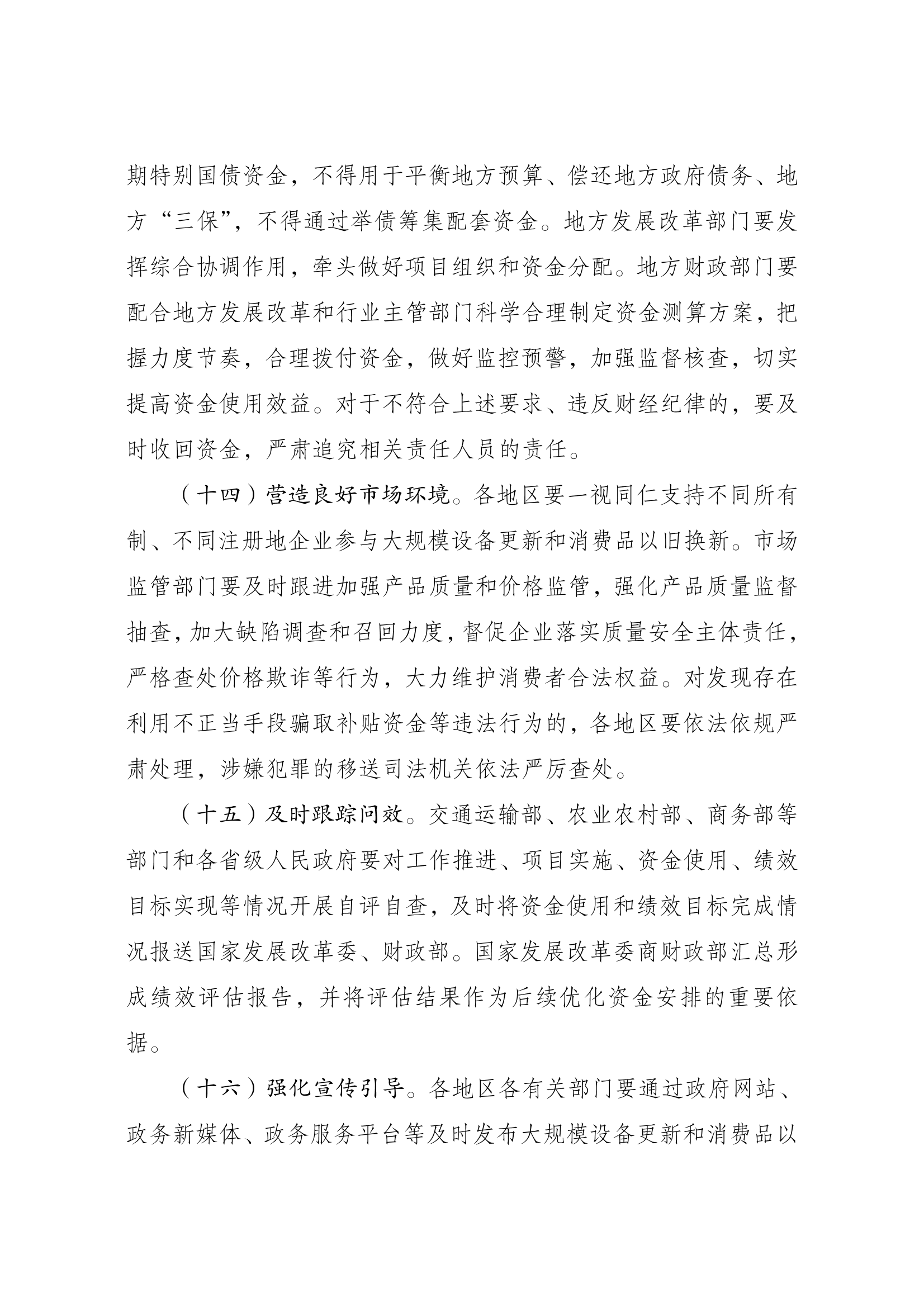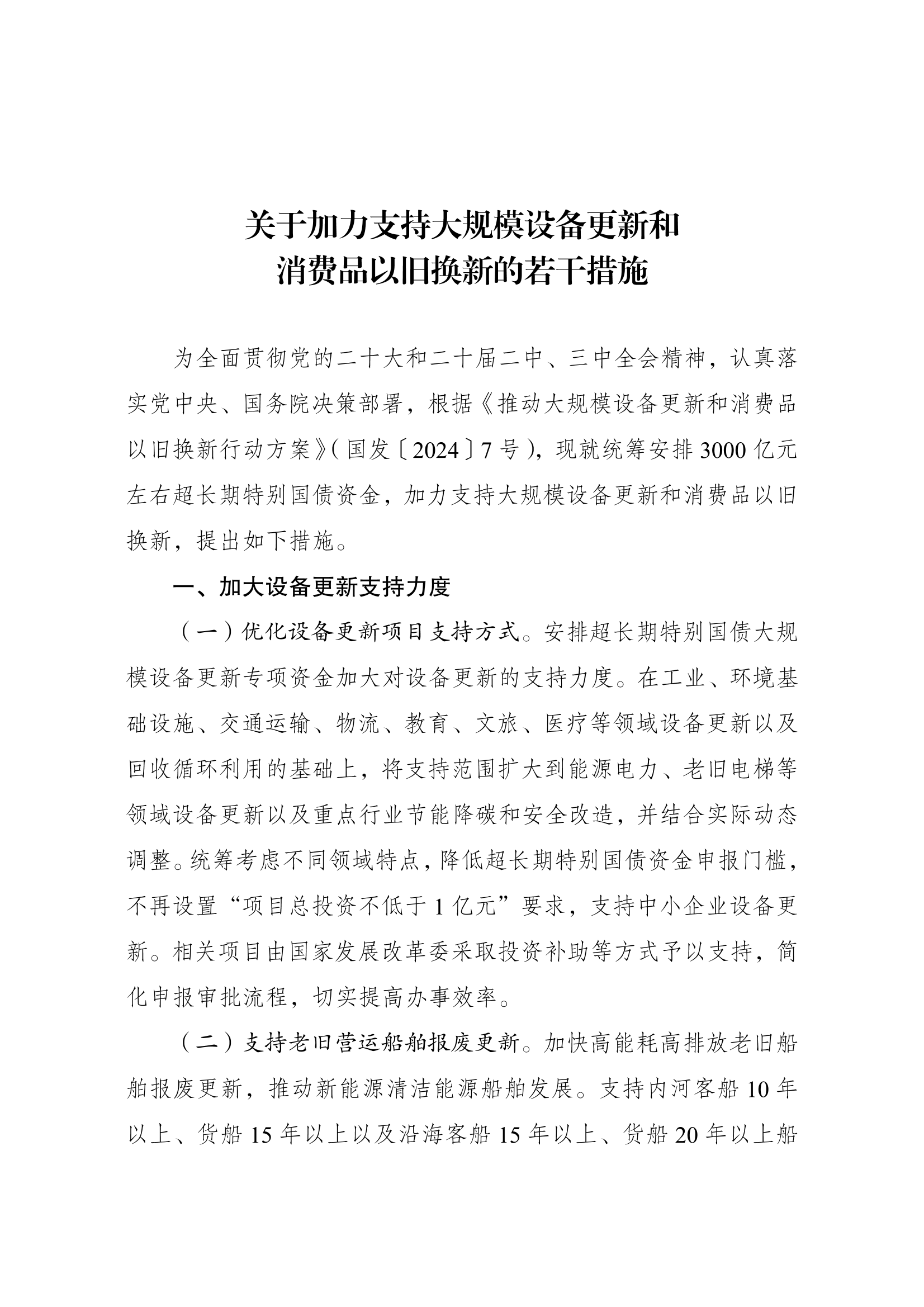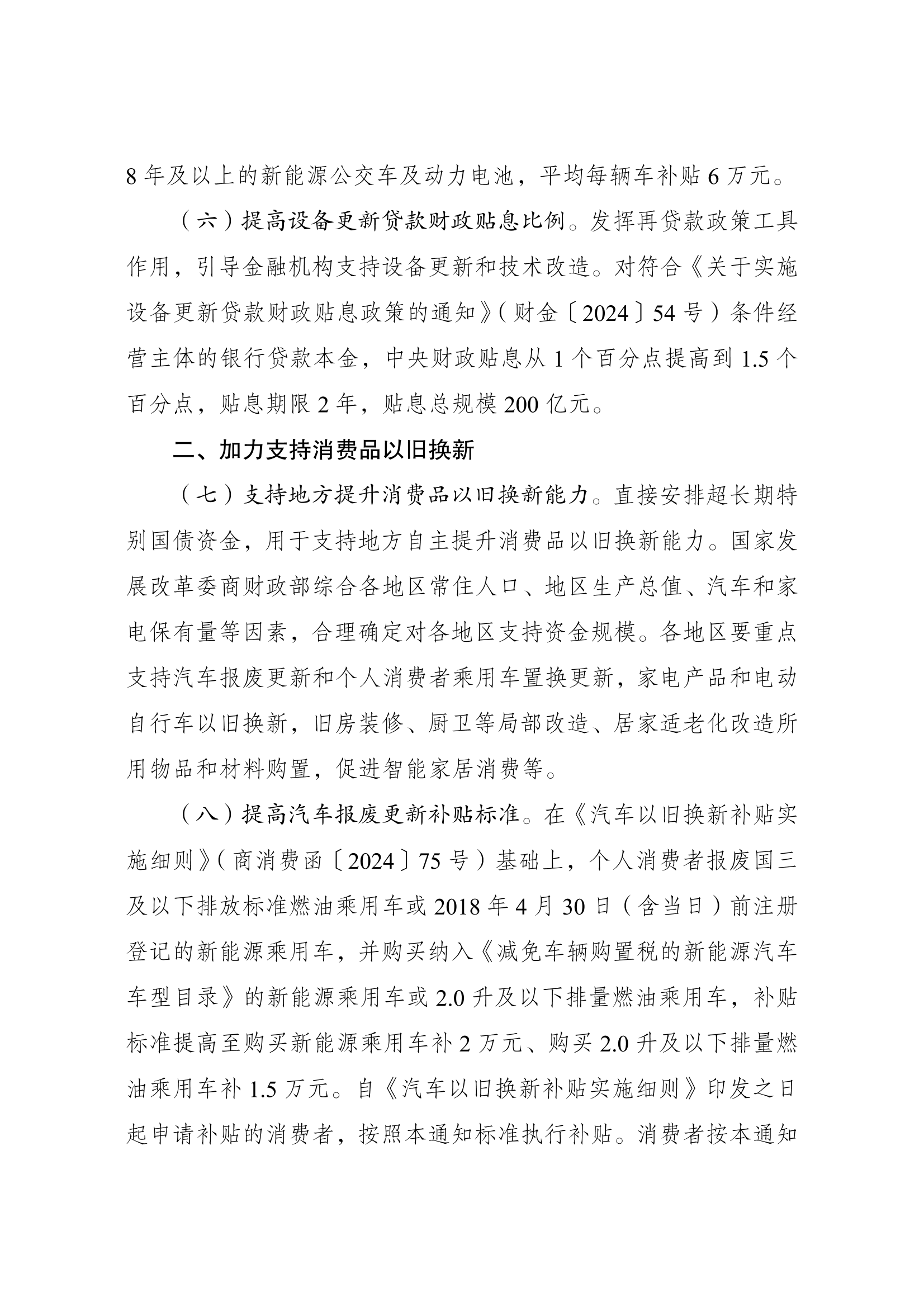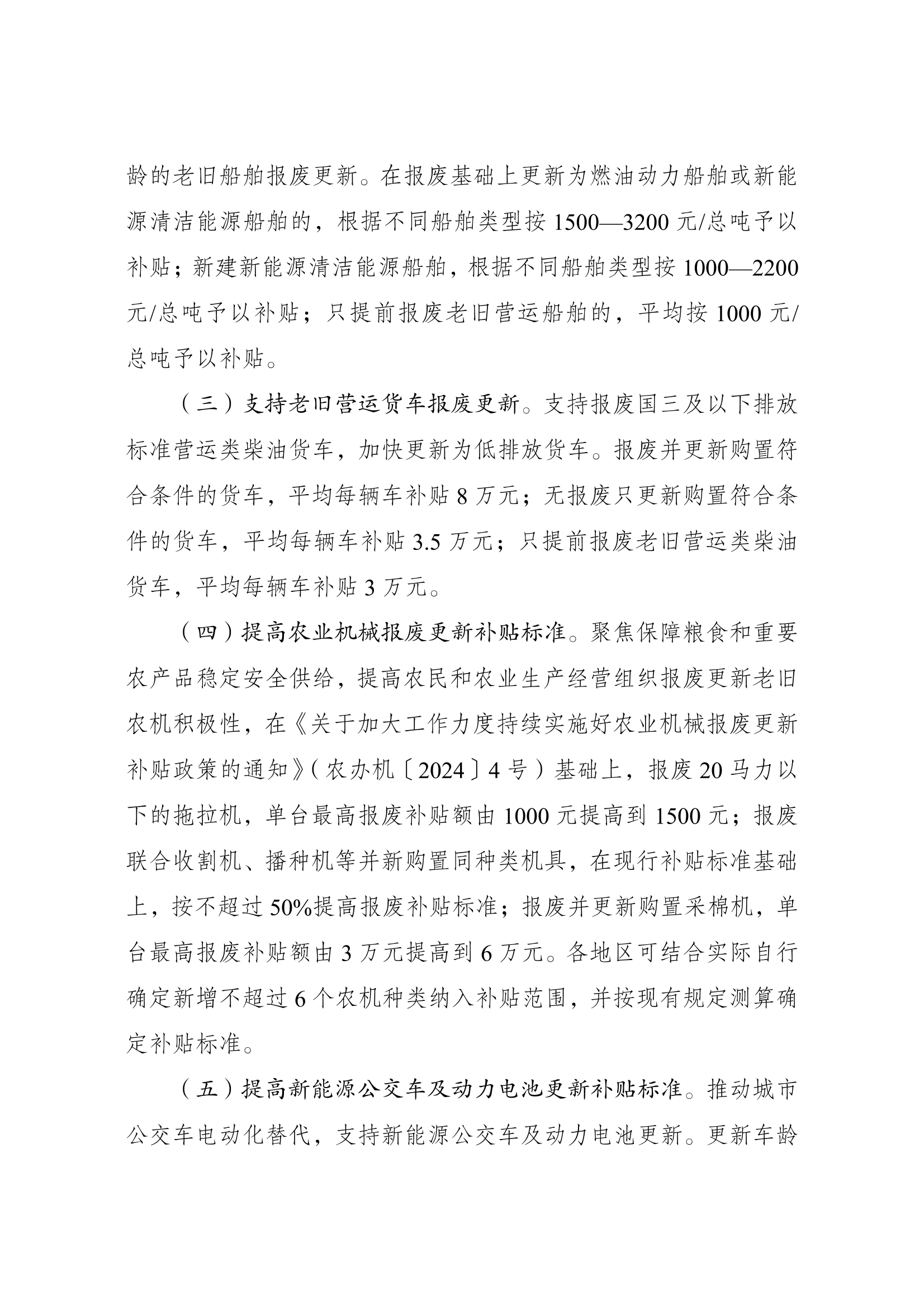 7月25日,國家發展改革委、財政部印發《關(guan)于加力支(zhi)持大規模設備更(geng)新(xin)(xin)和(he)消(xiao)費品(pin)以舊換新(xin)(xin)的(de)若(ruo)干措施》。其(qi)中提到,提高新(xin)(xin)能源公交車及(ji)動(dong)力電池更(geng)新(xin)(xin)補(bu)貼標準(zhun)。推動(dong)城(cheng)市公交(jiao)車(che)(che)電動(dong)化替(ti)代,支(zhi)持(chi)新(xin)能(neng)源(yuan)公交(jiao)車(che)(che)及動(dong)力電池(chi)更新(xin)。更新(xin)車(che)(che)齡8年(nian)及以上的新(xin)能(neng)源(yuan)公交(jiao)車(che)(che)及動(dong)力電池(chi),平(ping)均每輛車(che)(che)補貼6萬元。 個人(ren)消費者報廢(fei)國三及(ji)以(yi)(yi)下排放標準燃油(you)乘(cheng)用(yong)車(che)或(huo)2018年4月30日(ri)(含當日(ri))前注(zhu)冊登記的新(xin)能(neng)(neng)源乘(cheng)用(yong)車(che),并購買(mai)納入(ru)目錄的新(xin)能(neng)(neng)源乘(cheng)用(yong)車(che)或(huo)2.0升及(ji)以(yi)(yi)下排量燃油(you)乘(cheng)用(yong)車(che),補(bu)貼標準提高至購買(mai)新(xin)能(neng)(neng)源乘(cheng)用(yong)車(che)補(bu)2萬元、購買(mai)2.0升及(ji)以(yi)(yi)下排量燃油(you)乘(cheng)用(yong)車(che)補(bu)1.5萬元。 加(jia)快高(gao)能(neng)耗高(gao)排放(fang)老舊(jiu)船(chuan)舶(bo)報(bao)廢(fei)(fei)更(geng)新(xin),推動新(xin)能(neng)源(yuan)清(qing)(qing)潔能(neng)源(yuan)船(chuan)舶(bo)發展。支持內河客(ke)船(chuan)10年以(yi)上、貨船(chuan)15年以(yi)上以(yi)及沿(yan)海客(ke)船(chuan)15年以(yi)上、貨船(chuan)20年以(yi)上船(chuan)齡的老舊(jiu)船(chuan)舶(bo)報(bao)廢(fei)(fei)更(geng)新(xin)。在(zai)報(bao)廢(fei)(fei)基(ji)礎上更(geng)新(xin)為(wei)燃油動力(li)船(chuan)舶(bo)或(huo)新(xin)能(neng)源(yuan)清(qing)(qing)潔能(neng)源(yuan)船(chuan)舶(bo)的,根據不同船(chuan)舶(bo)類(lei)型按1500—3200元/總(zong)噸(dun)予(yu)以(yi)補(bu)(bu)貼(tie)(tie);新(xin)建(jian)新(xin)能(neng)源(yuan)清(qing)(qing)潔能(neng)源(yuan)船(chuan)舶(bo),根據不同船(chuan)舶(bo)類(lei)型按1000—2200元/總(zong)噸(dun)予(yu)以(yi)補(bu)(bu)貼(tie)(tie);只提(ti)前(qian)報(bao)廢(fei)(fei)老舊(jiu)營運船(chuan)舶(bo)的,平均按1000元/總(zong)噸(dun)予(yu)以(yi)補(bu)(bu)貼(tie)(tie)。 安排超長期(qi)特(te)別國債(zhai)大規模設(she)備更(geng)新專項資金加(jia)大對設(she)備更(geng)新的支持(chi)(chi)力度(du)。將支持(chi)(chi)范圍擴大到能源電(dian)力、老舊(jiu)電(dian)梯等領域設(she)備更(geng)新以(yi)及重(zhong)點(dian)行業節(jie)能降碳和安全改(gai)造,并結合(he)實際動態調整(zheng)。統籌(chou)考慮(lv)不同領域特(te)點(dian),降低超長期(qi)特(te)別國債(zhai)資金申報門檻,不再設(she)置“項目總投資不低于(yu)1億元”要(yao)求,支持(chi)(chi)中(zhong)小企業設(she)備更(geng)新。相(xiang)關項目由國家發展改(gai)革委采(cai)取投資補助(zhu)等方(fang)式予以(yi)支持(chi)(chi),簡化申報審批流程,切(qie)實提(ti)高辦事效率。 原文如下: 國家發展改革委 財政部印(yin)發 《關于(yu)加力支持大(da)規(gui)模設備更新和消費品 以舊換新(xin)的若干(gan)措施》的通知 發改環(huan)資〔2024〕1104號(hao) 各省、自治區、直轄市人民(min)政府,國務院(yuan)各部委、各直屬機構: 《關于加(jia)力支持大(da)規模設備更新和消費品以舊換新的若干措(cuo)施(shi)》已經國務院同意。現印發給你們(men),請認(ren)真貫(guan)徹落(luo)實(shi)。 國家發展改革(ge)委 財 政 部 2024年7月24日