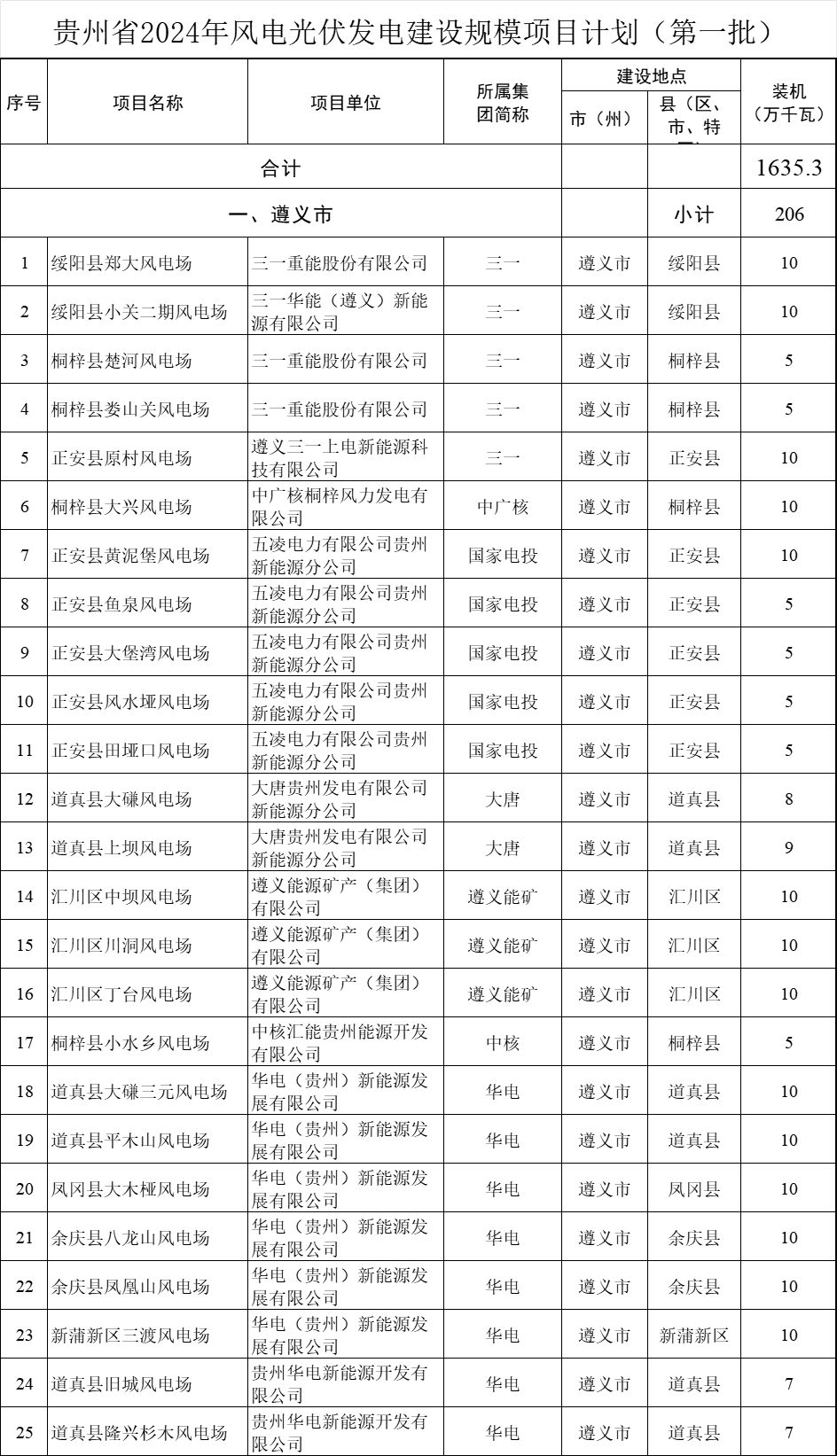 7月29日,貴州省(sheng)能源局發布《貴州省(sheng)2024年(nian)度風(feng)電光(guang)伏發電建設規模項目計(ji)劃(第一批(pi))》。根據(ju)公示,總(zong)裝(zhuang)機1635.3萬(wan)(wan)千(qian)瓦(wa)。共包含161個(ge)風(feng)電項目,容量(liang)為1073.5萬(wan)(wan)千(qian)瓦(wa)項目、44個(ge)光(guang)伏項目,容量(liang)共計(ji)561.8萬(wan)(wan)千(qian)瓦(wa)。上(shang)述(shu)項目共分布在(zai)黔南州、六盤水市(shi)、黔西南州等(deng)6個(ge)地級(ji)市(shi)。 從項目(mu)單位所屬的集團來看,貴(gui)州能(neng)源集團領銜,項目(mu)規模達到(dao)2.008GW;大唐、國(guo)家電(dian)投、國(guo)家能(neng)源集團、盛義信能(neng)源投資的項目(mu)規模也在(zai)1GW及(ji)以上(shang)。 原文如下: 貴州省能源局關于下達貴州省2024年度風電光伏發電建設規模項目計劃 (第一批)的通知 黔能源新〔2024〕53號 各(ge)(ge)市(州)能源主(zhu)管部(bu)門,貴(gui)州電(dian)網有限責任(ren)公司、貴(gui)州萬峰電(dian)力有限公司,各(ge)(ge)新能源企(qi)業(ye): 為貫(guan)徹落(luo)實《關于(yu)促進新時代新能源高(gao)質量發(fa)展的實施方案》(國辦函〔2022〕39號)等(deng)文(wen)件(jian)精(jing)神,進一步推進我(wo)省新能源產業健康有序發(fa)展,我(wo)局結(jie)合實際(ji)制定了2024年度風電(dian)(dian)光伏發(fa)電(dian)(dian)建(jian)設規模項(xiang)目計(ji)劃(第(di)一批),總裝機(ji)1635.3萬(wan)千瓦,現(xian)予以下達(da)。 請各市(shi)(州)能(neng)源主(zhu)管(guan)部門(men)根(gen)據我(wo)省新能(neng)源項(xiang)目建(jian)設(she)有關要求,指導(dao)和(he)督促項(xiang)目加快前期工作(zuo)開展,按期辦理核準備(bei)案,盡早(zao)開工建(jian)設(she),并組織好后續項(xiang)目申報工作(zuo),切(qie)實助推(tui)我(wo)省能(neng)源產業(ye)、鄉村振興、重大產業(ye)高質(zhi)量(liang)發展。 附件:貴州省2024年風電(dian)光(guang)伏發(fa)電(dian)建設(she)規模(mo)項目計劃(hua)(第一(yi)批)(2).xls 2024年7月26日 上一篇: 兩家企業擬合作赴美國建設太陽能電池工廠