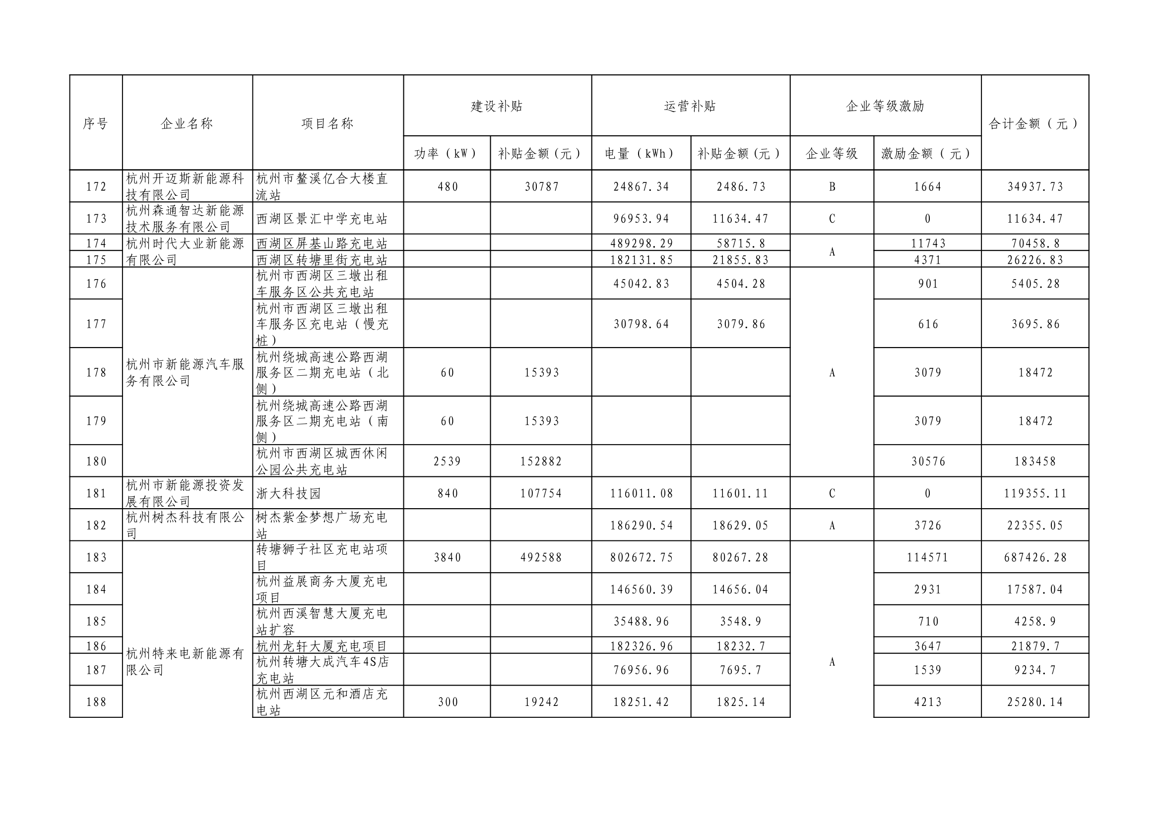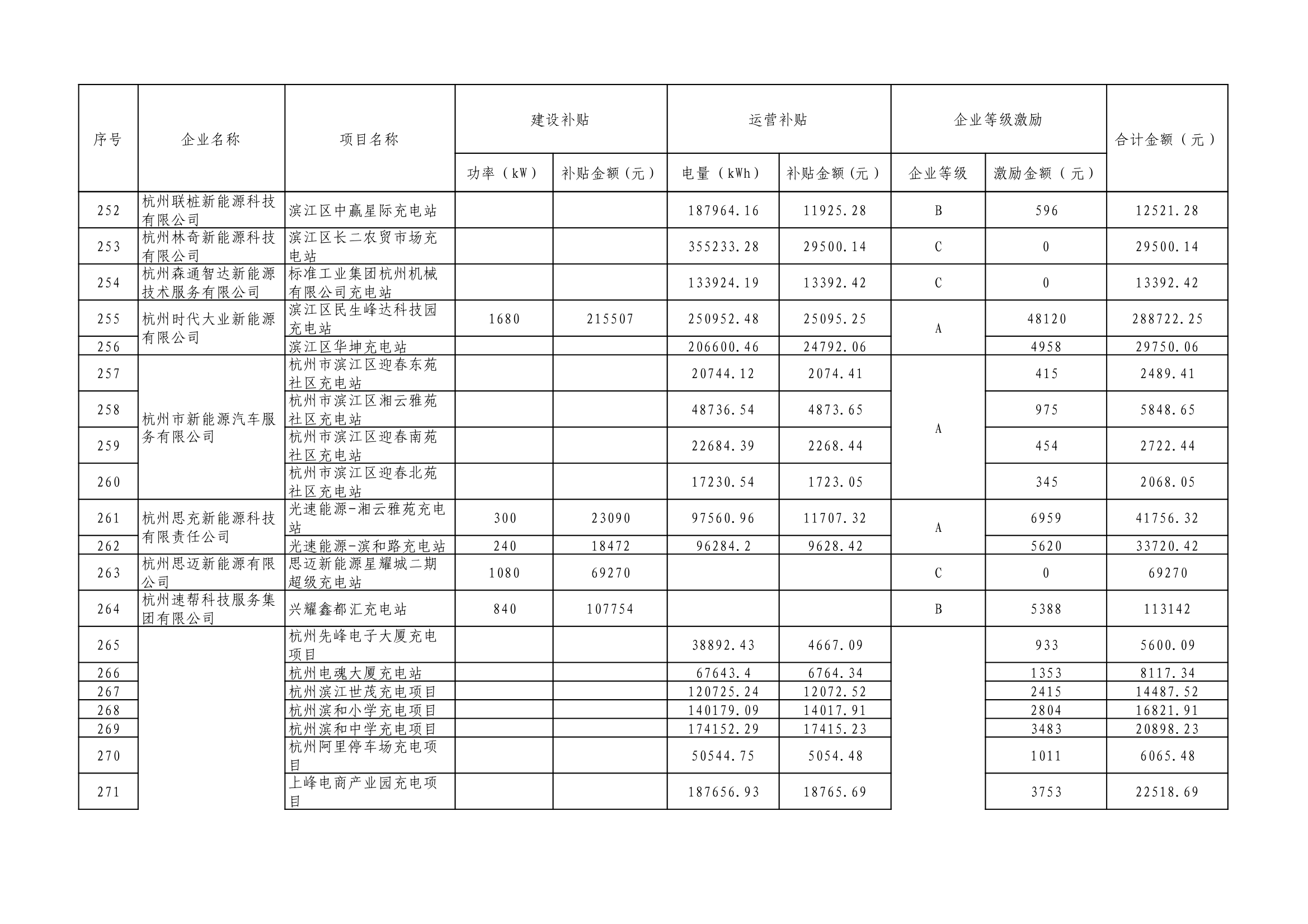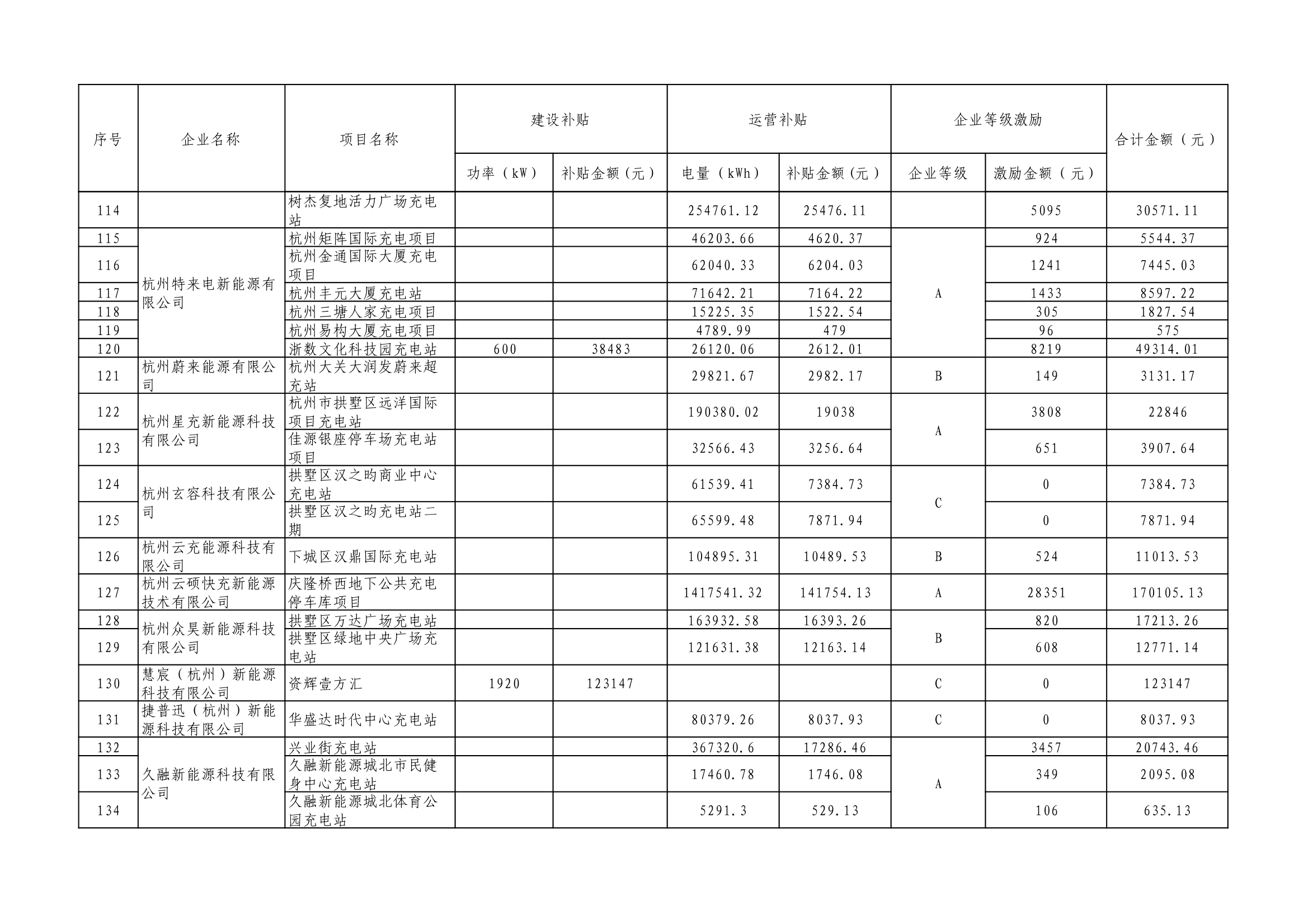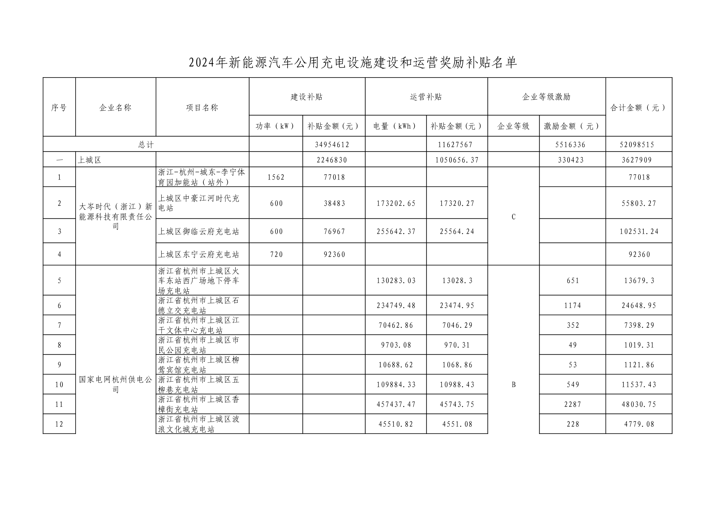 8月2日,浙江杭州市城(cheng)鄉建(jian)設委員會(hui)公示了(le)《2024年新(xin)能(neng)源汽車公用充電設施建(jian)設和(he)運營獎勵(li)補(bu)貼(tie)(tie)名單》。附件顯(xian)示,共有905個項(xiang)目列入(ru)補(bu)貼(tie)(tie)名單,其中(zhong)建(jian)設補(bu)貼(tie)(tie)總(zong)額(e)34954612元(yuan),運營補(bu)貼(tie)(tie)總(zong)額(e)11627567元(yuan),企業激勵(li)總(zong)額(e)5516336元(yuan),合(he)計共5209.85萬元(yuan)。 原文如下: 關于2024年新能(neng)源汽車公用(yong)充電設施建設和運營獎勵補貼(tie)名單(dan)的(de)公示 根據《杭(hang)州市(shi)(shi)城鄉(xiang)建(jian)設(she)(she)(she)委(wei)員會(hui) 杭(hang)州市(shi)(shi)財政局關(guan)于印發<杭(hang)州市(shi)(shi)新(xin)能源電動汽車公共充(chong)電設(she)(she)(she)施(shi)(shi)獎(jiang)(jiang)勵補(bu)貼(tie)(tie)資金分(fen)配實施(shi)(shi)細(xi)(xi)則(ze)>的通知》(杭(hang)建(jian)地(di)空(kong)〔2023〕172號)要求,經(jing)企業自主申報,所(suo)屬區、縣(市(shi)(shi))城鄉(xiang)建(jian)設(she)(she)(she)部門審核,確定2024年新(xin)能源汽車公用充(chong)電設(she)(she)(she)施(shi)(shi)建(jian)設(she)(she)(she)和運營獎(jiang)(jiang)勵補(bu)貼(tie)(tie)名單。建(jian)設(she)(she)(she)補(bu)貼(tie)(tie)金額按照標(biao)準下浮36%,A級(ji)企業按照實施(shi)(shi)細(xi)(xi)則(ze)標(biao)準上浮20%,B級(ji)企業按照標(biao)準上浮5%,現予以公示,公示期5個(ge)工作日(2024年8月2日-8月8日)(公示名單詳見附件)。 公示(shi)期間,任(ren)何單位(wei)或(huo)個(ge)人(ren)如有意見(jian)和建議,可通過(guo)電話、電子郵(you)件等形式向我委(wei)反(fan)映(ying)。反(fan)映(ying)情況(kuang)(kuang)需客觀真實(shi),以單位(wei)名義反(fan)映(ying)情況(kuang)(kuang)的材料需加蓋公章,以個(ge)人(ren)名義反(fan)映(ying)情況(kuang)(kuang)的材料應署實(shi)名并(bing)提供聯系方式。 聯(lian)(lian)系人:呂恬睿 聯(lian)(lian)系電話:0571-87173389 電子郵箱:hangzhoucdz@163.com 附件:關于2024年(nian)新能(neng)源汽車公用充電(dian)設施建設和(he)(he)運營獎勵補(bu)(bu)貼名(ming)單的公示2024年(nian)新能(neng)源汽車公用充電(dian)設施建設和(he)(he)運營獎勵補(bu)(bu)貼名(ming)單.pdf 杭州市(shi)城鄉建(jian)設委員會 2024年8月2日