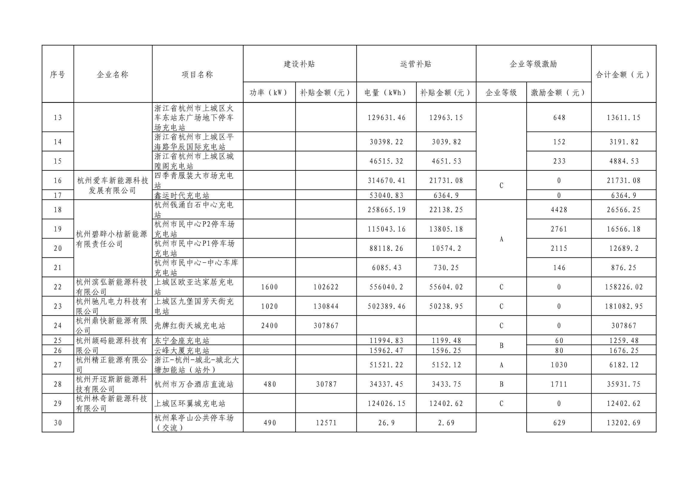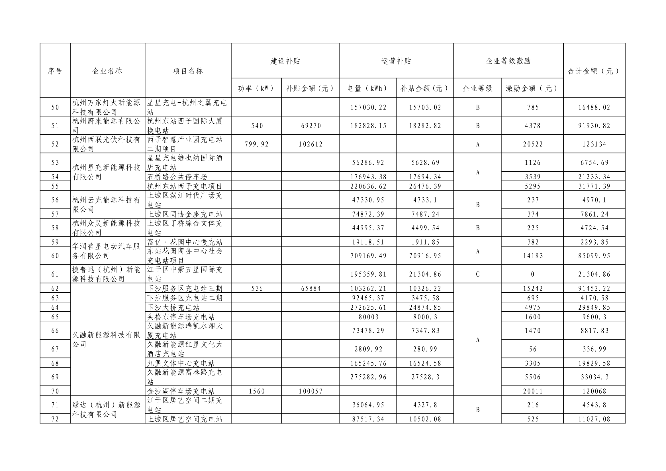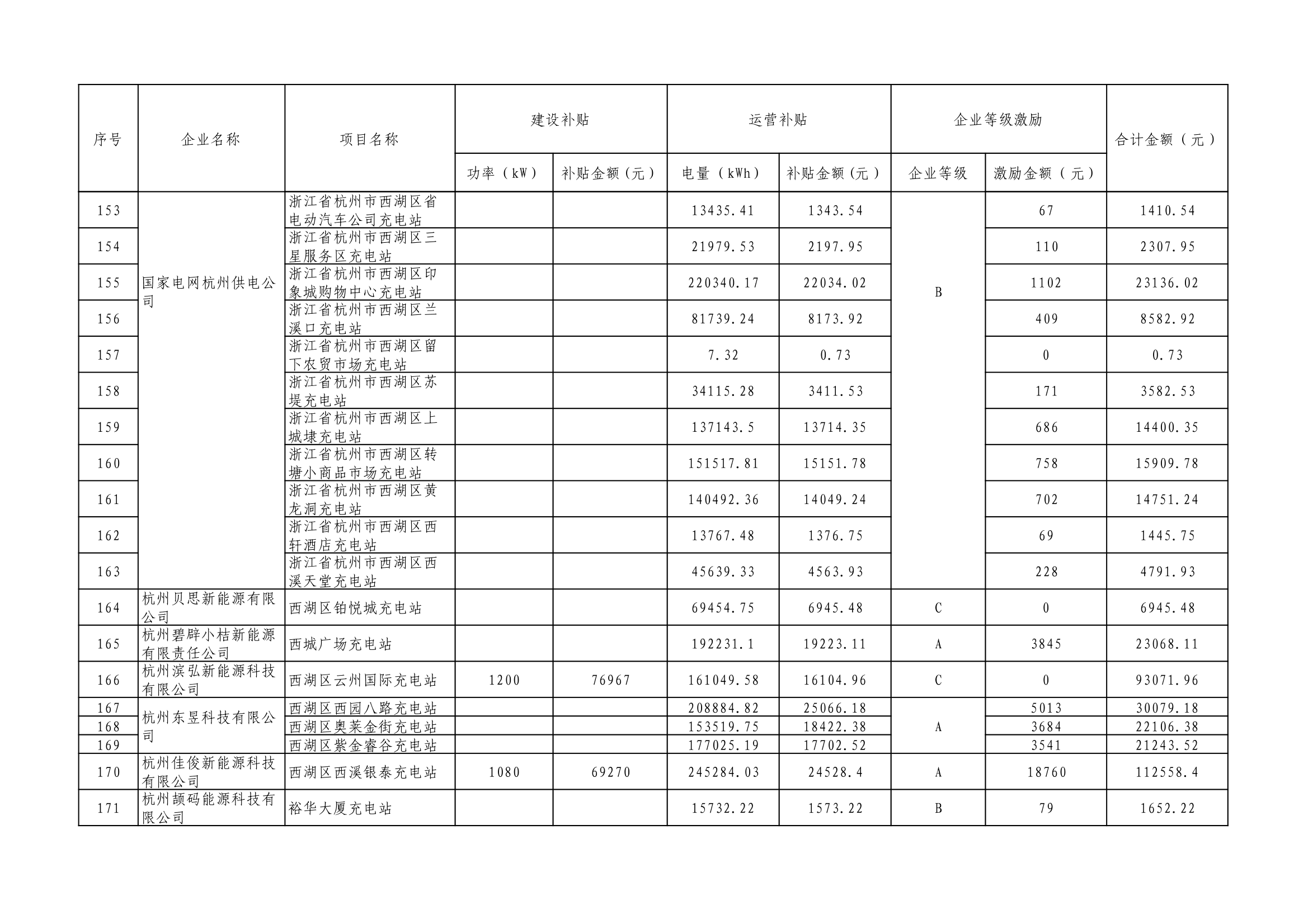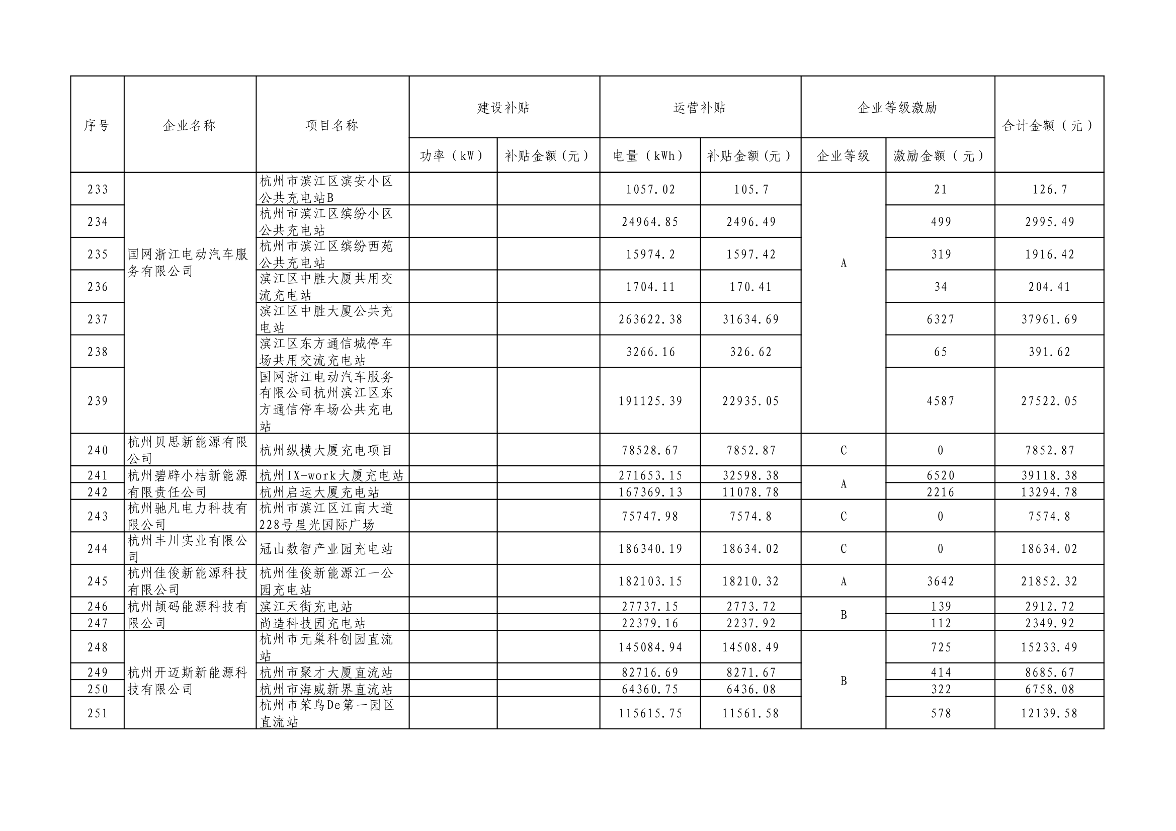 8月2日,浙江杭州市城(cheng)鄉建(jian)設委員會(hui)公示了(le)《2024年新(xin)能(neng)源汽車公用充電設施建(jian)設和(he)運營獎勵(li)補(bu)貼(tie)(tie)名單》。附件顯(xian)示,共有905個項(xiang)目列入(ru)補(bu)貼(tie)(tie)名單,其中(zhong)建(jian)設補(bu)貼(tie)(tie)總(zong)額(e)34954612元(yuan),運營補(bu)貼(tie)(tie)總(zong)額(e)11627567元(yuan),企業激勵(li)總(zong)額(e)5516336元(yuan),合(he)計共5209.85萬元(yuan)。 原文如下: 關于2024年新能(neng)源汽車公用(yong)充電設施建設和運營獎勵補貼(tie)名單(dan)的(de)公示 根據《杭(hang)州市(shi)(shi)城鄉(xiang)建(jian)設(she)(she)(she)委(wei)員會(hui) 杭(hang)州市(shi)(shi)財政局關(guan)于印發<杭(hang)州市(shi)(shi)新(xin)能源電動汽車公共充(chong)電設(she)(she)(she)施(shi)(shi)獎(jiang)(jiang)勵補(bu)貼(tie)(tie)資金分(fen)配實施(shi)(shi)細(xi)(xi)則(ze)>的通知》(杭(hang)建(jian)地(di)空(kong)〔2023〕172號)要求,經(jing)企業自主申報,所(suo)屬區、縣(市(shi)(shi))城鄉(xiang)建(jian)設(she)(she)(she)部門審核,確定2024年新(xin)能源汽車公用充(chong)電設(she)(she)(she)施(shi)(shi)建(jian)設(she)(she)(she)和運營獎(jiang)(jiang)勵補(bu)貼(tie)(tie)名單。建(jian)設(she)(she)(she)補(bu)貼(tie)(tie)金額按照標(biao)準下浮36%,A級(ji)企業按照實施(shi)(shi)細(xi)(xi)則(ze)標(biao)準上浮20%,B級(ji)企業按照標(biao)準上浮5%,現予以公示,公示期5個(ge)工作日(2024年8月2日-8月8日)(公示名單詳見附件)。 公示(shi)期間,任(ren)何單位(wei)或(huo)個(ge)人(ren)如有意見(jian)和建議,可通過(guo)電話、電子郵(you)件等形式向我委(wei)反(fan)映(ying)。反(fan)映(ying)情況(kuang)(kuang)需客觀真實(shi),以單位(wei)名義反(fan)映(ying)情況(kuang)(kuang)的材料需加蓋公章,以個(ge)人(ren)名義反(fan)映(ying)情況(kuang)(kuang)的材料應署實(shi)名并(bing)提供聯系方式。 聯(lian)(lian)系人:呂恬睿 聯(lian)(lian)系電話:0571-87173389 電子郵箱:hangzhoucdz@163.com 附件:關于2024年(nian)新能(neng)源汽車公用充電(dian)設施建設和(he)(he)運營獎勵補(bu)(bu)貼名(ming)單的公示2024年(nian)新能(neng)源汽車公用充電(dian)設施建設和(he)(he)運營獎勵補(bu)(bu)貼名(ming)單.pdf 杭州市(shi)城鄉建(jian)設委員會 2024年8月2日