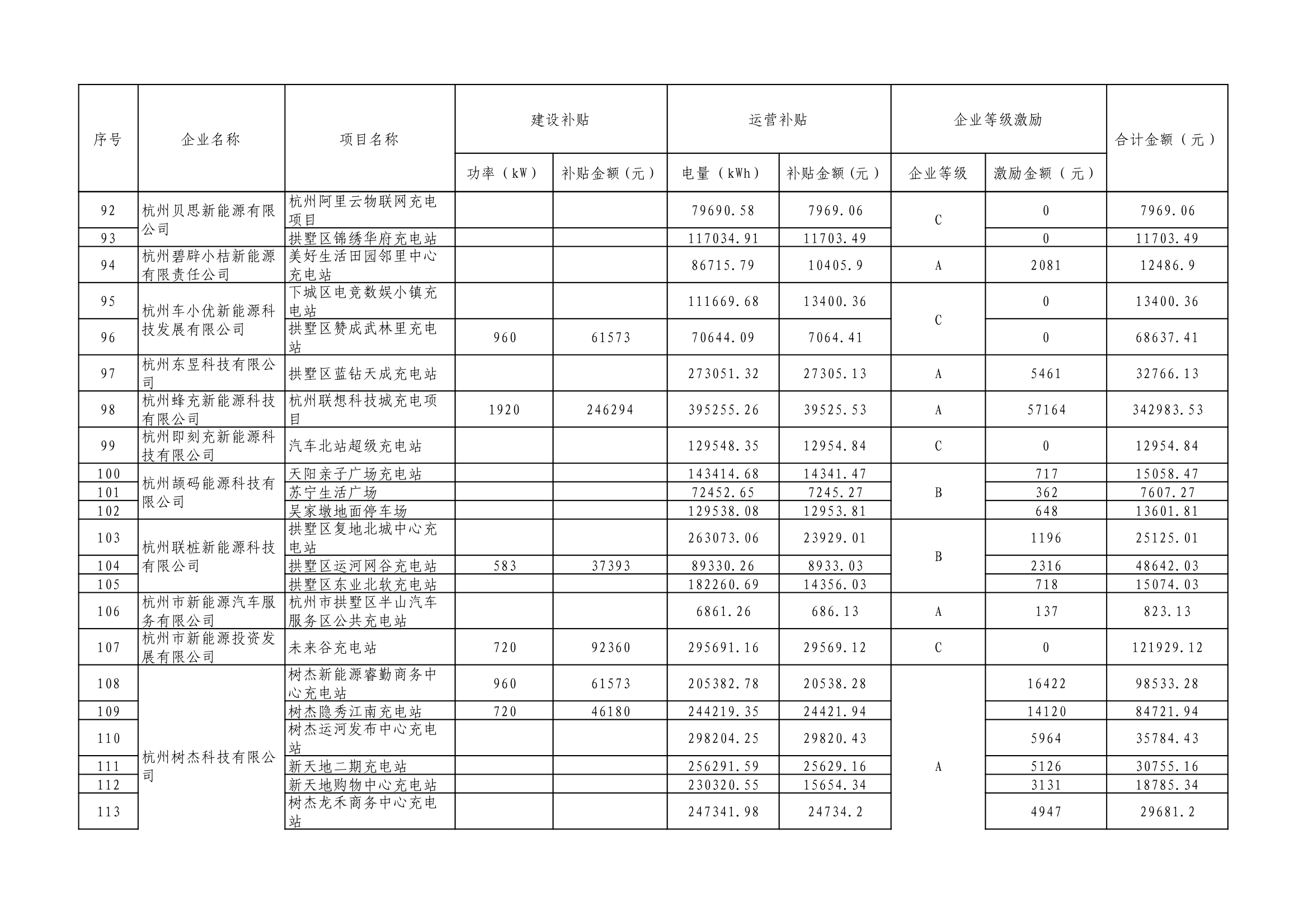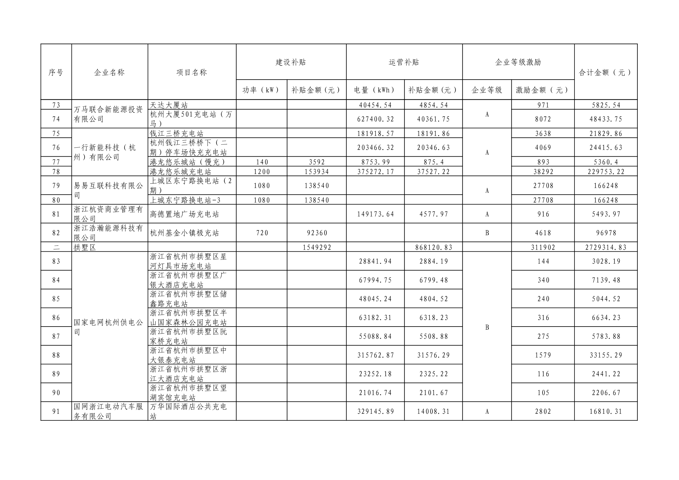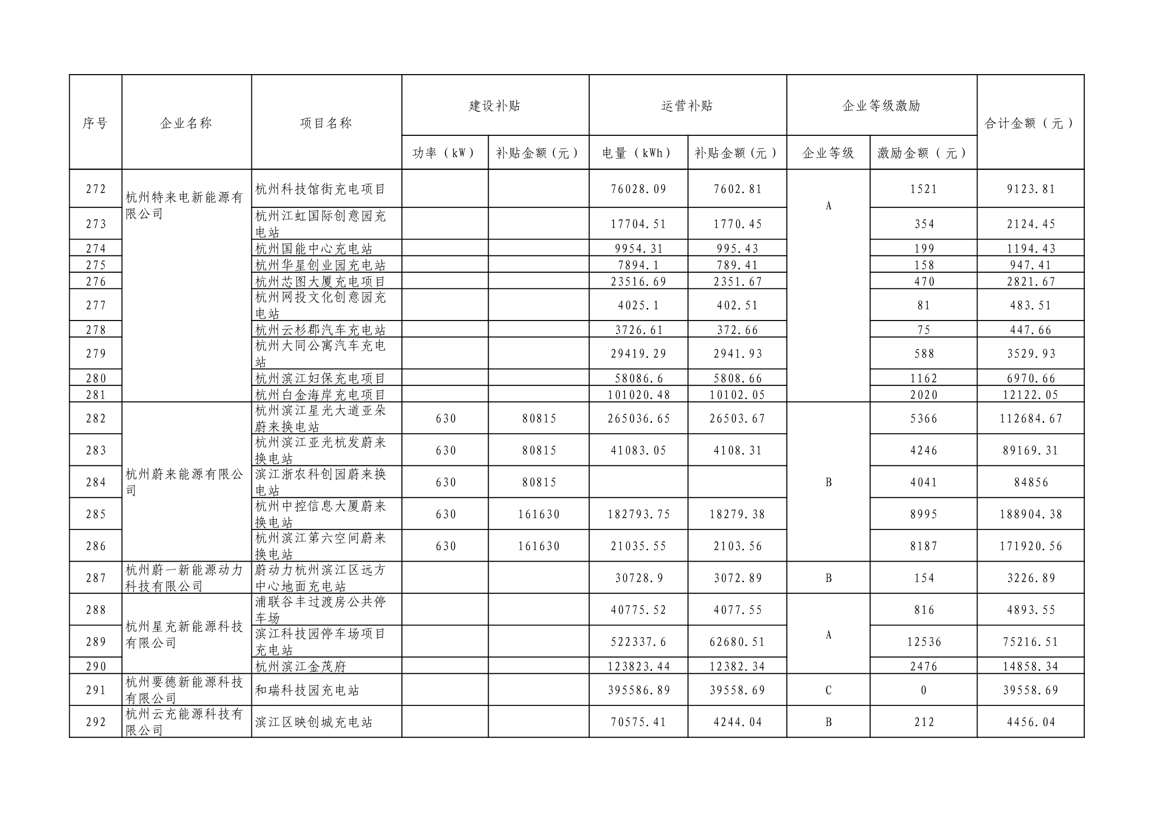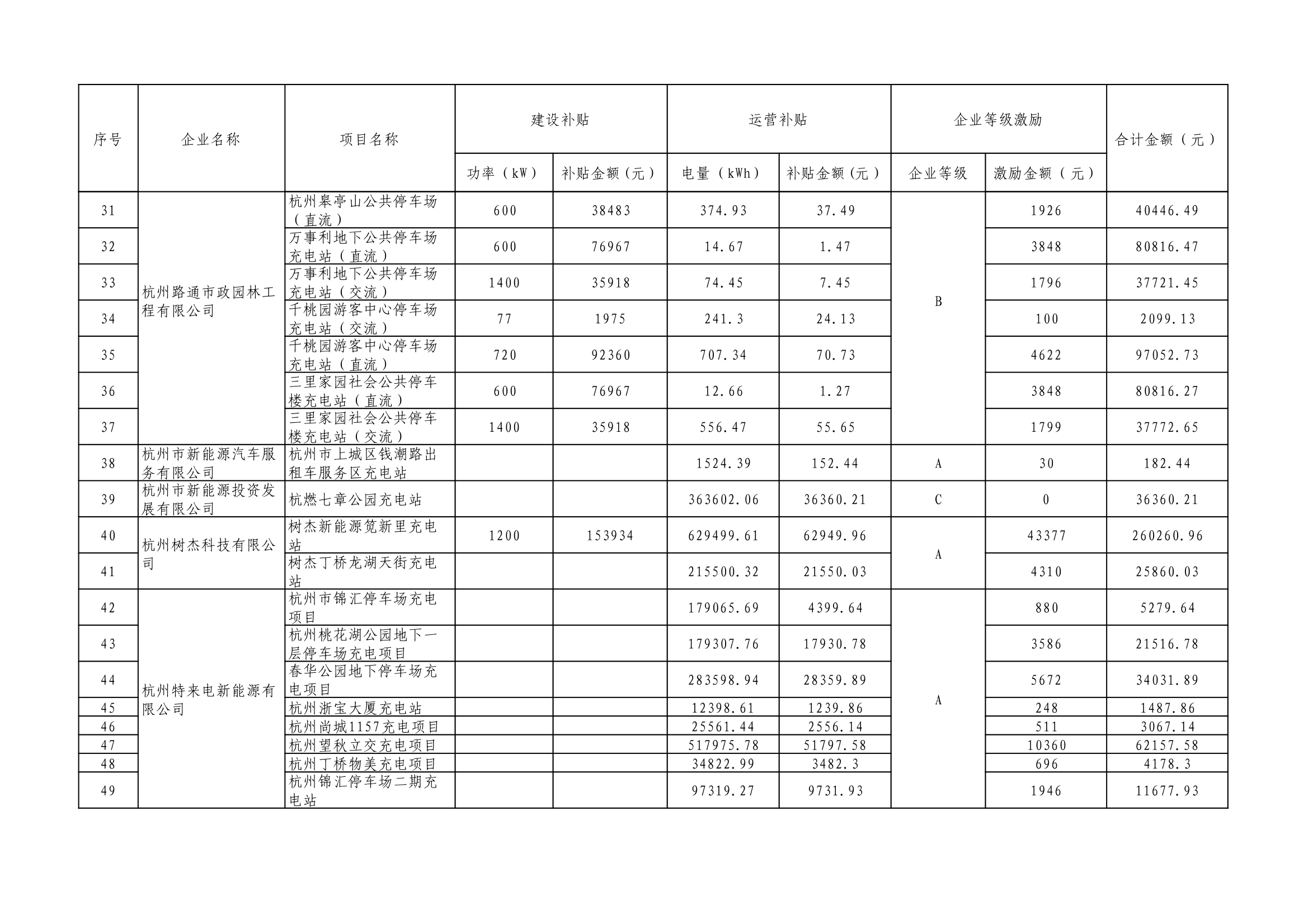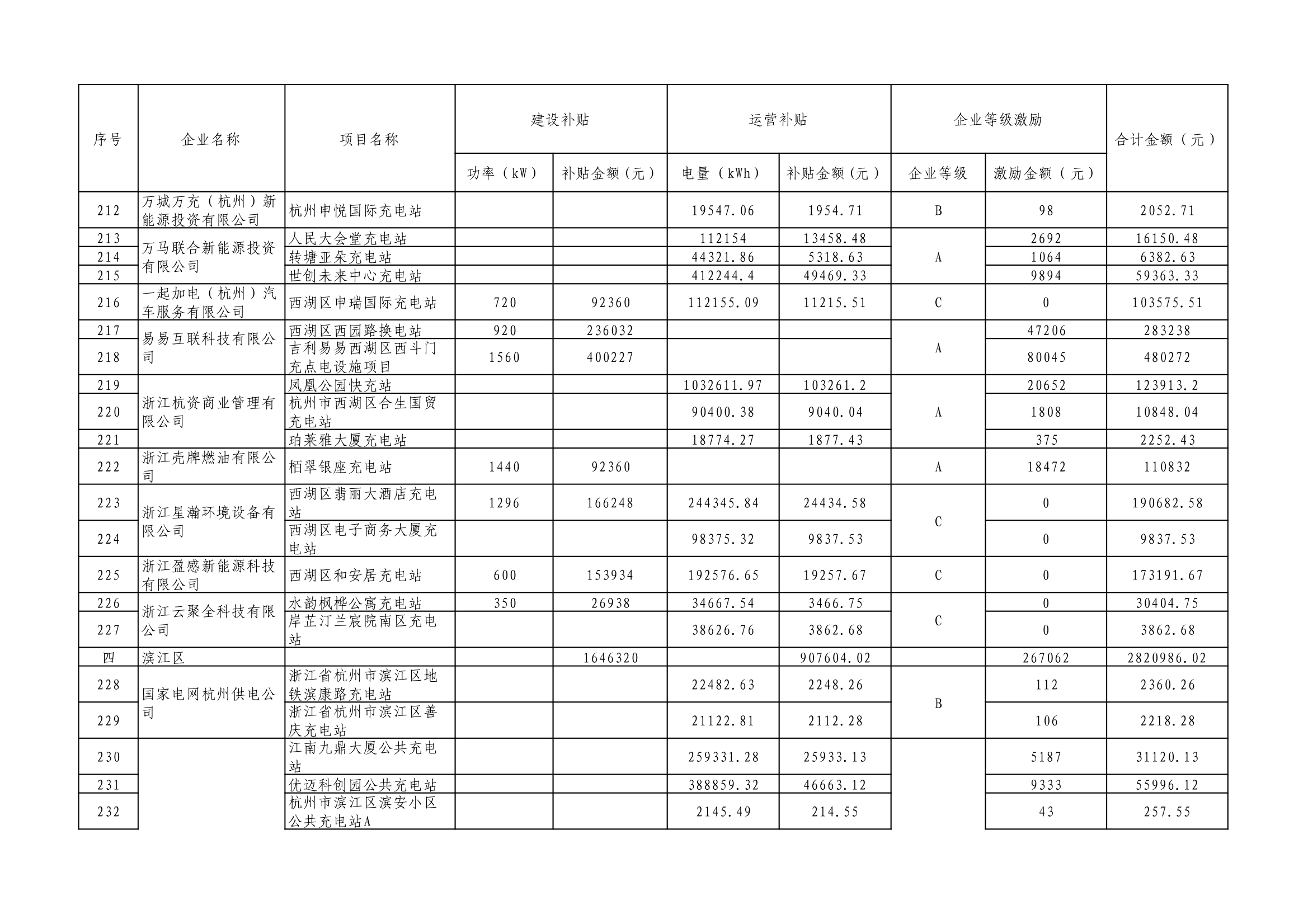 8月2日,浙江杭州市城(cheng)鄉建(jian)設委員會(hui)公示了(le)《2024年新(xin)能(neng)源汽車公用充電設施建(jian)設和(he)運營獎勵(li)補(bu)貼(tie)(tie)名單》。附件顯(xian)示,共有905個項(xiang)目列入(ru)補(bu)貼(tie)(tie)名單,其中(zhong)建(jian)設補(bu)貼(tie)(tie)總(zong)額(e)34954612元(yuan),運營補(bu)貼(tie)(tie)總(zong)額(e)11627567元(yuan),企業激勵(li)總(zong)額(e)5516336元(yuan),合(he)計共5209.85萬元(yuan)。 原文如下: 關于2024年新能(neng)源汽車公用(yong)充電設施建設和運營獎勵補貼(tie)名單(dan)的(de)公示 根據《杭(hang)州市(shi)(shi)城鄉(xiang)建(jian)設(she)(she)(she)委(wei)員會(hui) 杭(hang)州市(shi)(shi)財政局關(guan)于印發<杭(hang)州市(shi)(shi)新(xin)能源電動汽車公共充(chong)電設(she)(she)(she)施(shi)(shi)獎(jiang)(jiang)勵補(bu)貼(tie)(tie)資金分(fen)配實施(shi)(shi)細(xi)(xi)則(ze)>的通知》(杭(hang)建(jian)地(di)空(kong)〔2023〕172號)要求,經(jing)企業自主申報,所(suo)屬區、縣(市(shi)(shi))城鄉(xiang)建(jian)設(she)(she)(she)部門審核,確定2024年新(xin)能源汽車公用充(chong)電設(she)(she)(she)施(shi)(shi)建(jian)設(she)(she)(she)和運營獎(jiang)(jiang)勵補(bu)貼(tie)(tie)名單。建(jian)設(she)(she)(she)補(bu)貼(tie)(tie)金額按照標(biao)準下浮36%,A級(ji)企業按照實施(shi)(shi)細(xi)(xi)則(ze)標(biao)準上浮20%,B級(ji)企業按照標(biao)準上浮5%,現予以公示,公示期5個(ge)工作日(2024年8月2日-8月8日)(公示名單詳見附件)。 公示(shi)期間,任(ren)何單位(wei)或(huo)個(ge)人(ren)如有意見(jian)和建議,可通過(guo)電話、電子郵(you)件等形式向我委(wei)反(fan)映(ying)。反(fan)映(ying)情況(kuang)(kuang)需客觀真實(shi),以單位(wei)名義反(fan)映(ying)情況(kuang)(kuang)的材料需加蓋公章,以個(ge)人(ren)名義反(fan)映(ying)情況(kuang)(kuang)的材料應署實(shi)名并(bing)提供聯系方式。 聯(lian)(lian)系人:呂恬睿 聯(lian)(lian)系電話:0571-87173389 電子郵箱:hangzhoucdz@163.com 附件:關于2024年(nian)新能(neng)源汽車公用充電(dian)設施建設和(he)(he)運營獎勵補(bu)(bu)貼名(ming)單的公示2024年(nian)新能(neng)源汽車公用充電(dian)設施建設和(he)(he)運營獎勵補(bu)(bu)貼名(ming)單.pdf 杭州市(shi)城鄉建(jian)設委員會 2024年8月2日