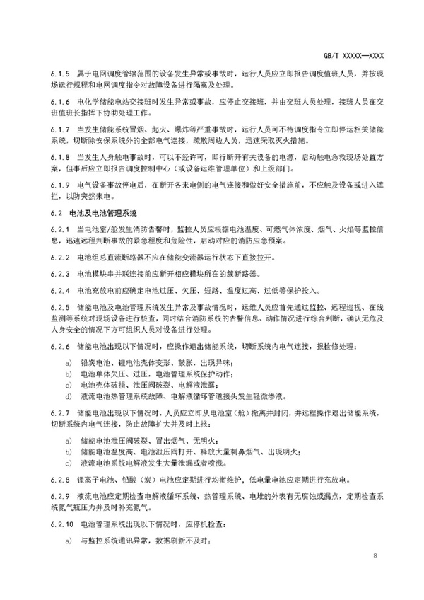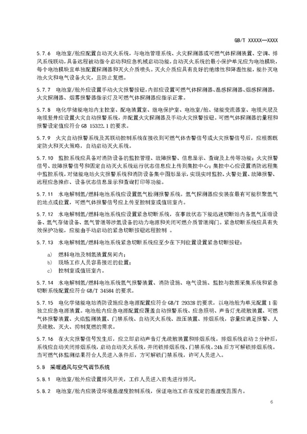 近日,國家標準《電化(hua)學儲能電(dian)站安全(quan)規程》開(kai)始征求意見,文件(jian)適用于鋰離子電(dian)池、鉛酸(suan)(炭)電(dian)池、液流(liu)電(dian)池、水電(dian)解(jie)制(zhi)氫(qing)/燃料電(dian)池儲(chu)能電(dian)站。該標準(zhun)規定了電化學儲能電站設備(bei)設施安(an)全(quan)技術(shu)要求、運行、維護、檢(jian)修、試驗等方面的(de)安(an)全(quan)要求。 電(dian)(dian)(dian)池(chi)室(shi)(shi)/艙應配置(zhi)自動(dong)滅火系(xi)(xi)統(tong),與(yu)電(dian)(dian)(dian)池(chi)管理系(xi)(xi)統(tong)、火災探(tan)(tan)測器或可(ke)燃氣(qi)體探(tan)(tan)測裝置(zhi)、空調、排風系(xi)(xi)統(tong)聯動(dong)。儲能(neng)電(dian)(dian)(dian)池(chi)出現溫度高、電(dian)(dian)(dian)池(chi)泄壓(ya)閥(fa)打開(kai)、釋放大(da)量刺鼻(bi)煙(yan)氣(qi)、出現明火等(deng)情況時,人員應立即從(cong)電(dian)(dian)(dian)池(chi)室(shi)(shi)(艙)撤離并封閉,并遠程操作退出儲能(neng)系(xi)(xi)統(tong), 切斷系(xi)(xi)統(tong)內電(dian)(dian)(dian)氣(qi)連接(jie),防止故障擴大(da)并及(ji)時上報。