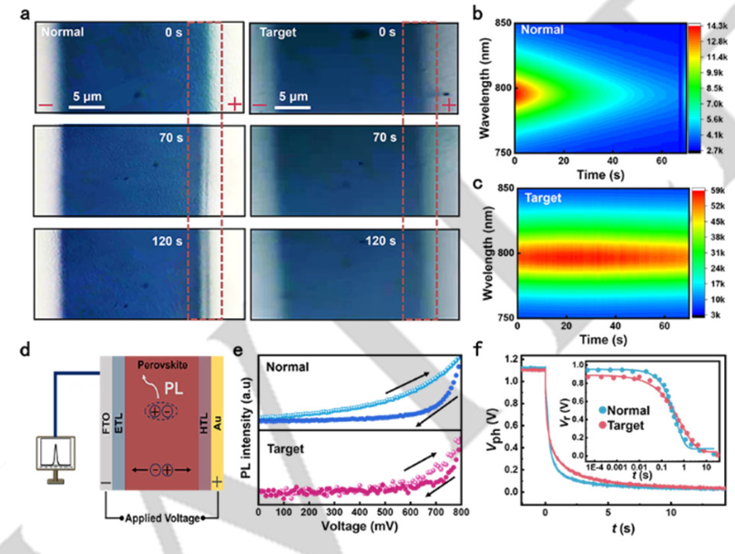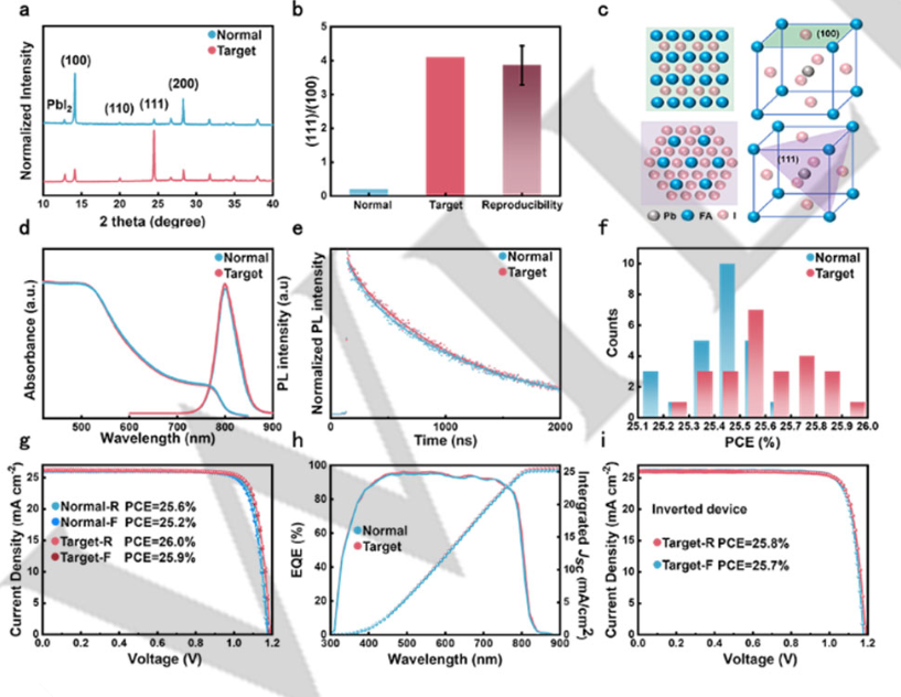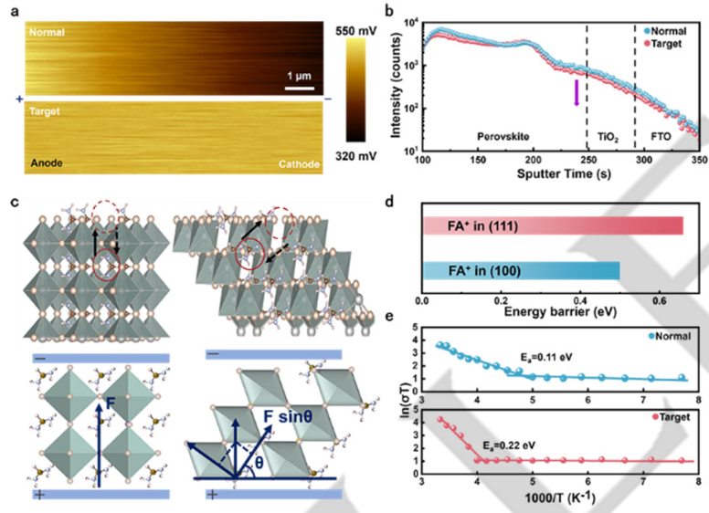 離(li)(li)子(zi)遷(qian)移(yi)(yi)是阻礙鈣鈦礦太陽能(neng)電池(chi)(PSCs)長(chang)期穩定性(xing)的(de)(de)(de)主(zhu)要問題。作(zuo)為金屬鹵(lu)化物鈣鈦礦材料的(de)(de)(de)固有(you)特(te)性(xing),離(li)(li)子(zi)遷(qian)移(yi)(yi)與原子(zi)排列和配位密(mi)切(qie)相關,這(zhe)(zhe)些(xie)是不(bu)同晶(jing)(jing)面的(de)(de)(de)基(ji)本特(te)征差(cha)異(yi)。在這(zhe)(zhe)里,華北電力(li)大學(xue)李(li)美成等人報道了(le)與晶(jing)(jing)面相關的(de)(de)(de)離(li)(li)子(zi)遷(qian)移(yi)(yi)問題,并(bing)通(tong)過精細調節晶(jing)(jing)面取(qu)向(xiang)來(lai)實現對(dui)鈣鈦礦中(zhong)離(li)(li)子(zi)遷(qian)移(yi)(yi)的(de)(de)(de)抑制。我(wo)們展(zhan)示了(le)(100)晶(jing)(jing)面比(111)晶(jing)(jing)面更容易(yi)受到陽離(li)(li)子(zi)的(de)(de)(de)遷(qian)移(yi)(yi)。遷(qian)移(yi)(yi)差(cha)異(yi)的(de)(de)(de)主(zhu)要原因(yin)是(111)晶(jing)(jing)面中(zhong)的(de)(de)(de)陽離(li)(li)子(zi)遷(qian)移(yi)(yi)路徑(jing)(jing)與(100)晶(jing)(jing)面中(zhong)的(de)(de)(de)路徑(jing)(jing)不(bu)同,這(zhe)(zhe)增(zeng)加(jia)(jia)了(le)活躍的(de)(de)(de)遷(qian)移(yi)(yi)能(neng)量,并(bing)削(xue)弱了(le)操(cao)(cao)作(zuo)期間電場(chang)的(de)(de)(de)貢獻。通(tong)過在抗(kang)溶劑中(zhong)添加(jia)(jia)水(H2O)的(de)(de)(de)簡單綠色方法,制備了(le)以(111)晶(jing)(jing)面為主(zhu)的(de)(de)(de)鈣鈦礦薄(bo)膜,進一步在常規平面PSCs上(shang)(shang)實現了(le)26.0%的(de)(de)(de)光(guang)電轉換效率(PCE,認證(zheng)值25.4%),在反向(xiang)PSCs上(shang)(shang)實現了(le)25.8%的(de)(de)(de)效率。此外,未封(feng)裝的(de)(de)(de)PSCs在模擬(ni)AM1.5光(guang)照下(xia)經過3500小時操(cao)(cao)作(zuo)后,仍能(neng)保持95%的(de)(de)(de)初始PCE。