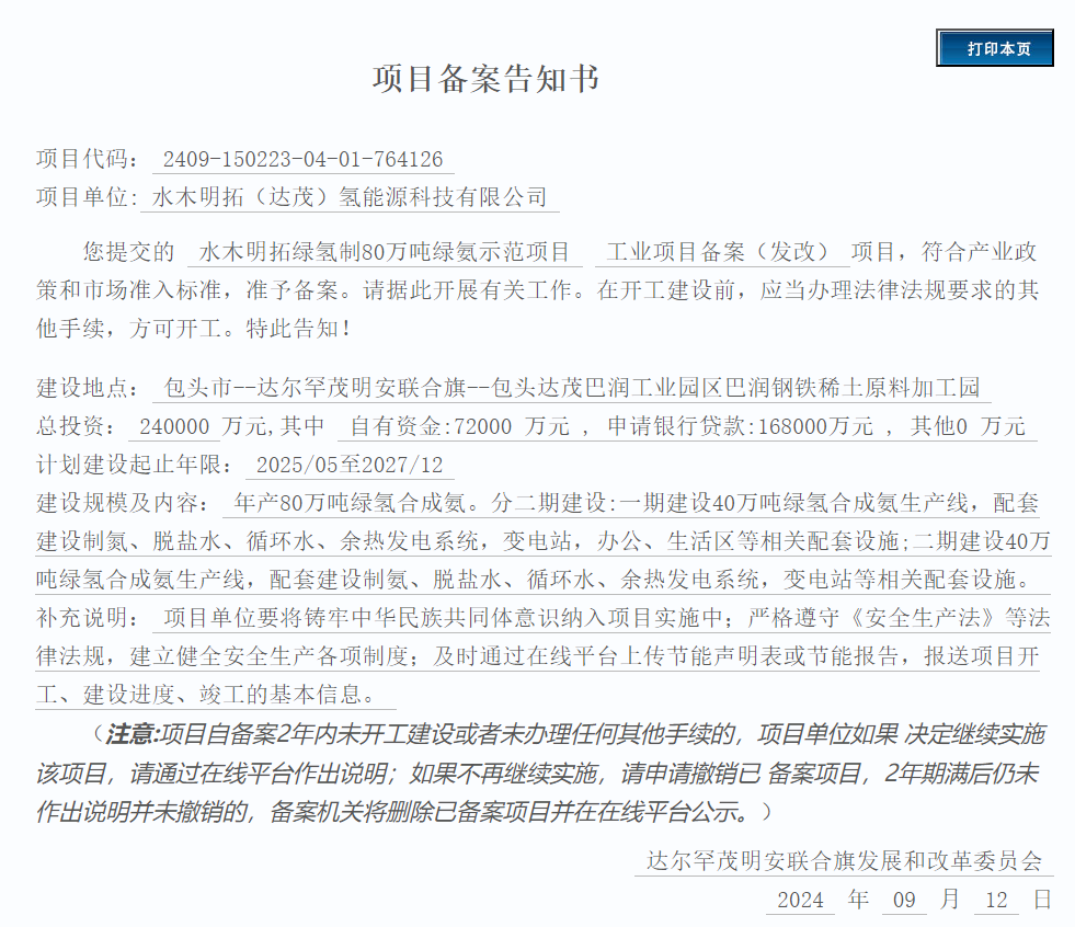 水木明拓包頭80萬噸綠氨項目獲批2024-09-14 13:01瀏覽數:178次