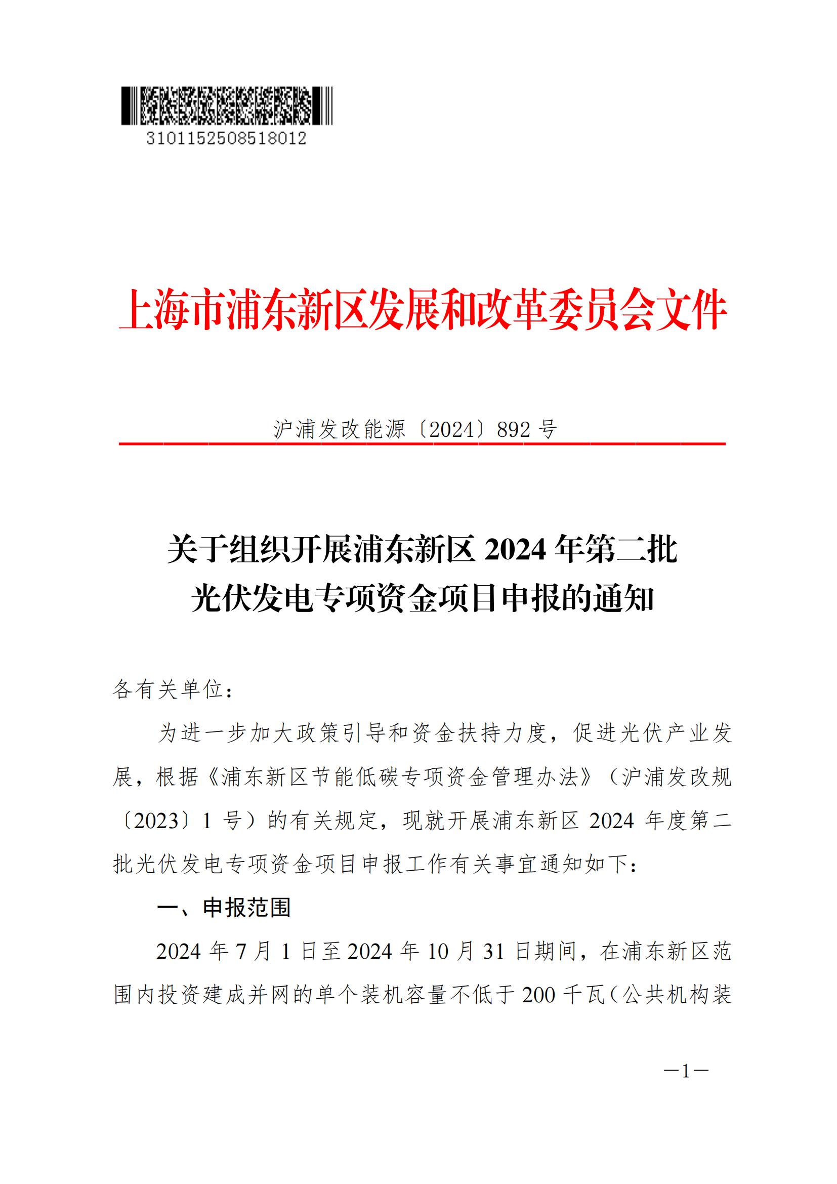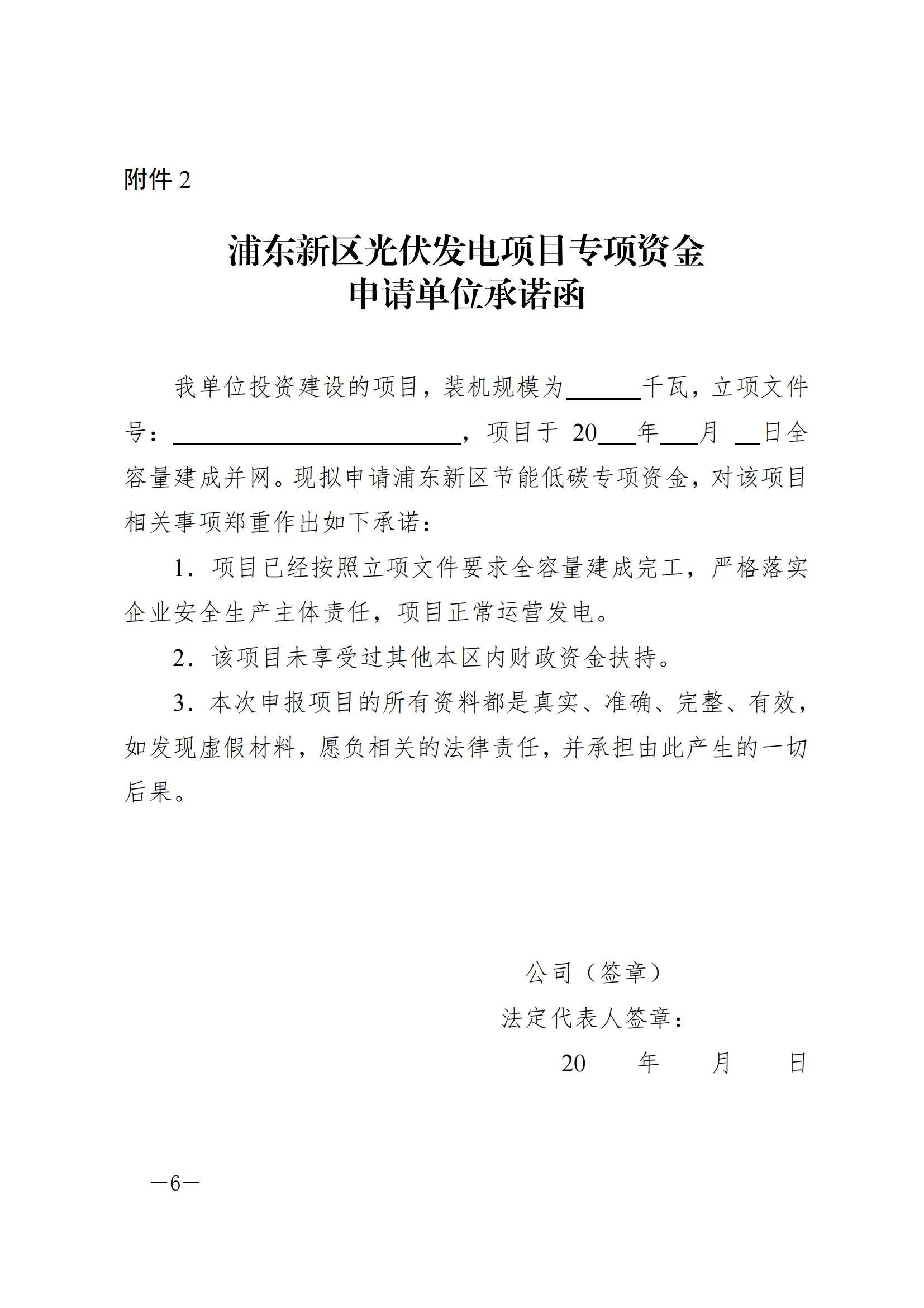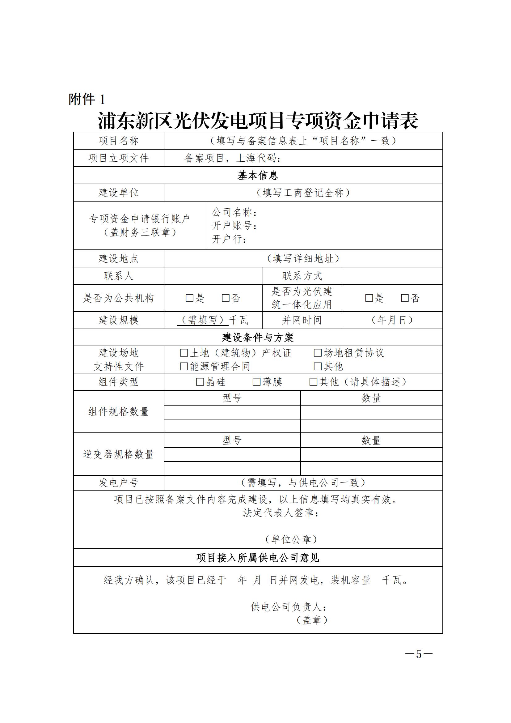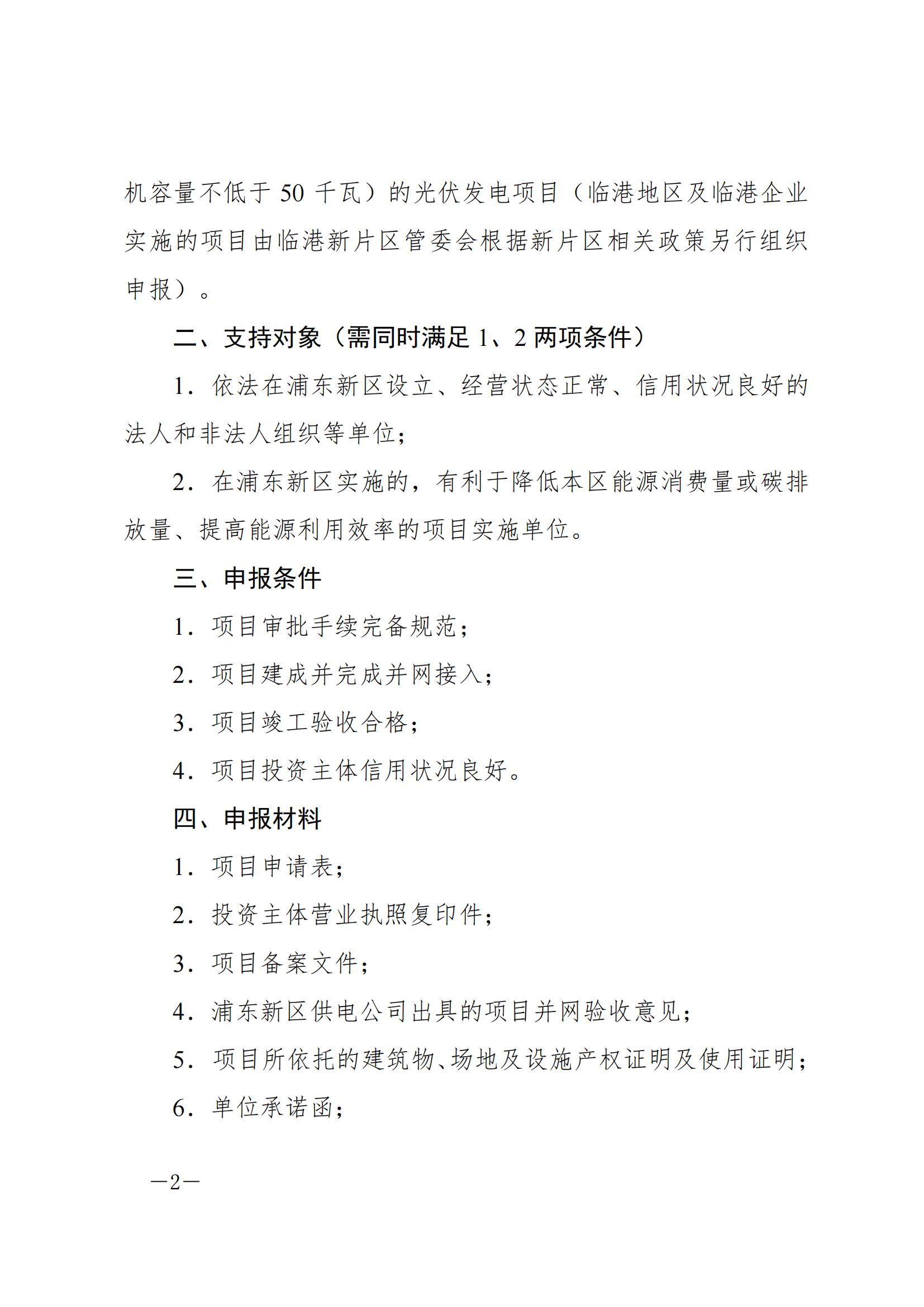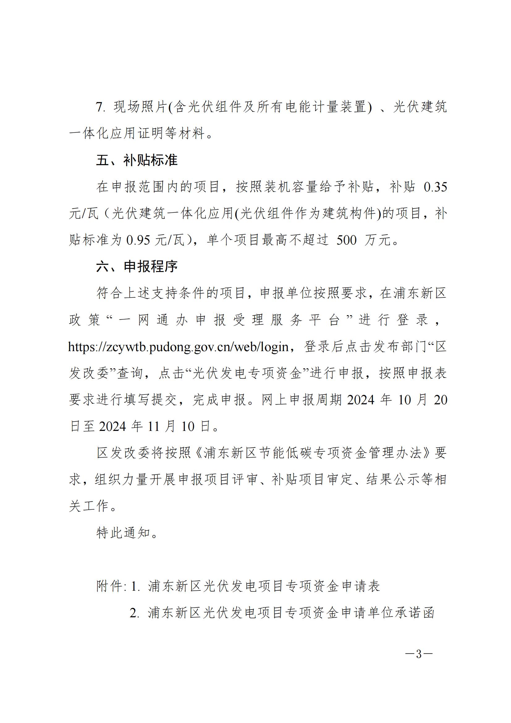 10月16日,上海市浦東新區發展和改革委員會發布關于組織開展浦東新區2024年第二批光伏發電專項資金項目申報的通知。文件指出,申報范圍為2024年7月1日至2024年10月31日期間,在浦東新區范圍內投資建成并網的單個裝機容量不低于200千瓦(公共機構裝機容量不低于50千瓦)的光伏發電項目(臨港地區及臨港企業實施的項目由臨港新片區管委會根據新片區相關政策另行組織申報)。 文件明確,在申報范圍內的項目,按照裝機容量給予補貼,補貼0.35元/瓦(光伏建筑一體化應用(光伏組件作為建筑構件)的項目,補貼標準為0.95元/瓦),單個項目最高不超過500萬元。 原文如下: 關于組織開展浦東新區2024年第二批光伏發電專項資金項目申報的通知 滬浦發改能源〔2024〕0892號 各有關單位: 為進一步加大政策引導和資金扶持力度,促進光伏產業發展,根據《浦東新區節能低碳專項資金管理辦法》(滬浦發改規〔2023〕1號)的有關規定,現就開展浦東新區2024年度第二批光伏發電專項資金項目申報工作有關事宜通知如下: 一、申報范圍 2024年7月1日至2024年10月31日期間,在浦東新區范圍內投資建成并網的單個裝機容量不低于200千瓦(公共機構裝機容量不低于50千瓦)的光伏發電項目(臨港地區及臨港企業實施的項目由臨港新片區管委會根據新片區相關政策另行組織申報)。 二、支持對象(需同時滿足1、2兩項條件) 1.依法在浦東新區設立、經營狀態正常、信用狀況良好的法人和非法人組織等單位; 2.在浦東新區實施的,有利于降低本區能源消費量或碳排放量、提高能源利用效率的項目實施單位。 三、申報條件 1.項目審批手續完備規范; 2.項目建成并完成并網接入; 3.項目竣工驗收合格; 4.項目投資主體信用狀況良好。 四、申報材料 1.項目申請表; 2.投資主體營業執照復印件; 3.項目備案文件; 4.浦東新區供電公司出具的項目并網驗收意見; 5. 項目所依托的建筑物、場地及設施產權證明及使用證明; 6.單位承諾函; 7. 現場照片(含光伏組件及所有電能計量裝置) 、光伏建筑一體化應用證明等材料。 五、補貼標準 在申報范圍內的項目,按照裝機容量給予補貼,補貼0.35元/瓦(光伏建筑一體化應用(光伏組件作為建筑構件)的項目,補貼標準為0.95元/瓦),單個項目最高不超過500萬元。 六、申報程序 符合上述支持條件的項目,申報單位按照要求,在浦東新區政策“一網通辦申報受理服務平臺”進行登錄,//zcywtb.pudong.gov.cn/web/login,登錄后點擊發布部門“區發改委”查詢,點擊“光伏發電專項資金”進行申報,按照申報表要求進行填寫提交,完成申報。網上申報周期2024年10月20日至2024年11月10日。 區發改委將按照《浦東新區節能低碳專項資金管理辦法》要求,組織力量開展申報項目評審、補貼項目審定、結果公示等相關工作。 特此通知。 附件: 1. 浦東新區光伏發電項目專項資金申請表 2. 浦東新區光伏發電項目專項資金申請單位承諾函 聯系人:吳華東、鄭偉偉 聯系電話:28282582、58788388-63320 平臺服務熱線:20231080-823 聯系地址:上海市浦東新區世紀大道2001號3號樓321室 上海市浦東新區發展和改革委員會 2024年10月16日
